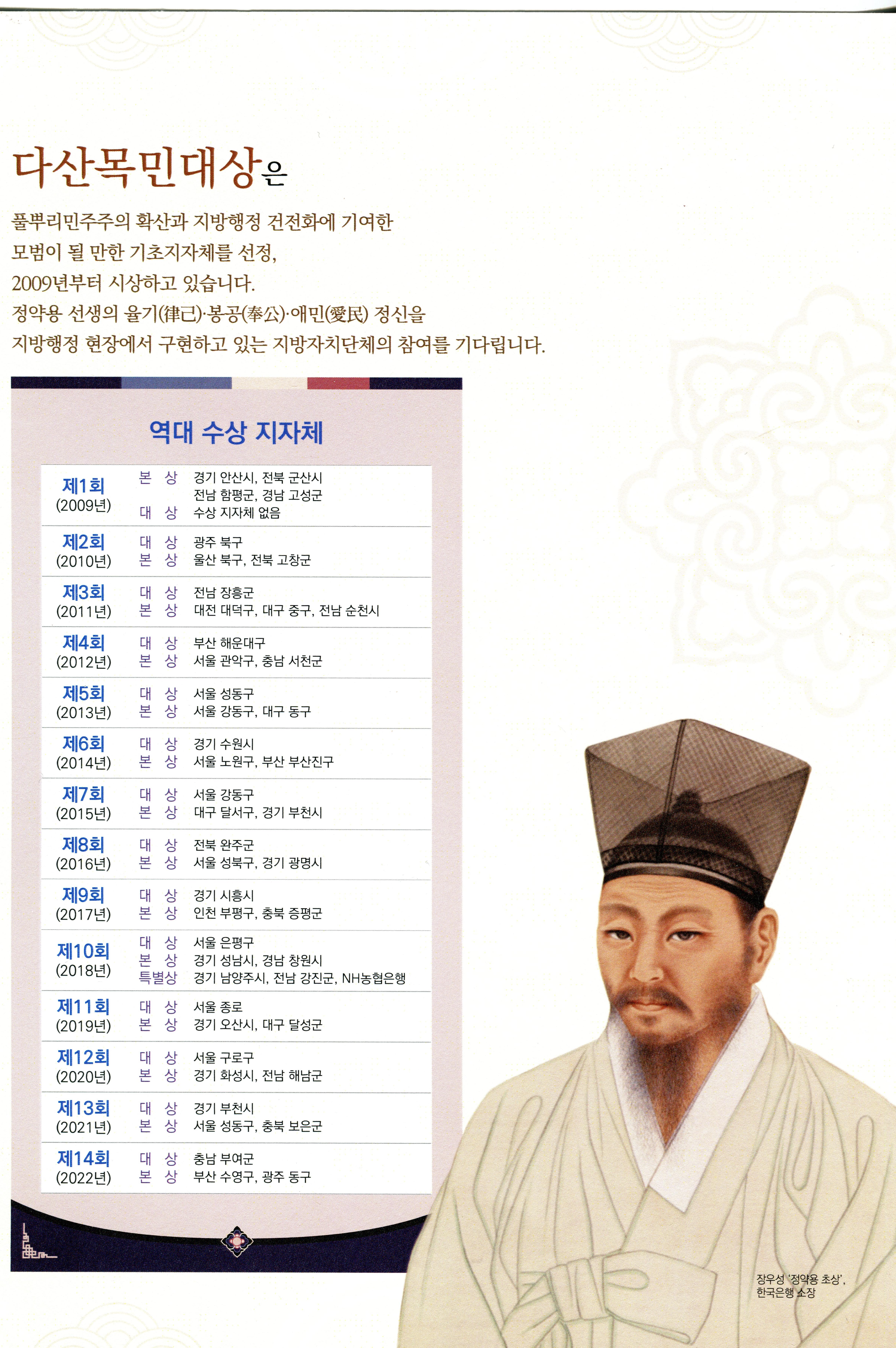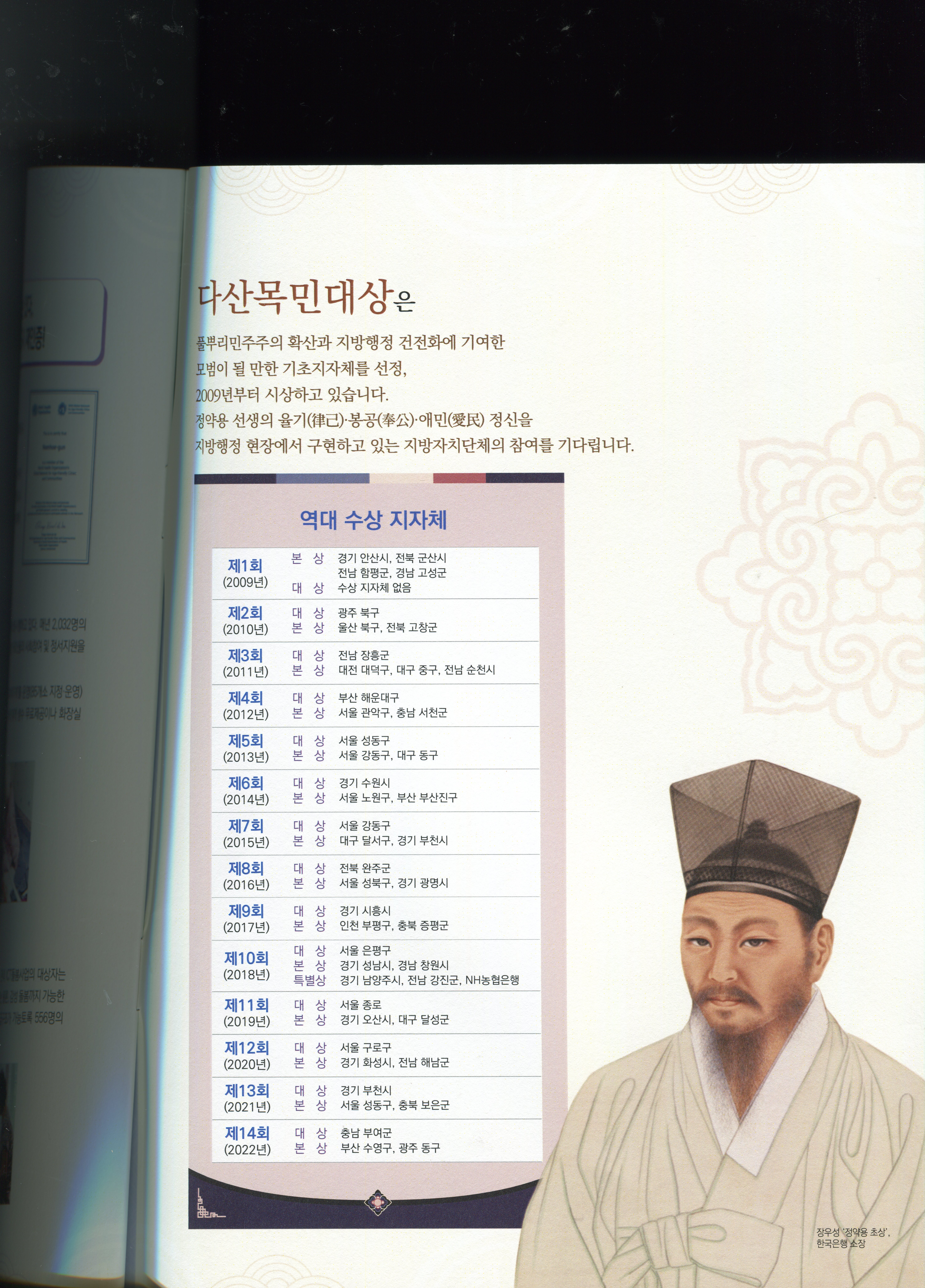 다산목민대상은 다산 정약용 선생의 정신을 본받아 모범적이고 창의적인 지방행정을 구현하는 기초자치단체에 주는 가장 권위 있는 상으로, 지난 2009년부터 매년 수여하고 있다. 올해 3월부터 7월까지 3단계의 엄정한 심사과정을 거쳤으며, 안양시는 율기(律己)·봉공(奉公)·애민(愛民) 등 3개 분야, 10개 지표에서 고르게 높은 점수를 받았다.