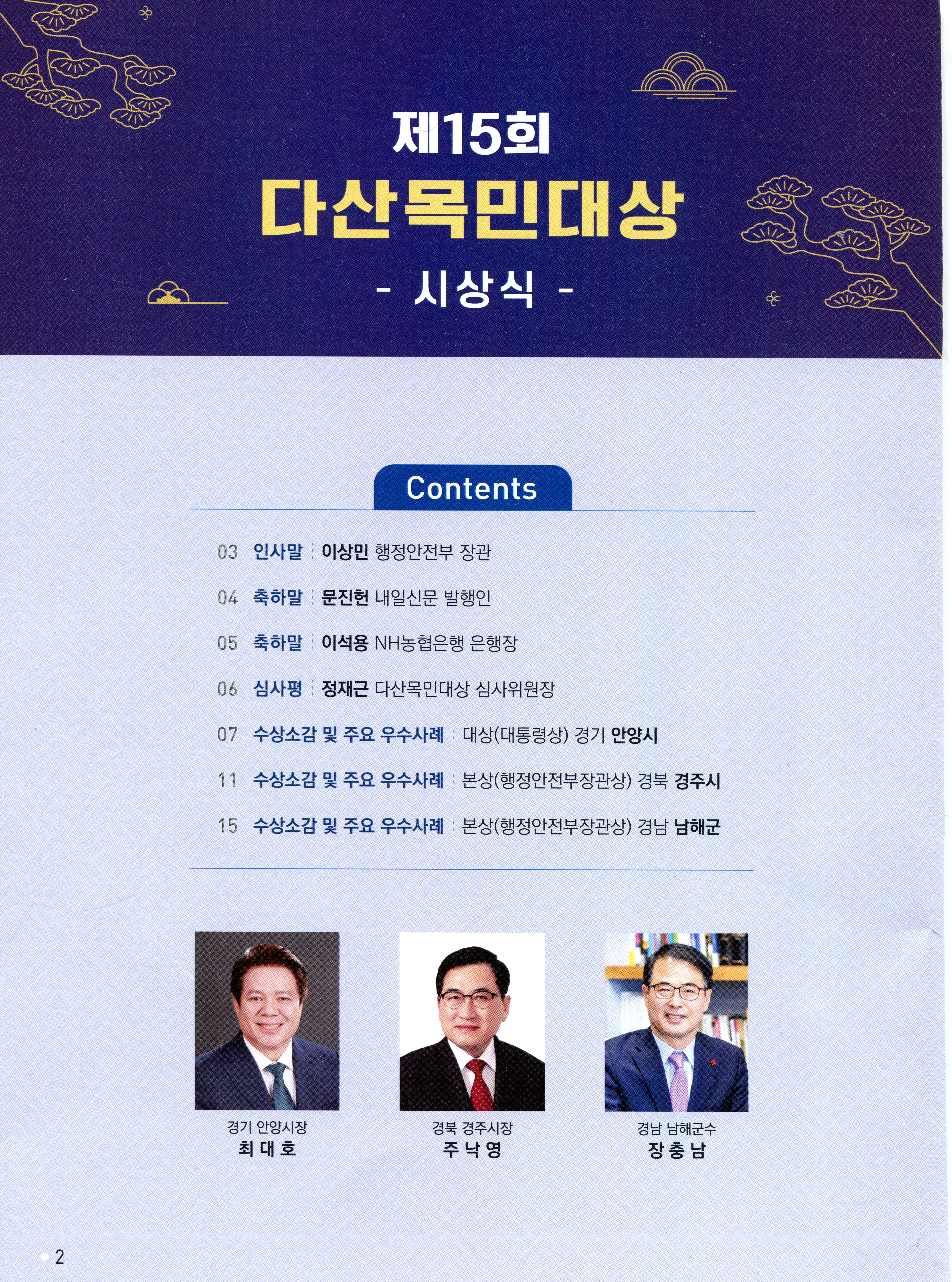 안양가 ‘제15회 다산목민대상’에서 대상(대통령상)을 받았다. 시는 행정안전부 주최로 지난 10일 오후 정부세종청사에서 열린 시상식에서 대상을 수상하고, 특별교부세 1억5000만원과 상금 2000만원을 받게됐다.