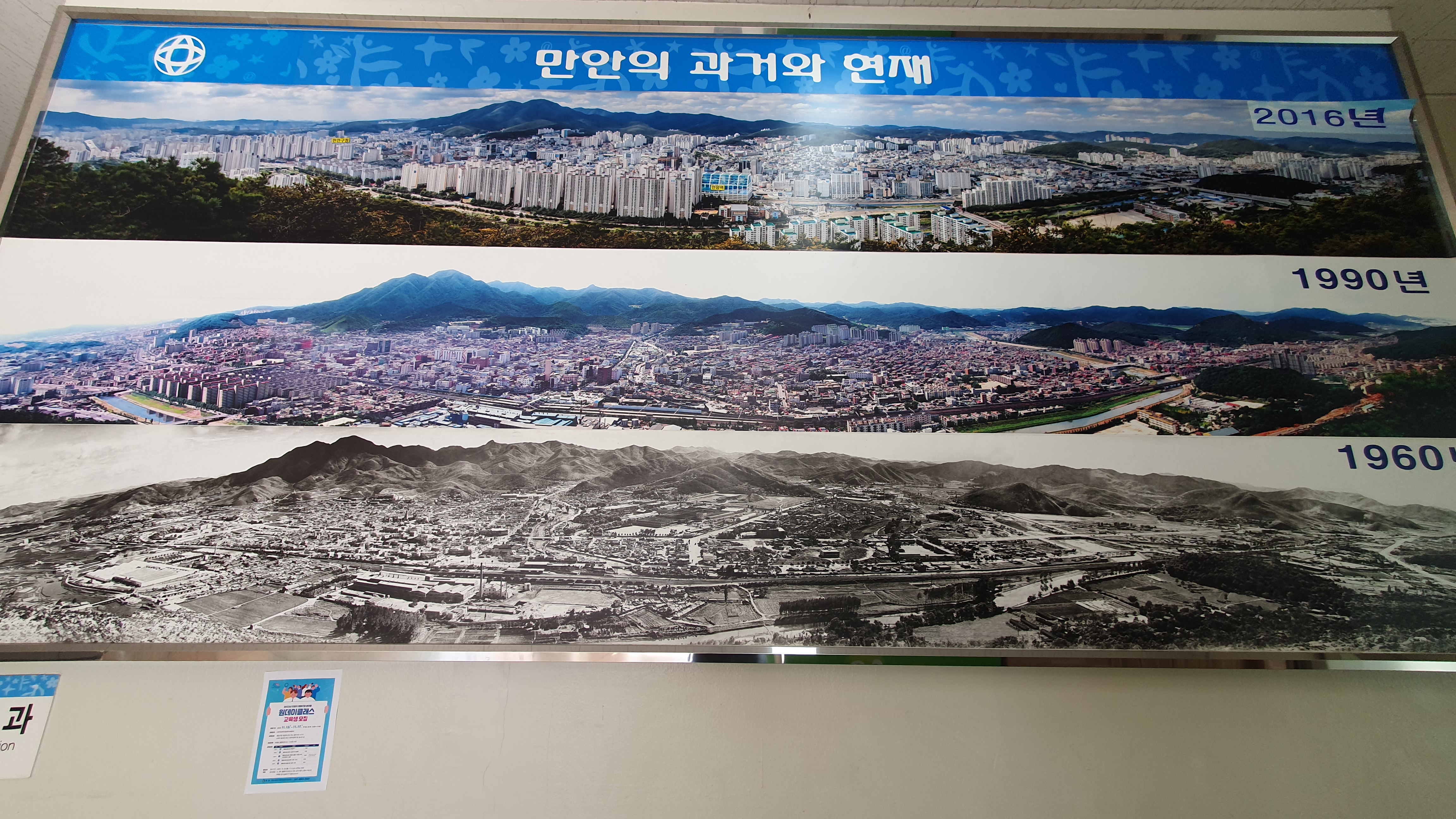 2023.11.14/ #도시기록 #만안구청 #옛사진/ 만안구청 1층 홀 벽면에 부착된 안양의 과거와 현재 사진 비교. 1960년대-1990년대-2016년 만안구 원도심의 모습. 산과 물길. 마을과 동네를 볼수 있다.