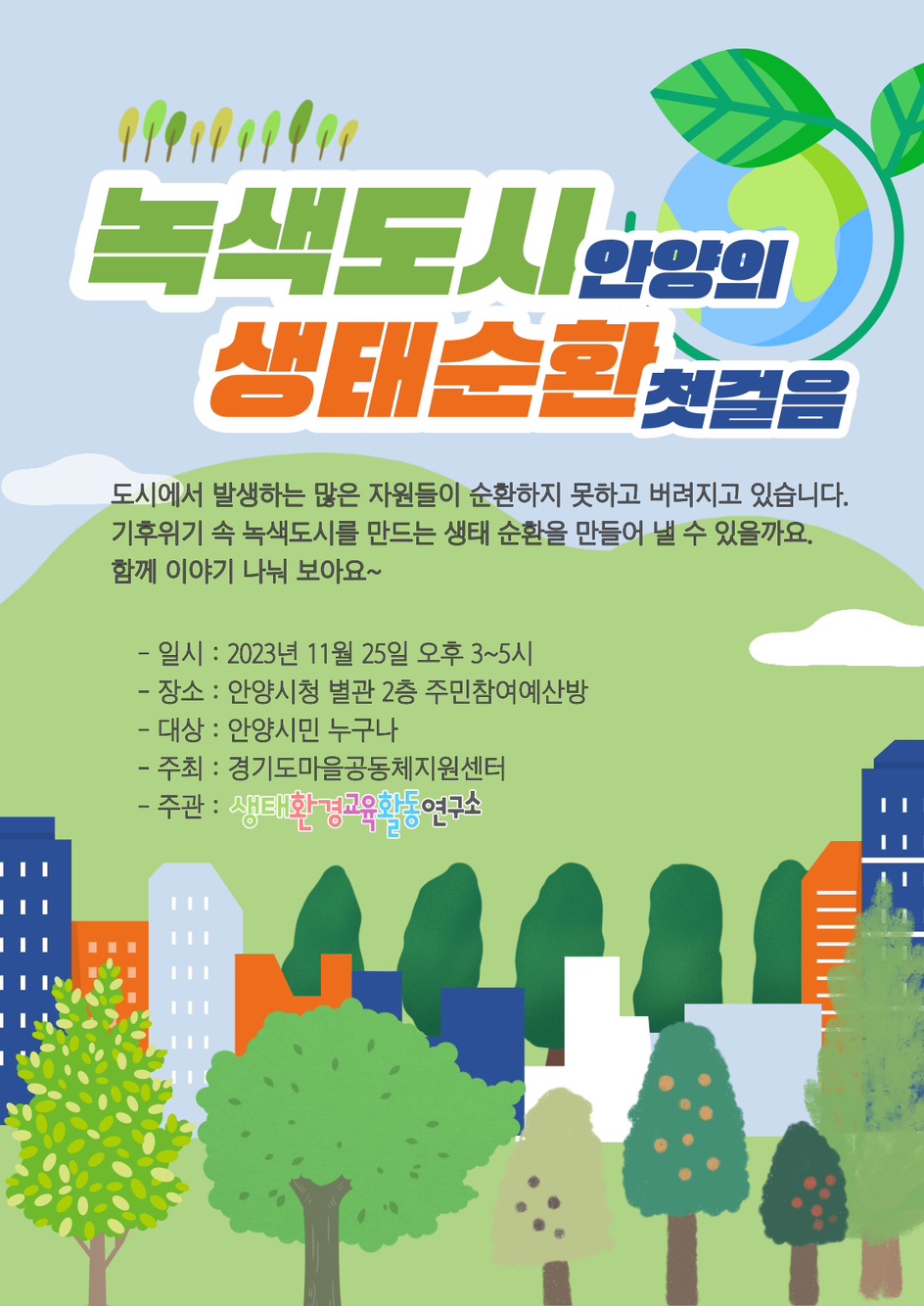 기후위기가 심각한 이 시기에도 도시에서는 다양하게 발생하는 자원들이 순환하지 못하고 버려지는 일이 대부분이다. 재활용이 가능한 음식쓰레기나 숲이나 가로수에서 나오는 나무의 나뭇가지나 낙엽 등의 자연 부산물이 거의 버려져 탄소를 발생시키고 있다. 이에 도시와 도시민들의 관심과 대안 활동에 대한 욕구가 늘어나고 있다. 이에 부응해 안양의 자연 자원이 도시에서 순환할 수 있을지에 대한 시민 공론장이다.