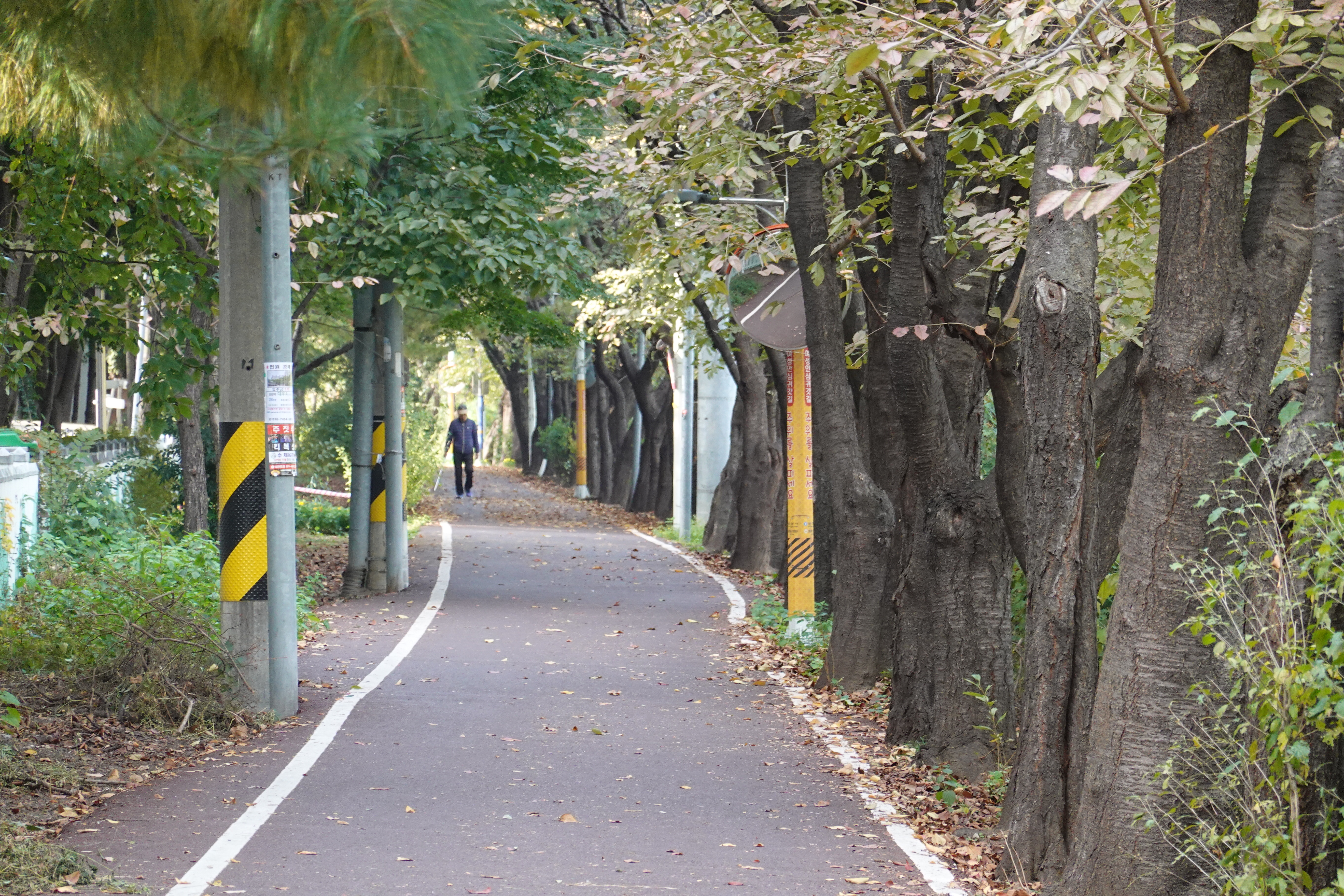 2023.11.18/ #도시기록 #가로수길 #안양2동/ 안양2동 안양천과 경남아너스빌 중간에 위치한 뚝방 사잇길. 1년 사계절 너무 예쁜길. 얼마전 SNS 페이스북에는 저 고즈녁한 길에 너구리가 나타나 어슬렁거리며 산보하다 사라졌다는 목격담과 사진이 올라오기도 했다.