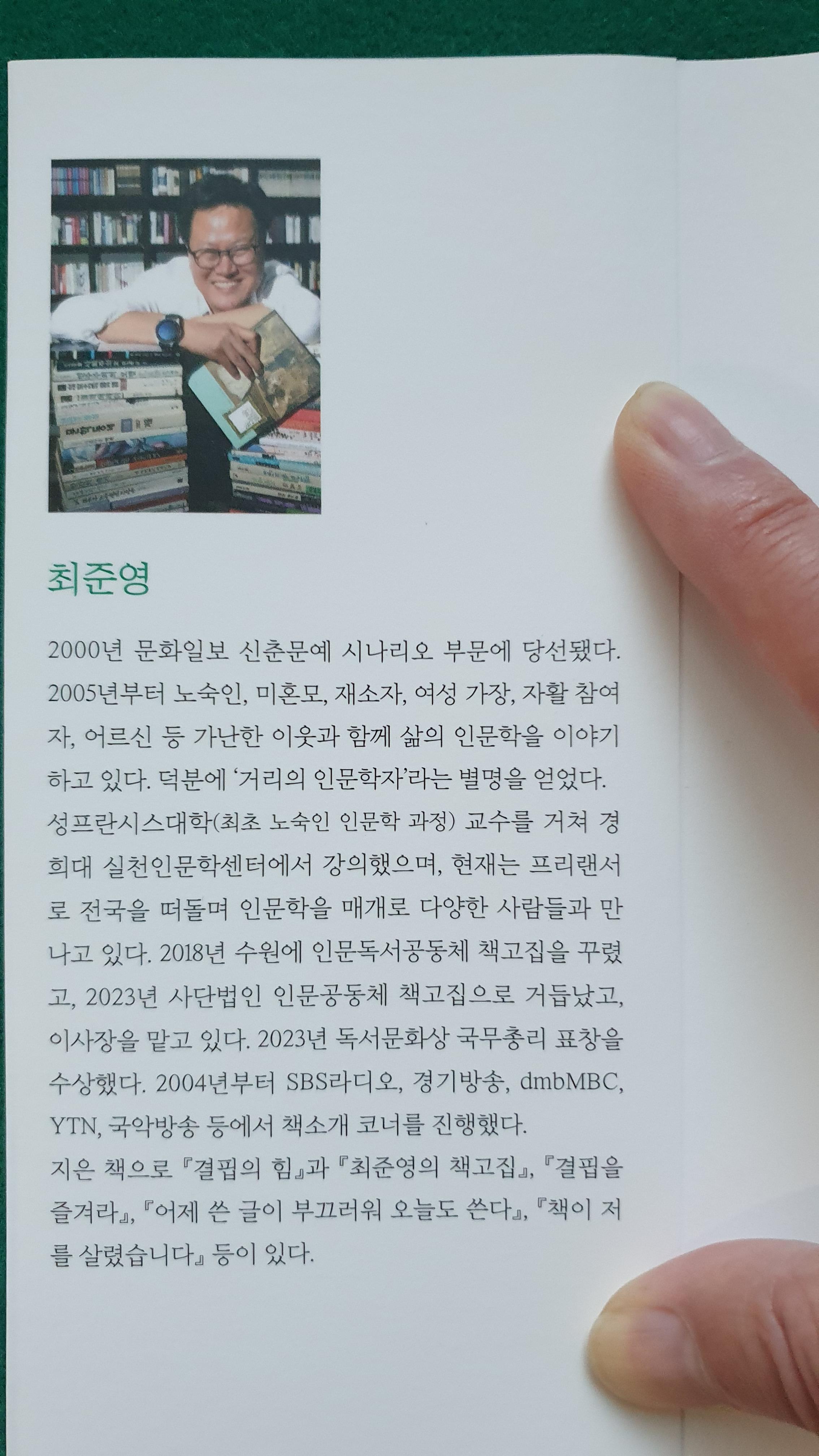거리의 인문학자'로 불리는 최 작가는 지난 20여 년 동안 전국 노숙인 시설과 지역자활지원센터, 미혼모 시설, 교도소에서 인문학 강좌를 200회 이상 진행하며 소외계층과 동행하고 있다.