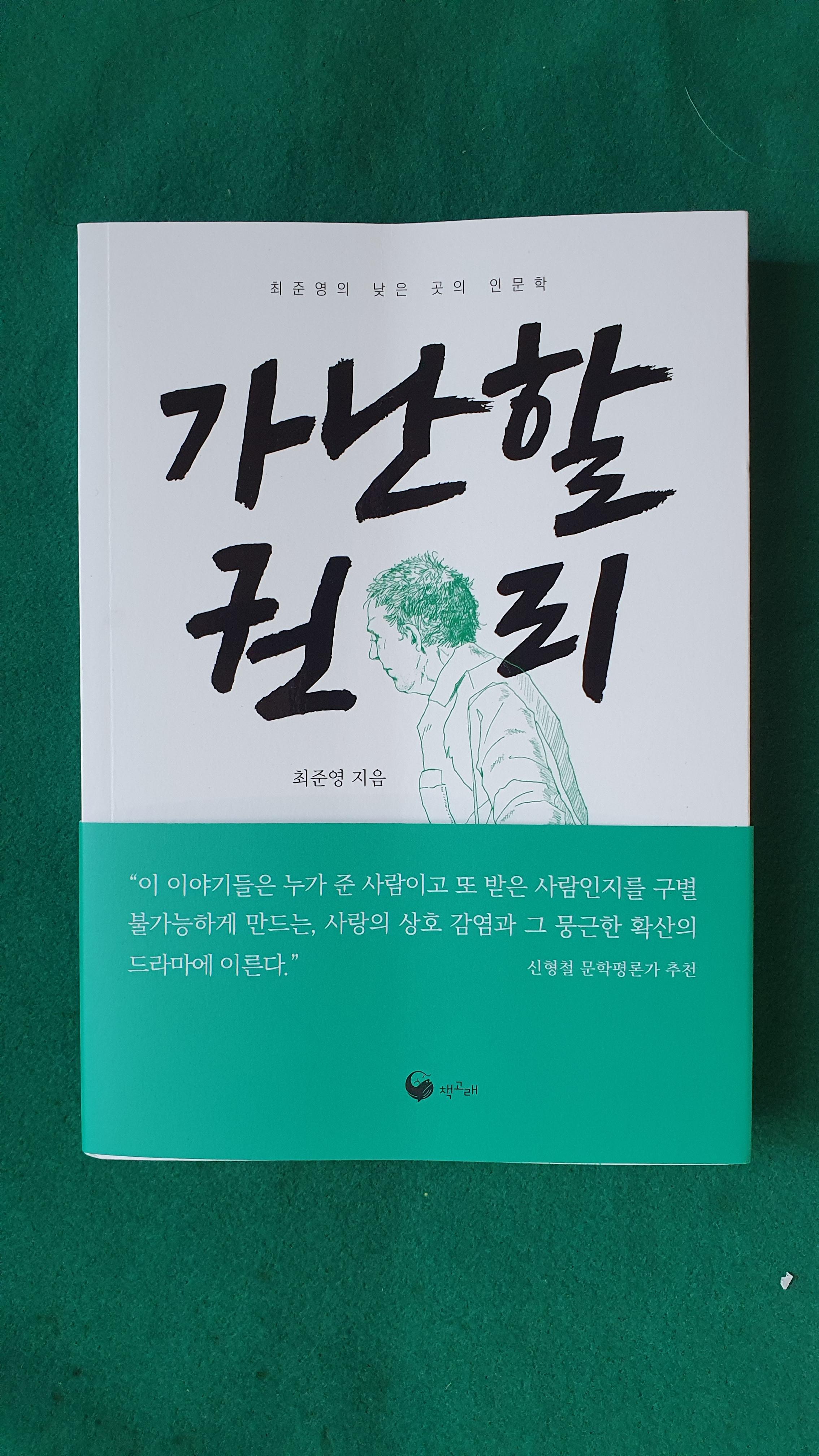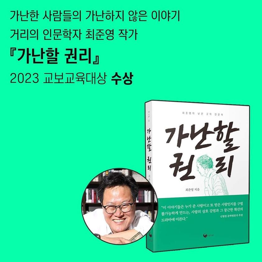 귀한책 한권을 받았습니다. 제29회 독서문화진흥 유공 국무총리 상을 수상한 거리의 인문학자로 수원에서 <책고집>을 운영하는 최준영 작가의 신작 <가난할 권리>
