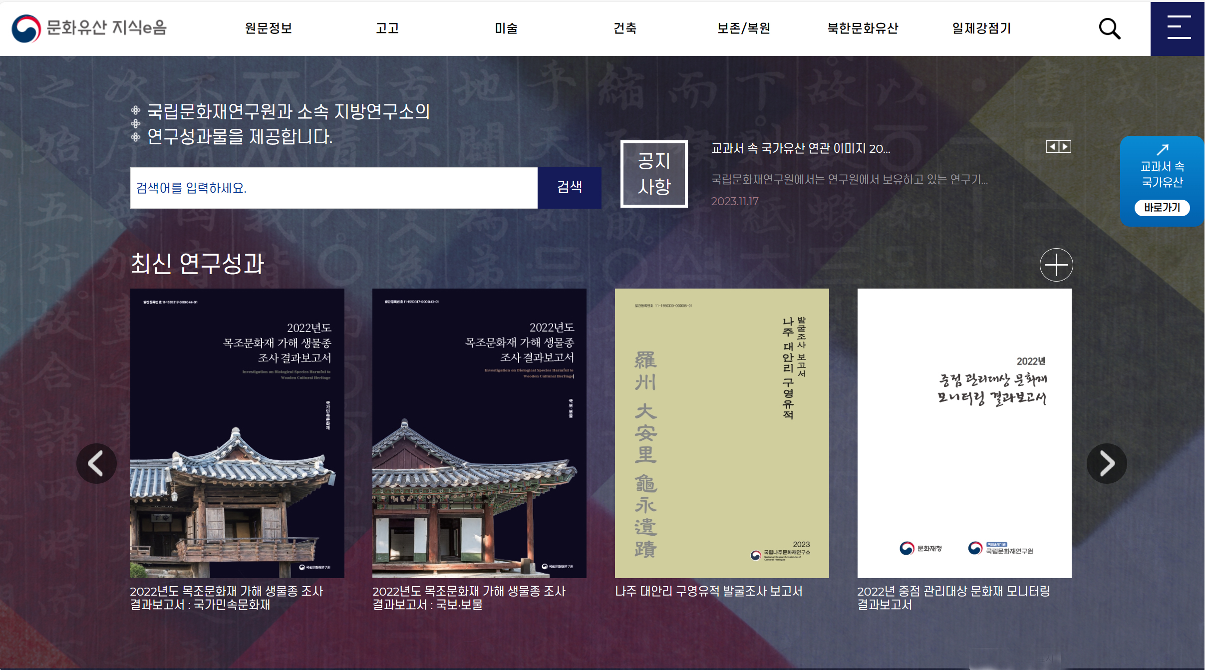 문화재청 국립문화재연구원은 연구원에서 보유하고 있는 연구기록물 200선을 초·중·고등 학습 자료로 다양하게 활용될 수 있도록 2023년11월 문화유산 지식e음 누리집에 공개한다.