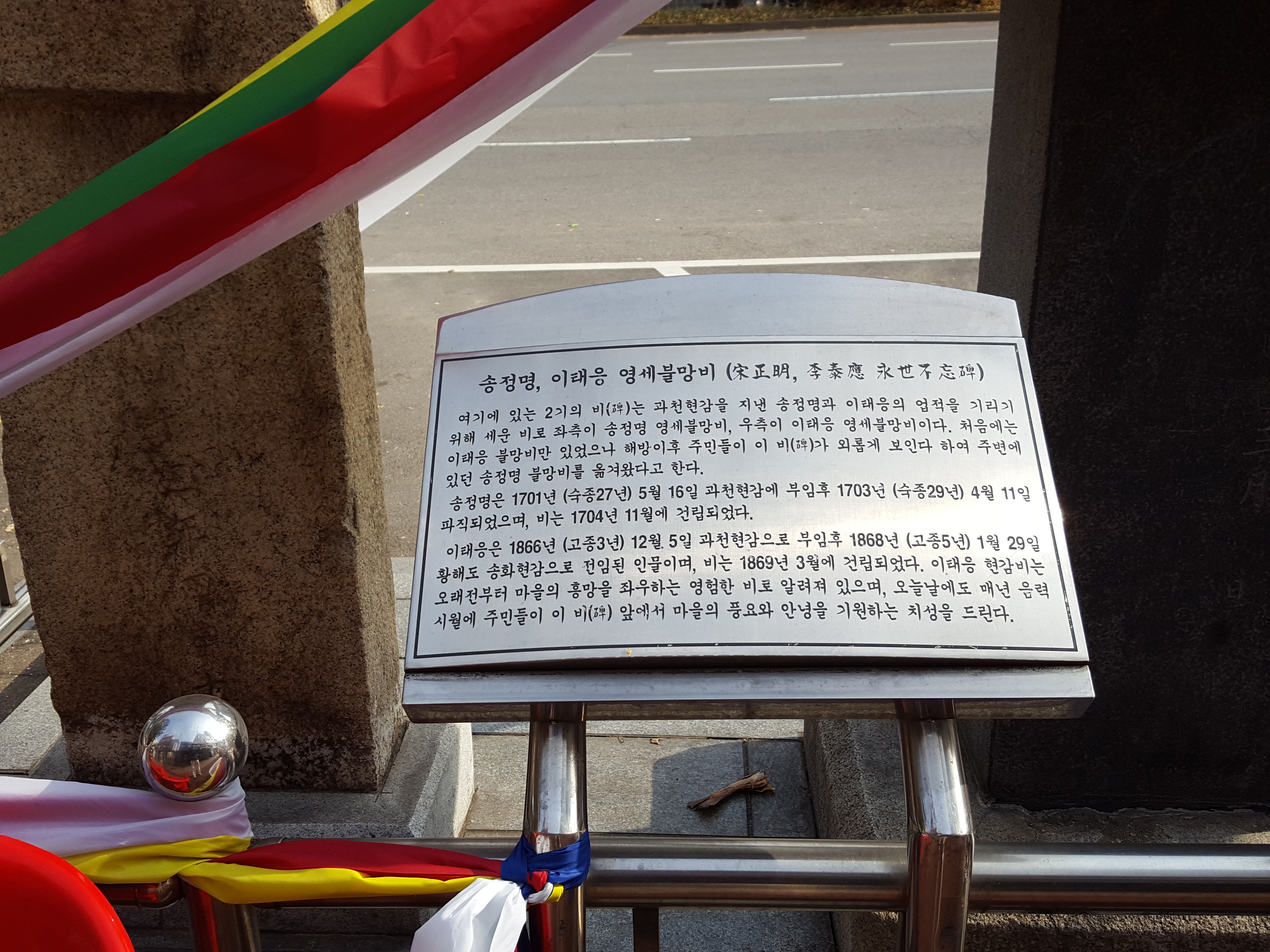 인덕원마을 당제의 주인공인 현감 비석을 살펴보면 과천 현감을 지낸 송정명과 이태응의 업적을 기리기 위한 두 개의 영세불망비이고 좌측에는 1701년(숙종 27년, 5월)에 과천 현감으로 부임한 송정명과 우측에는 1866년(고종 3년, 12월)에 과천 현감을 지낸 이태응의 영세불망비이다.