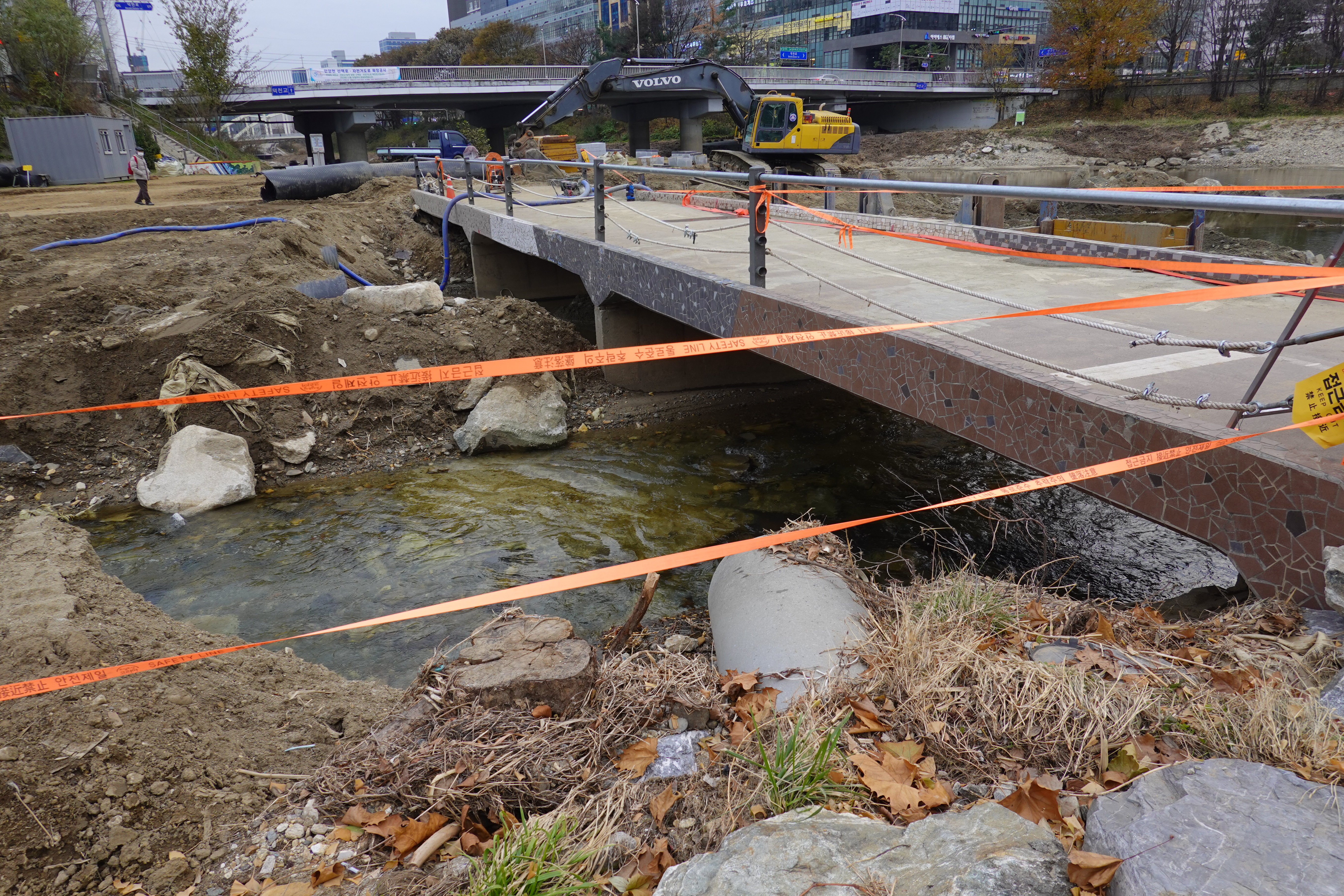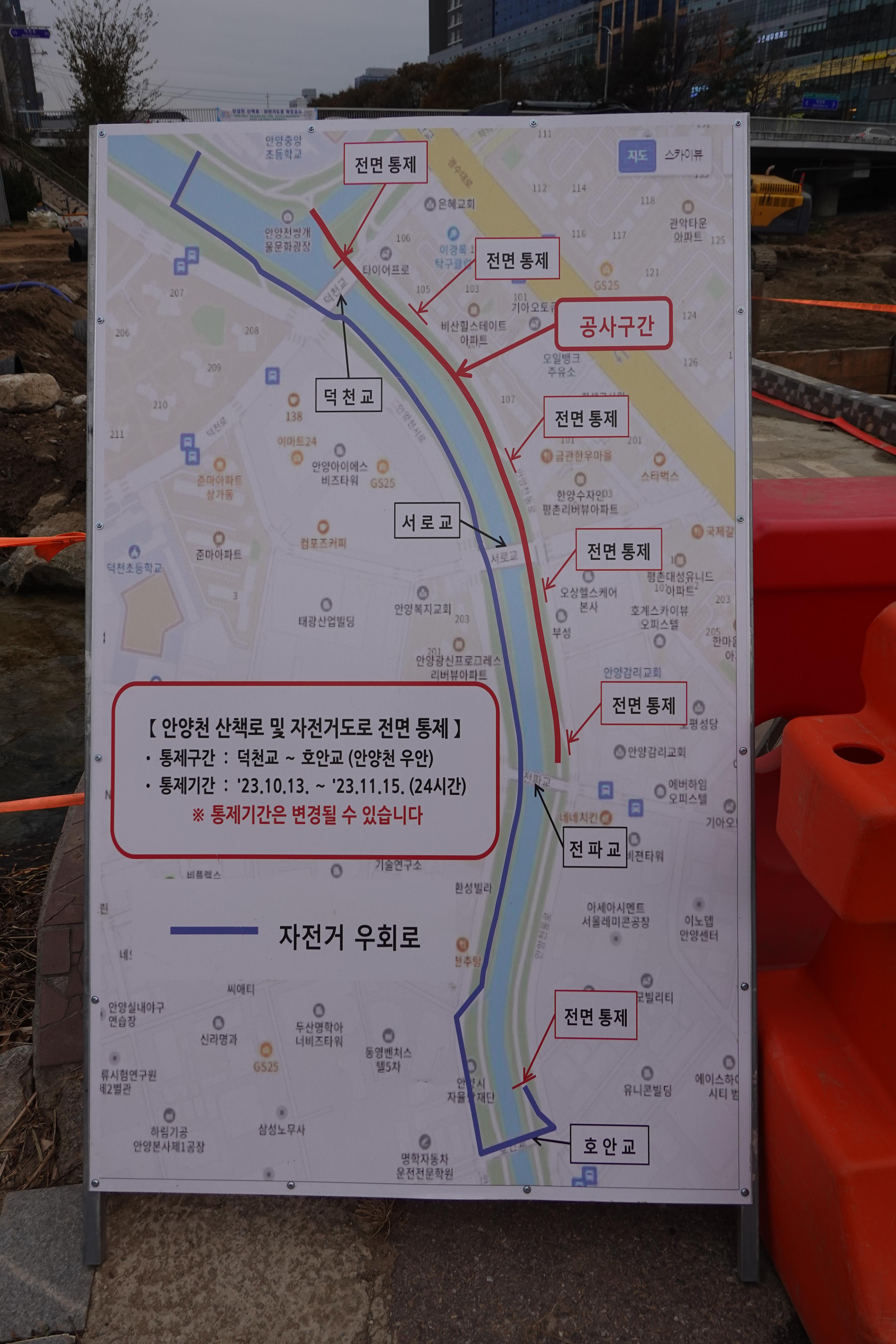 2023.11.26/ #도시기록 #안양천 #공사중/ 안양천 산책로.자전거도로 확장공사로 쌍개울에서 군포방향 안양천 동쪽길 통행금지. 쌍개울 학의천다리부터 안양천 호안교까지 전면 통제중으로 서쪽길로 우회해야 한다.