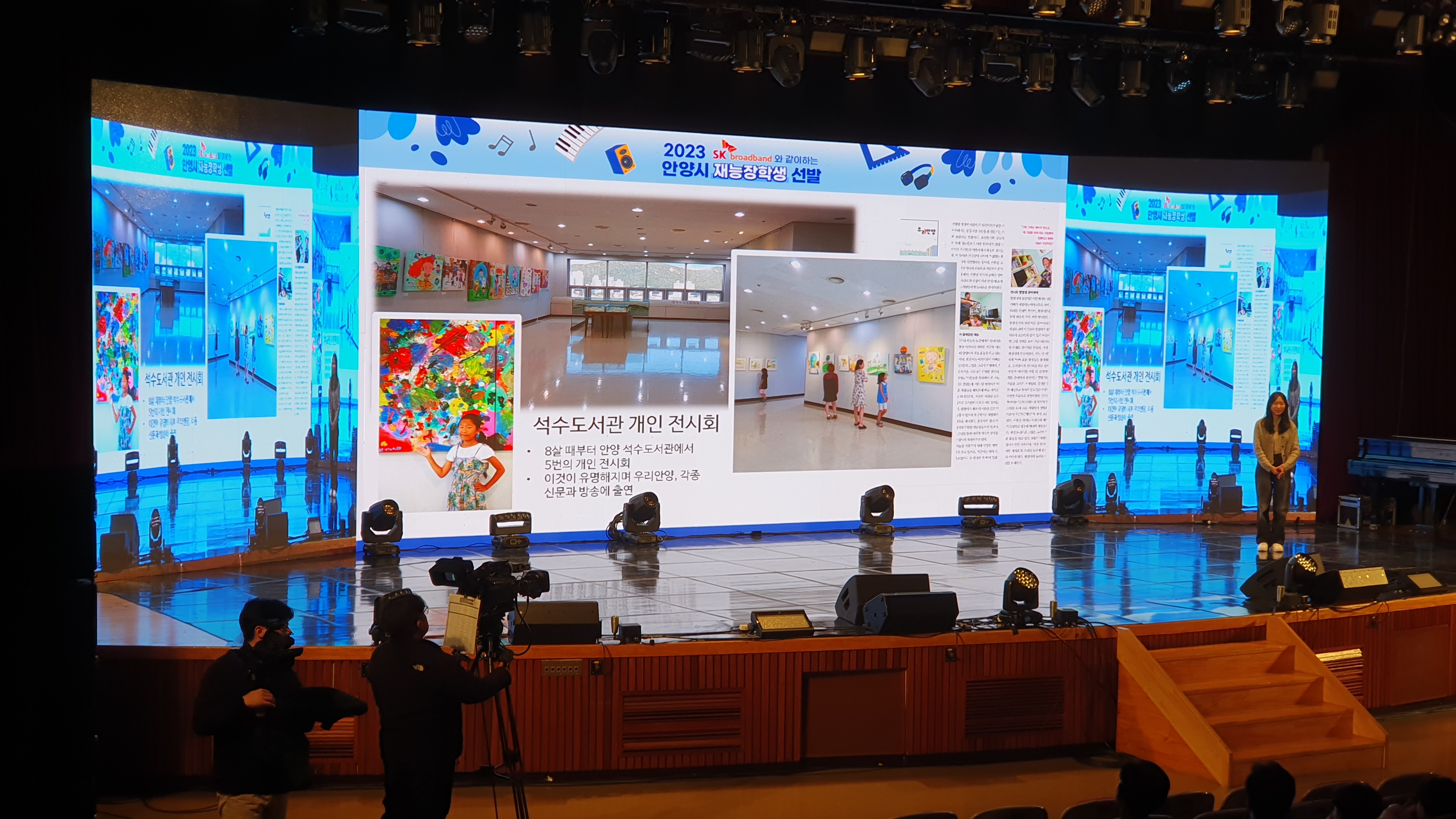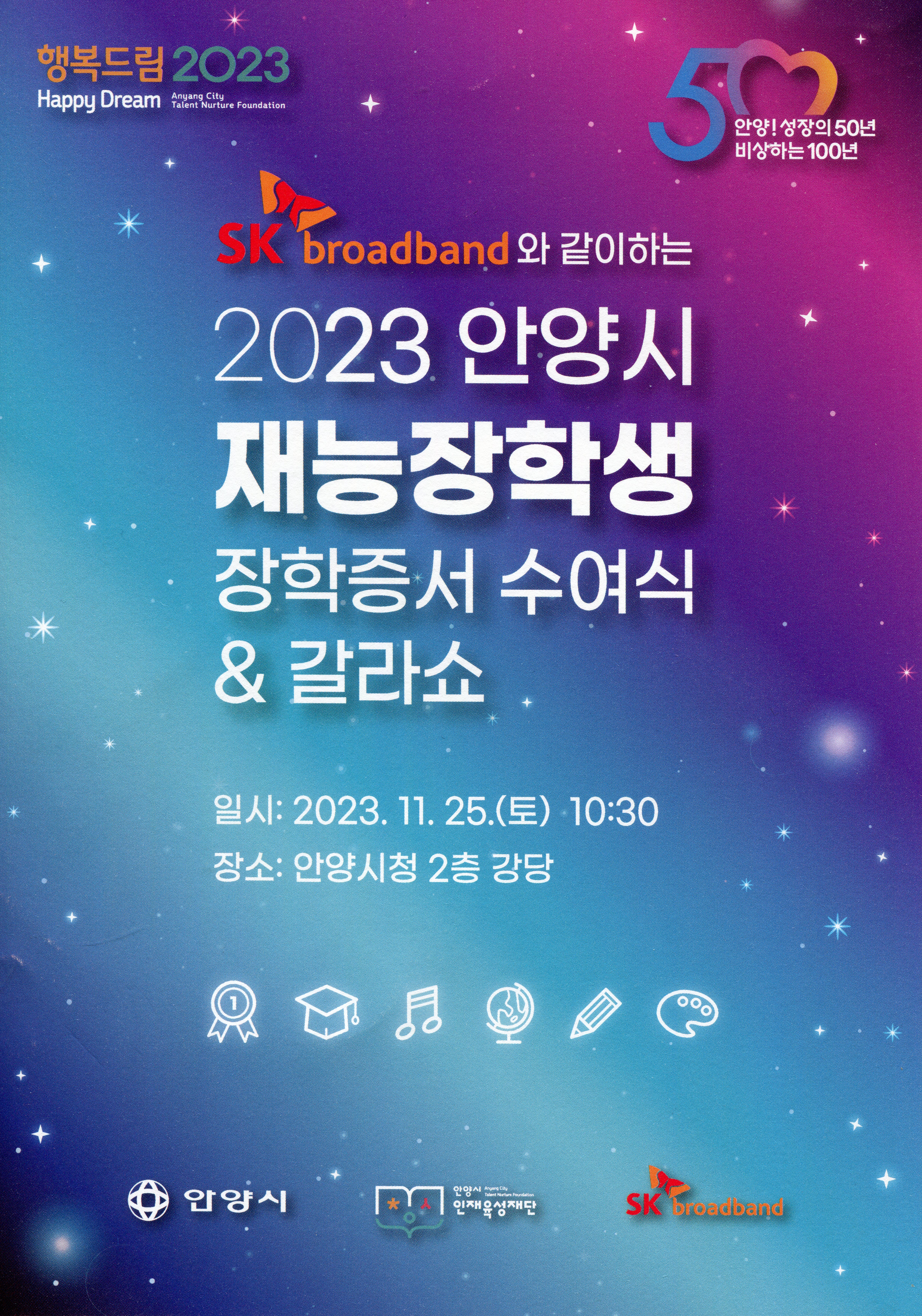 안양시인재육성장학재단은 지난 11월 25일 시청 강당에서 ‘2023 안양시 재능장학생 장학증서 수여식 및 갈라쇼’를 SK브로드밴드와 협업하여 개최하고 오디션 및 갈라쇼 영상을 방송으로 송출했다.