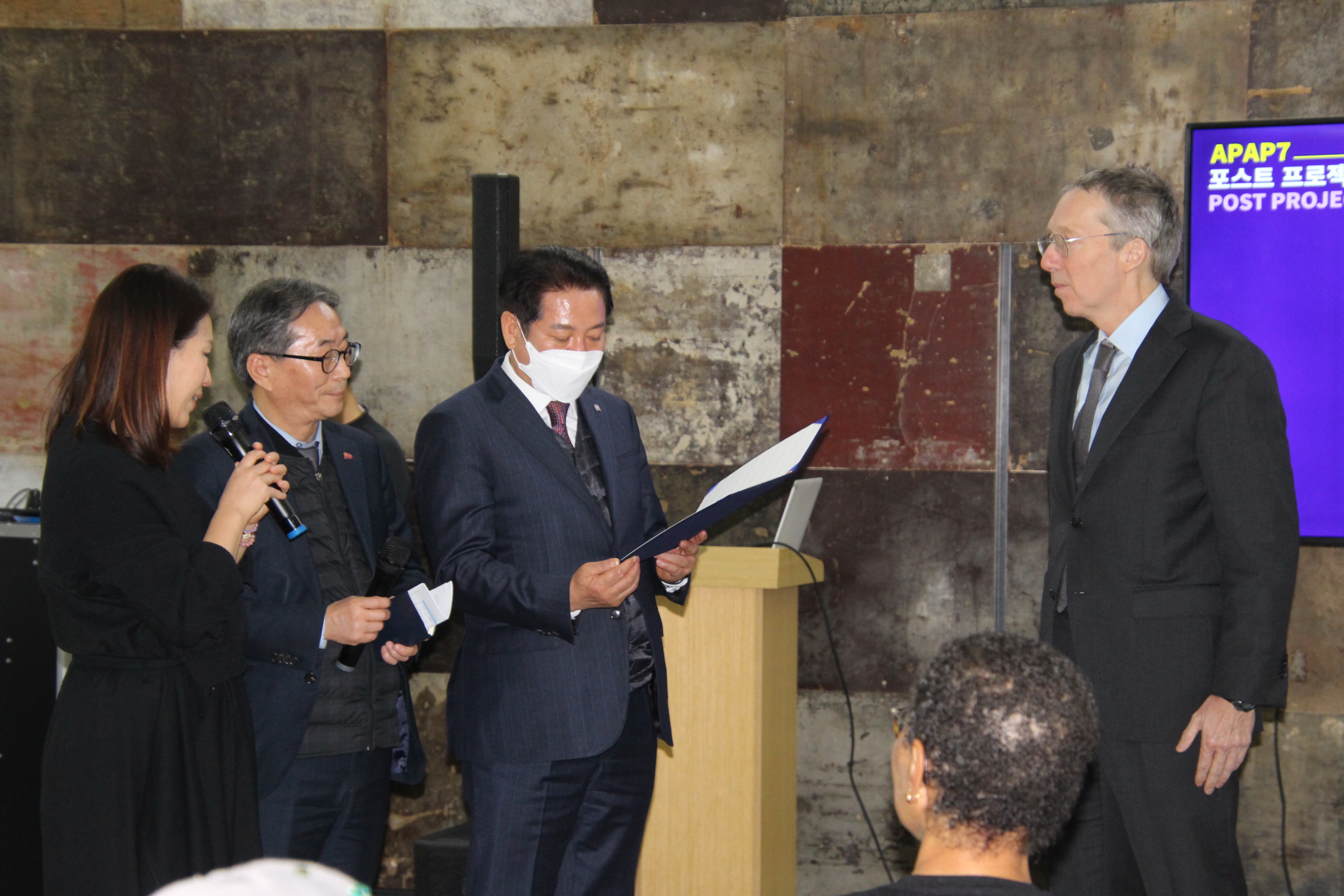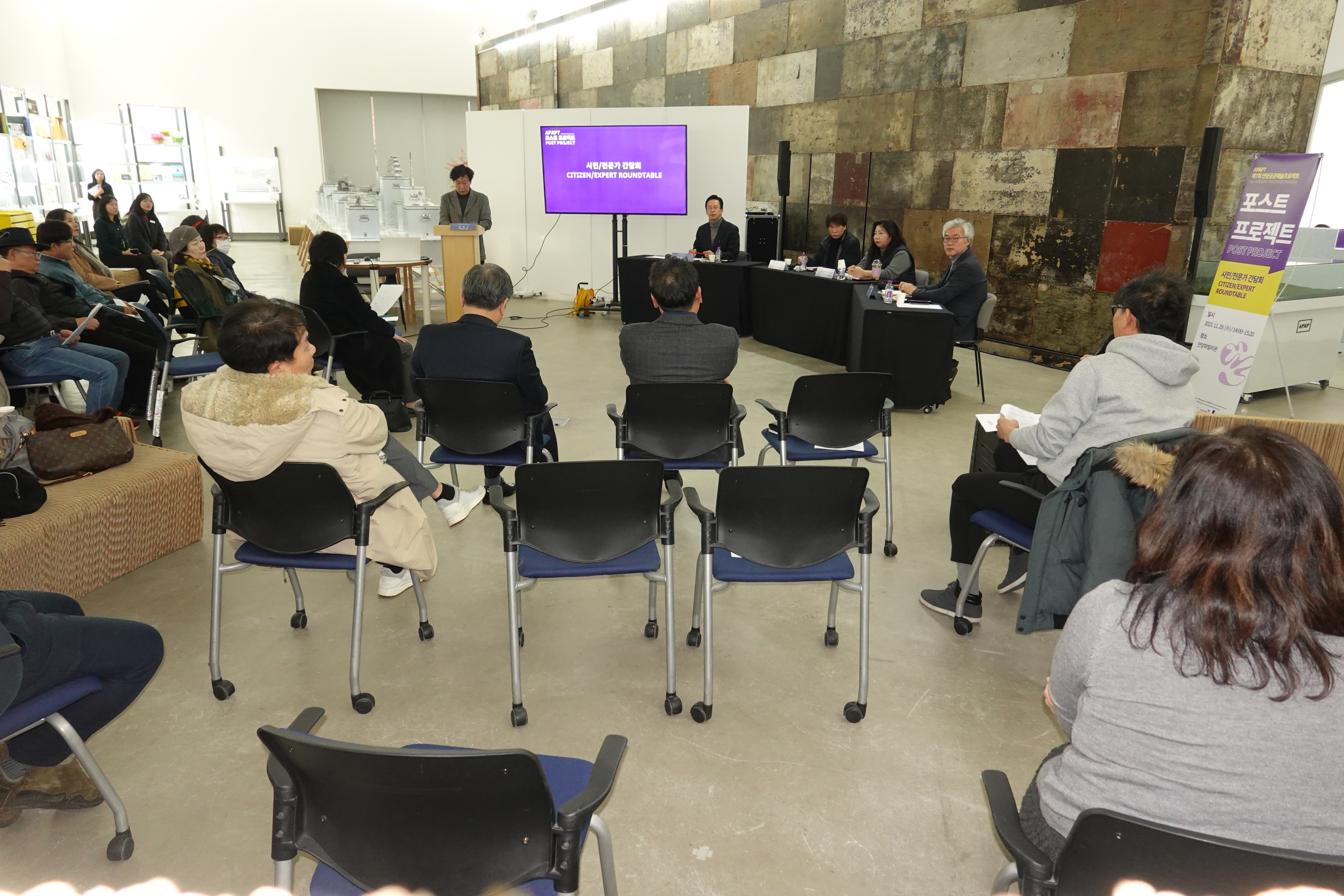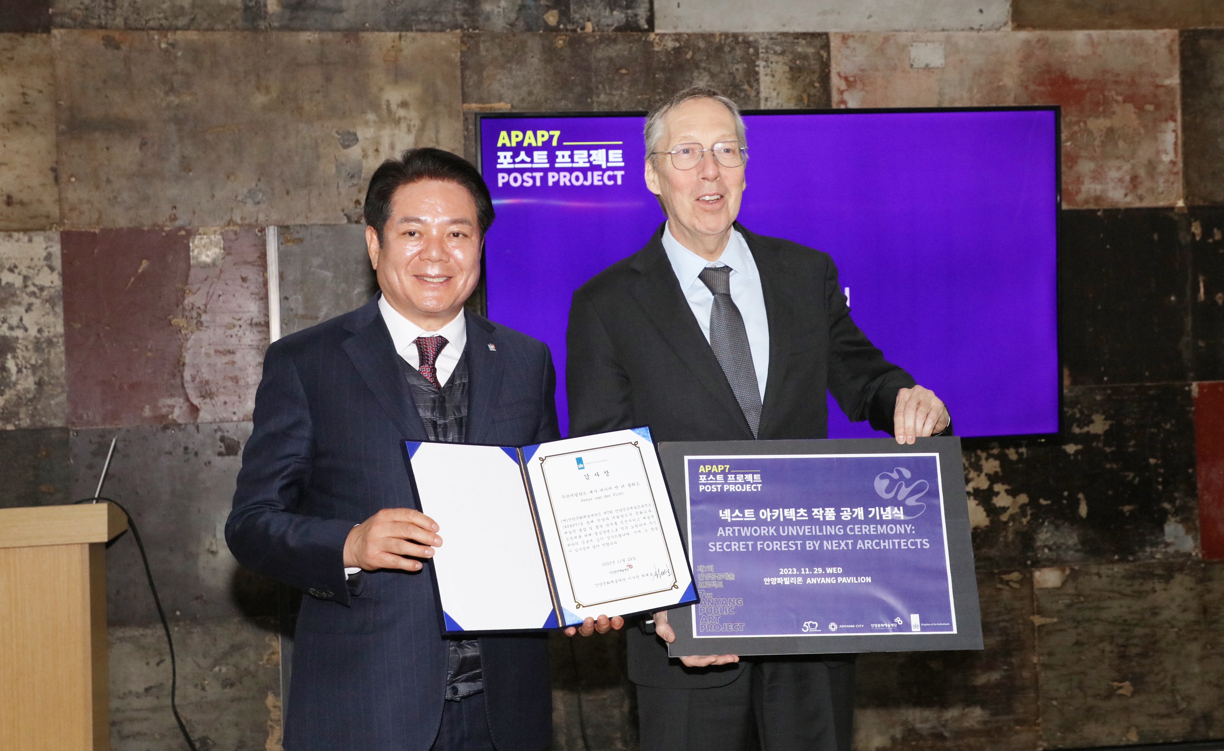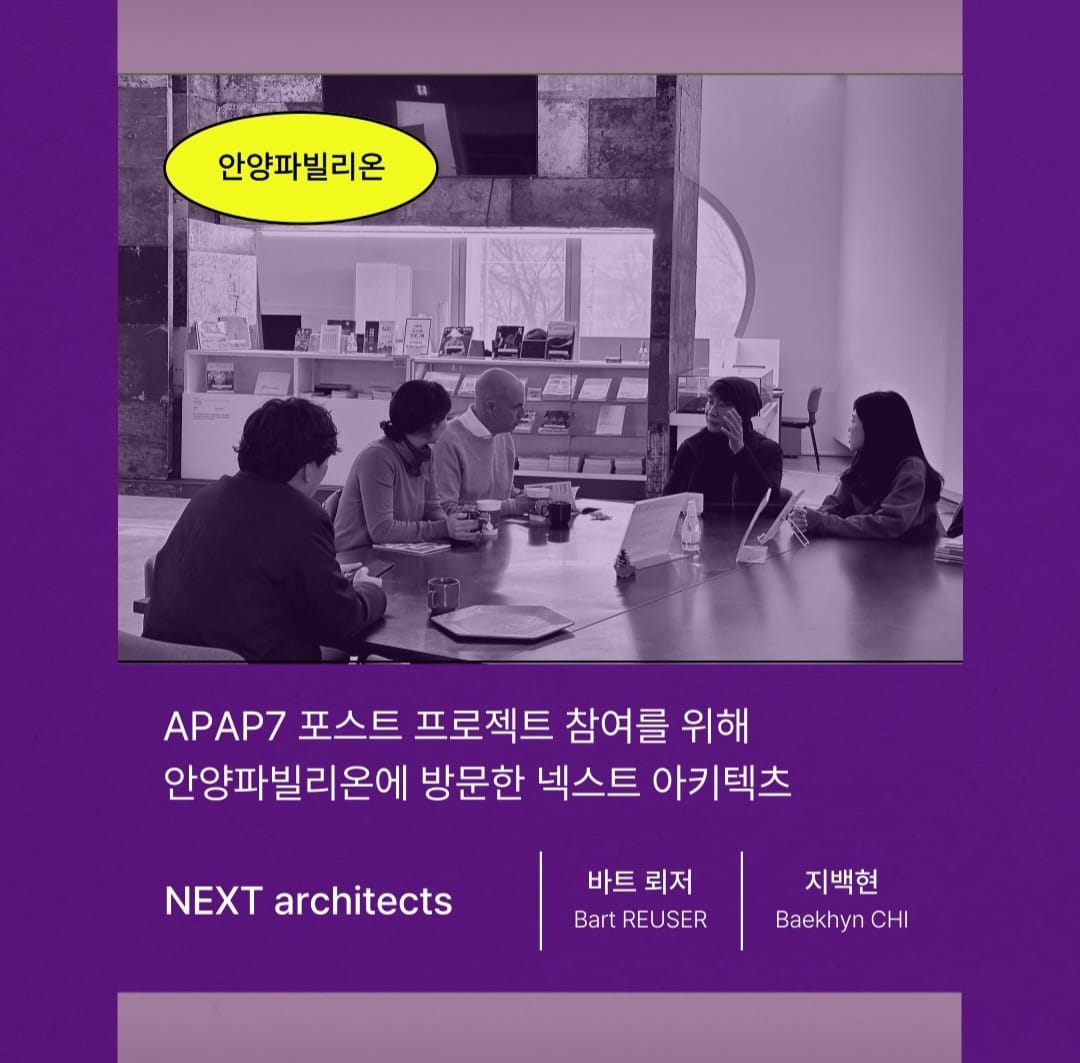 주한네덜란드대사관이 후원한 이날 ‘포스트 프로젝트’는 2022년부터 안양 시민과 함께한 ‘프레 프로젝트’, 그리고 지난 8월 야외 및 실내 전시가 이뤄진 ‘메인 프로젝트’에 이어 진행되는 사후 프로젝트로서, 지난 2년 동안 진행한 APAP7의 성과를 공유하고 향후 발전 방안에 대해 논의하는 ▲시민/전문가 사후 간담회와 APAP7 마지막 출품작인 ▲넥스트 아키텍츠 작품 공개 기념식에 이어 작품이 설치되고 있는 현장을 돌아보고 리셉션을 갖는 순서로 진행됐다.