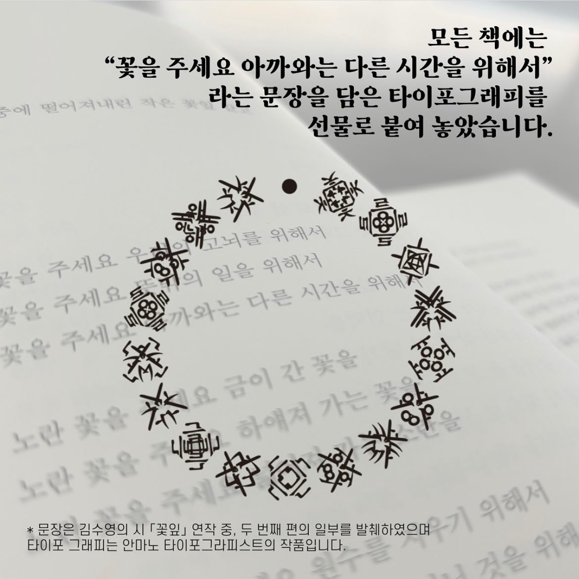2023.12.01/ #선물 #책 #APAP7 #만달라/ APAP7 마지막행사 '포스트 프로젝트' 에 참석한후 나오면서 책이 든 봉투 하나를 선물 받았습니다. APAP7 작품중 하나인 함돈균작가의 <북만달라>전시장 비치되었던 책 150권중 하나. 봉투에 부착된 쪽지르 보니 책 내용중 한 문장이 "얼떨결에 그이름 입에 담네'입니다. 봉투 안의 책이 궁금하지만 아직 열지를 못하고 있습니다. APAP7 행사는 끝났지만 책 선물을 통해 색다른 재미를 주네요. 책을 선물받기 원하시면 12월 17일까지 안양예술공원에 자리한 안양파빌리온으로 가시기 바랍니다. https://ngoanyang.or.kr/8455