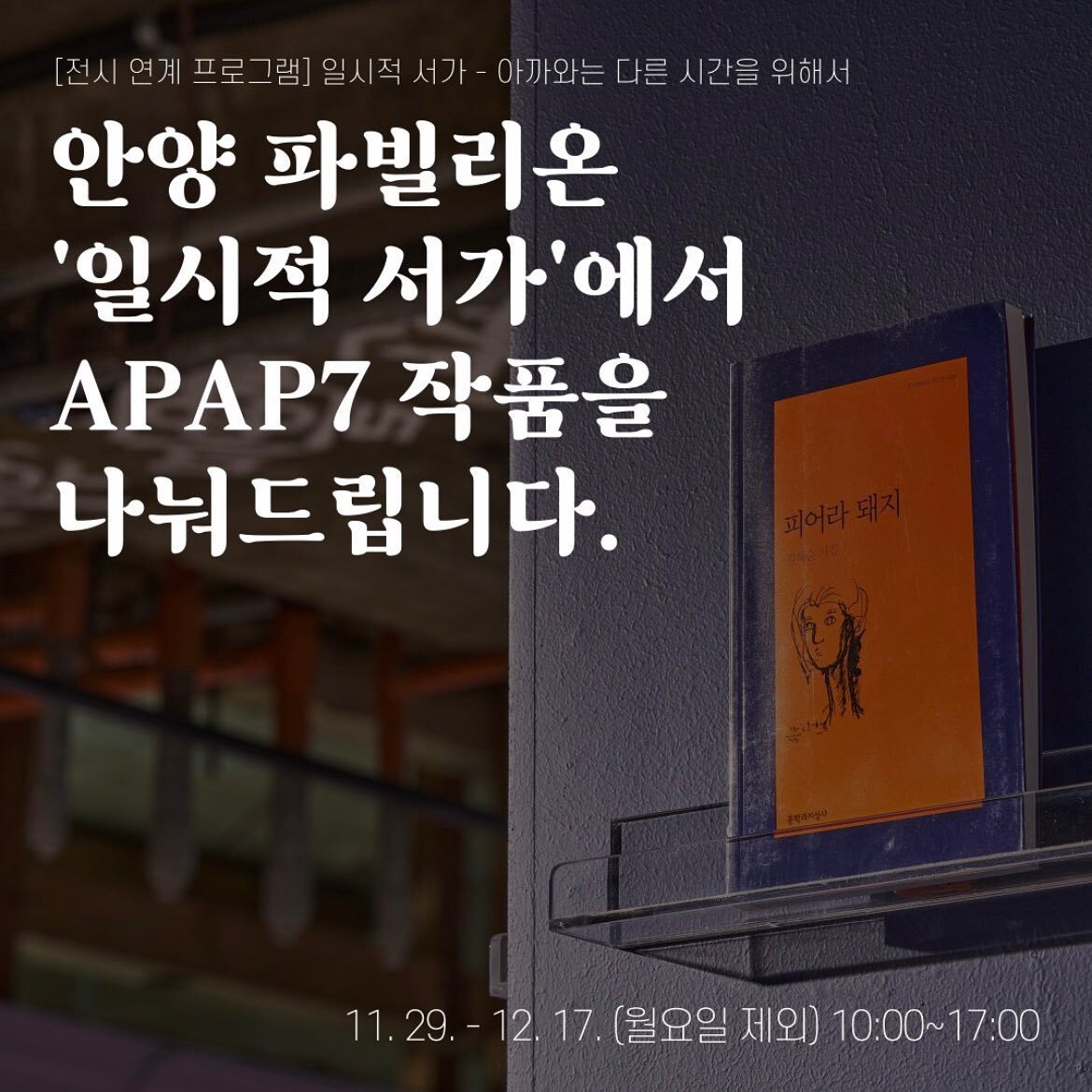 | [20231130]APAP7, 안양파빌리온에서 작품(책)을 나눠줍니다 (0) | 2023.11.30 |