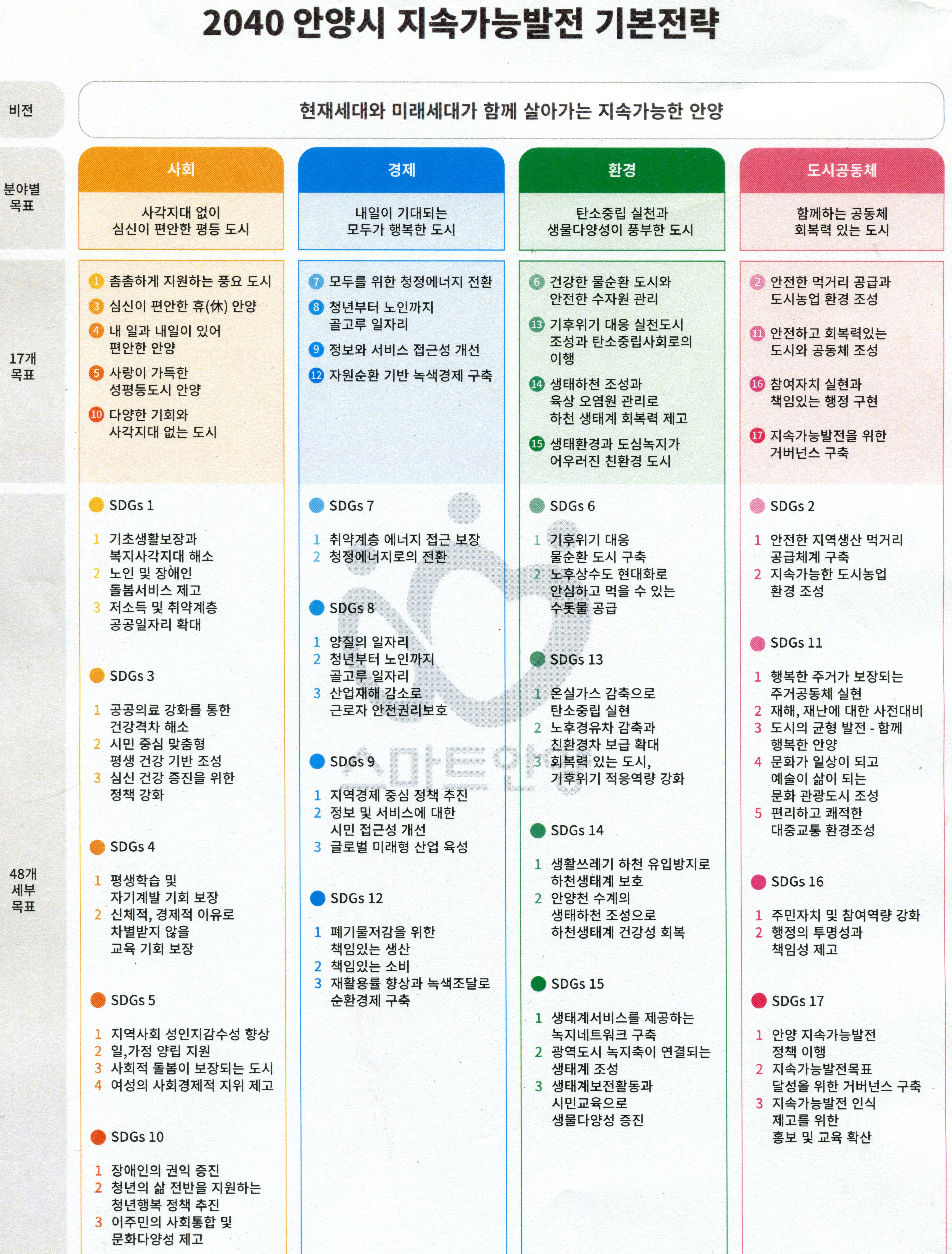 안양시의 지속가능발전 기본전략은 2015년 UN총회에서 결의한 지속가능발전의 이념을 실현하기 위해 살기 좋은 안양시 조성에 필요한 목표를 설정하고, 이를 달성하기 위한 구체적인 전략과 실행방안을 담은것으로 향후 시의 정책 방향 설정 시 미래에 대한 희망적인 계획이나 구상으로 활용한다는 방침이다.
