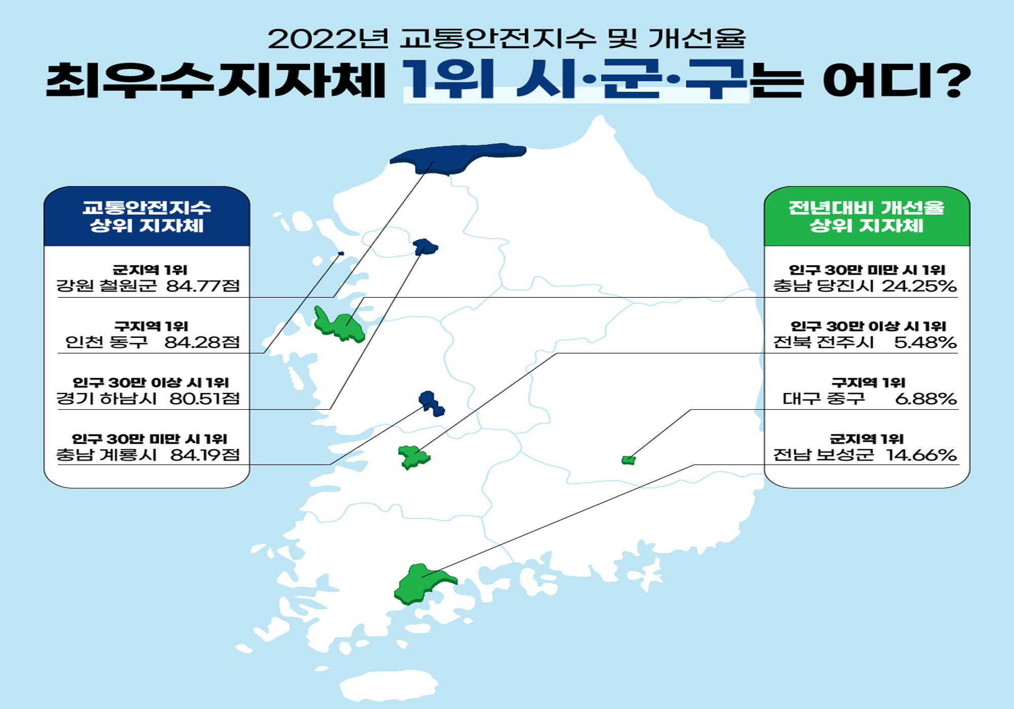 도로교통공단이 2022년도 교통안전지수를 분석한 결과 인구 30만 이상 도시 중에는 경기 하남시가 80.51점, 30만 미만 시인 충남 계룡시는 84.19점, 군·구 단위에서는 철원군과 인천 동구가 각각 84.77점과 84.28점을 얻어 그룹별 교통안전수준이 가장 높은 것으로 나타났다.