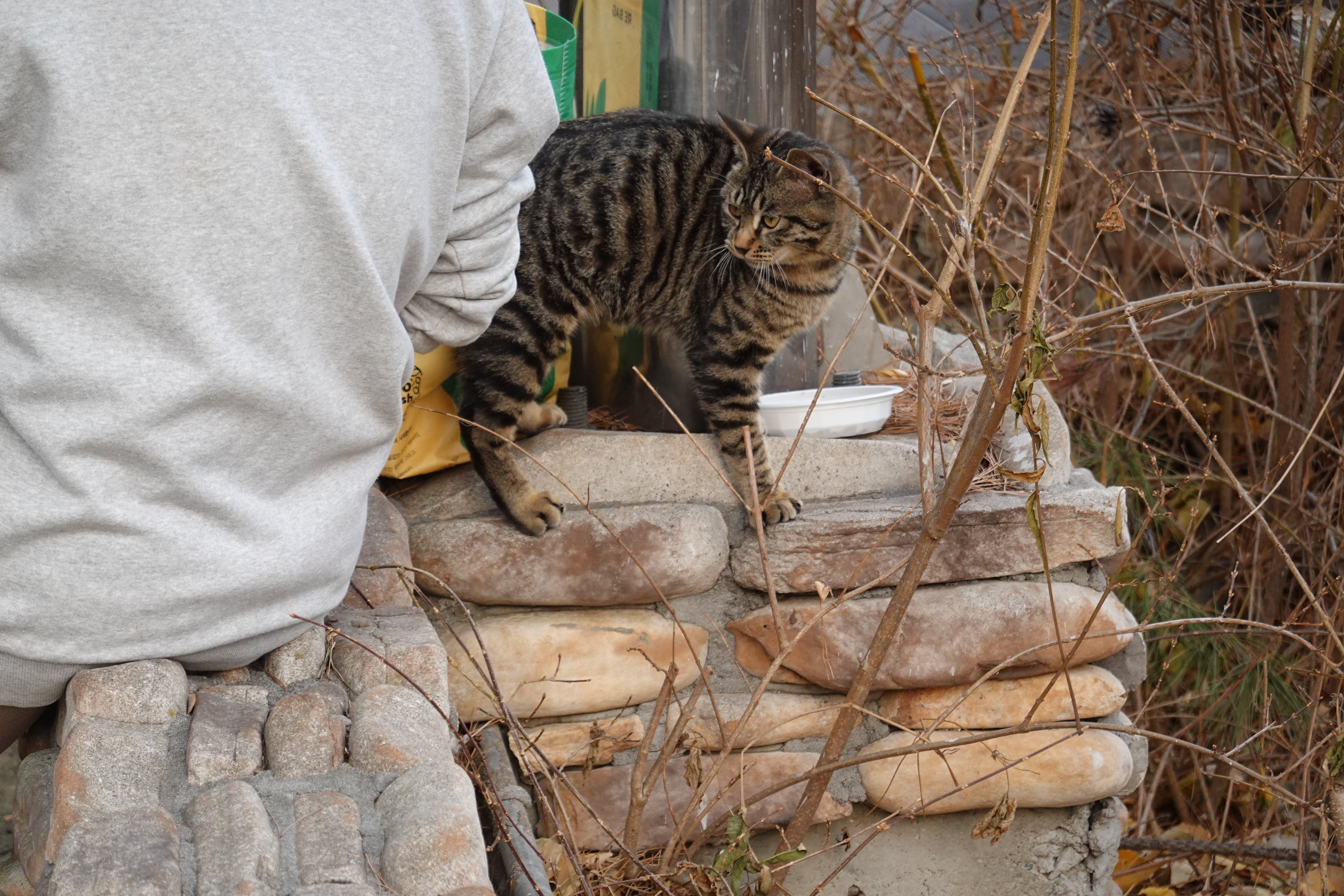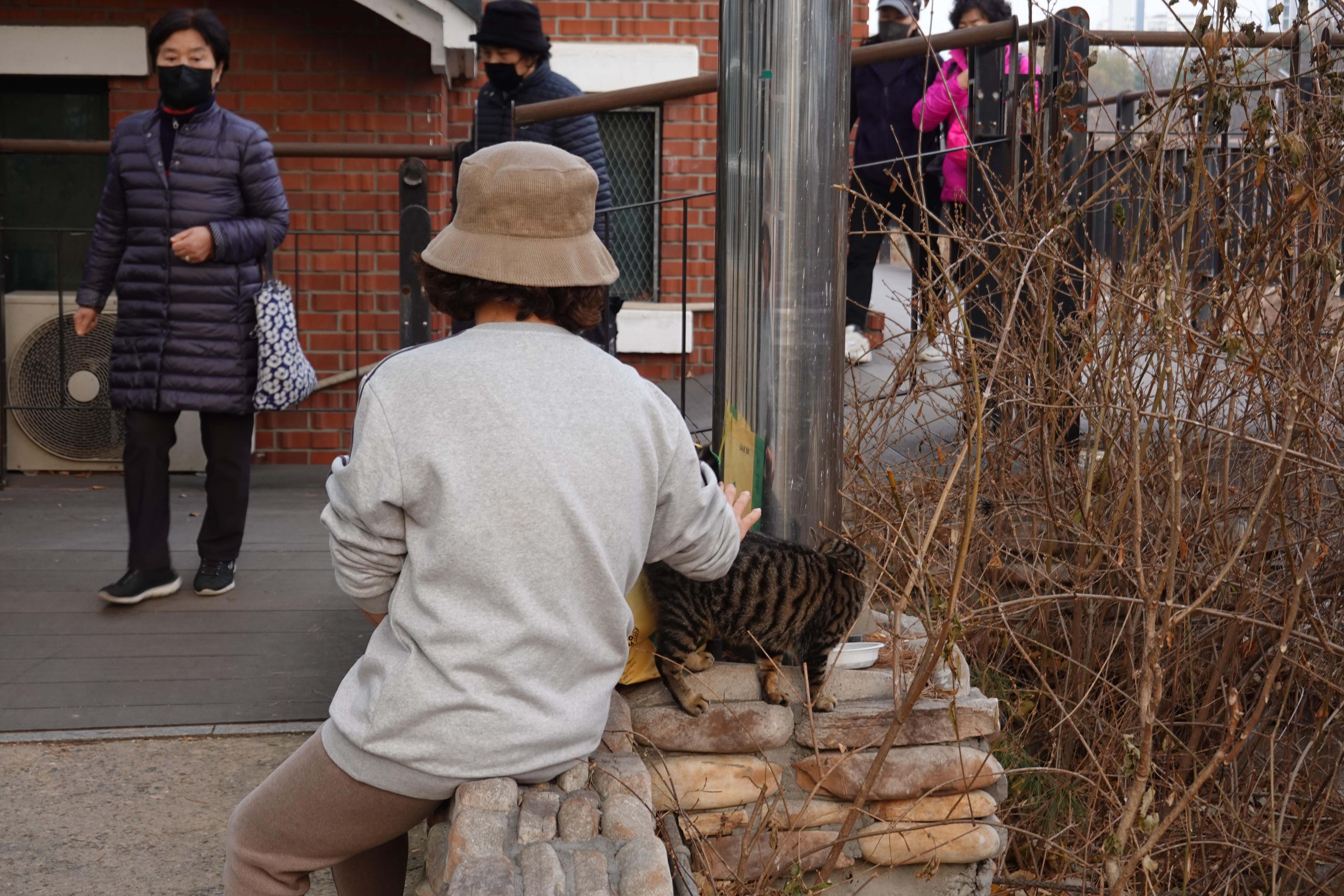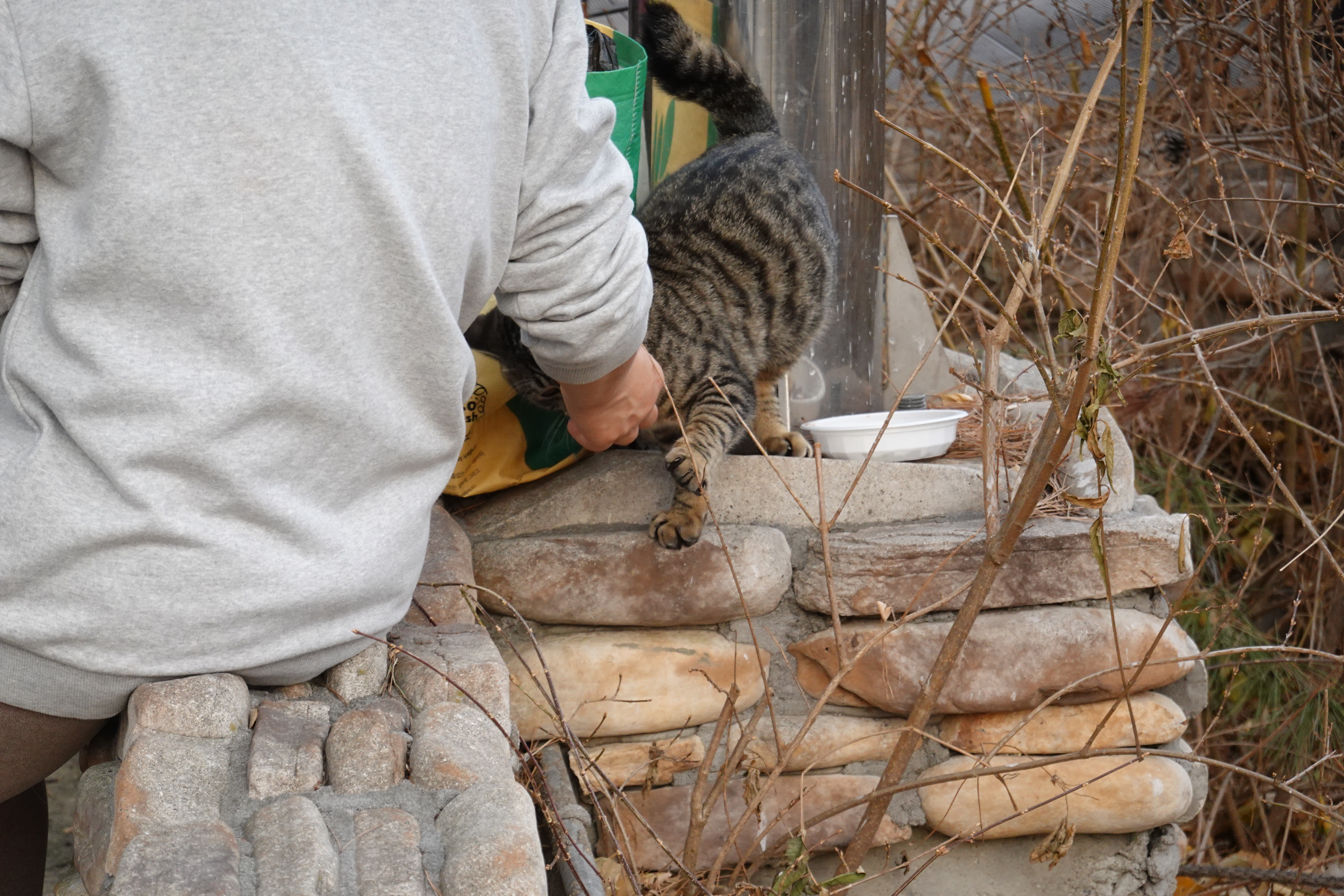 2023.12.10/ #도시기록 #길고양이 #냐옹이 #안양/ 안양천 뚝방 산책길을 지나다 만난 냐옹이와 캣맘 아주머니. 비산펌푸장 주변에 터를 잡고 사는 녀석인데 잘 생겼다. 돌봐주시는 캣맘 아주머니께서 먹이 제공뿐 아니라 같이 놀아주시기도 한다. 아직 새끼(수컷)로 내년 초 중성화수술을 해줄 예정이란다. 함께 잘 지내실분이 있으면 입양을 보내고 싶으시다며 좋은분소개해달라는데, 저 녀석 보호자 되실분 있으실까.