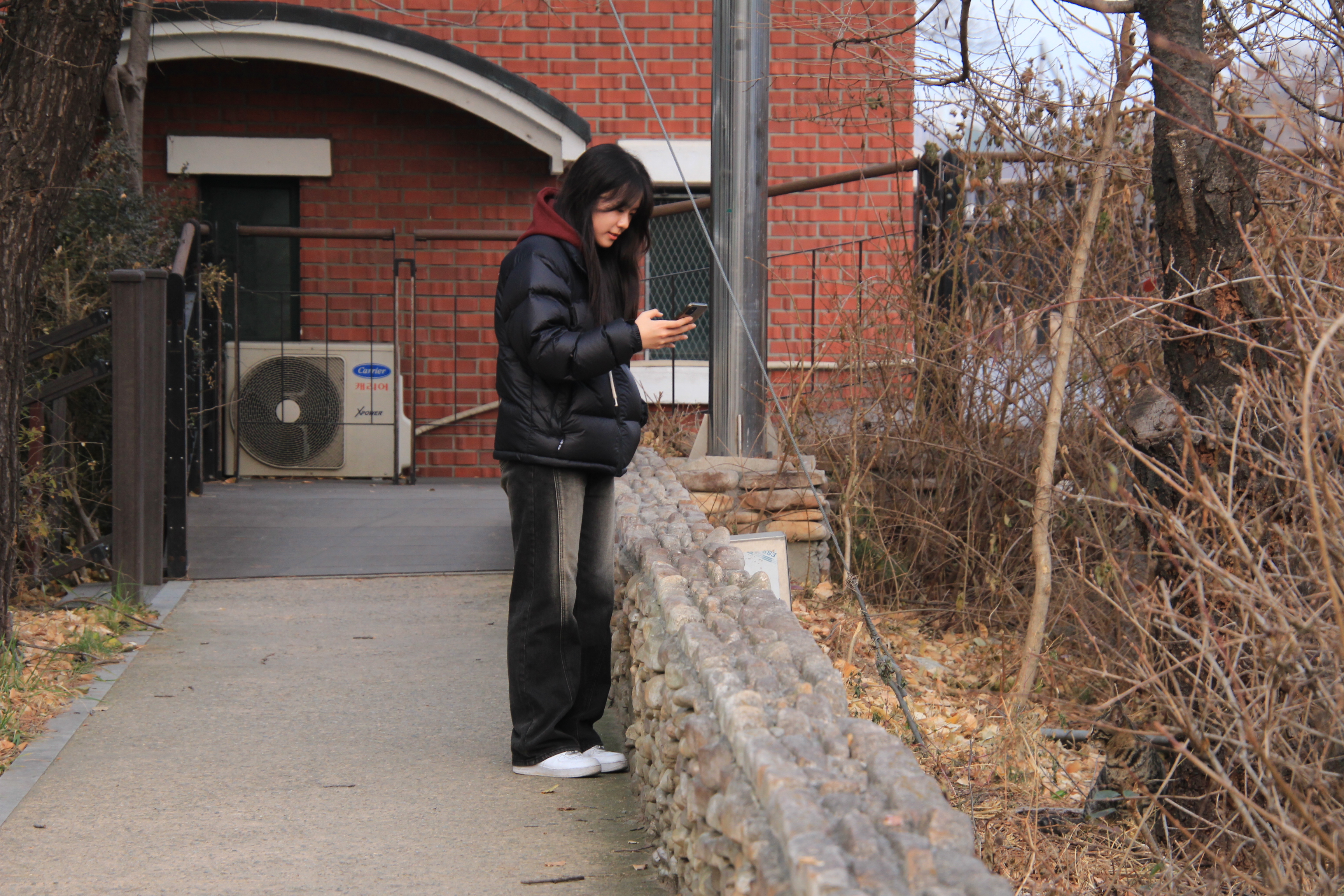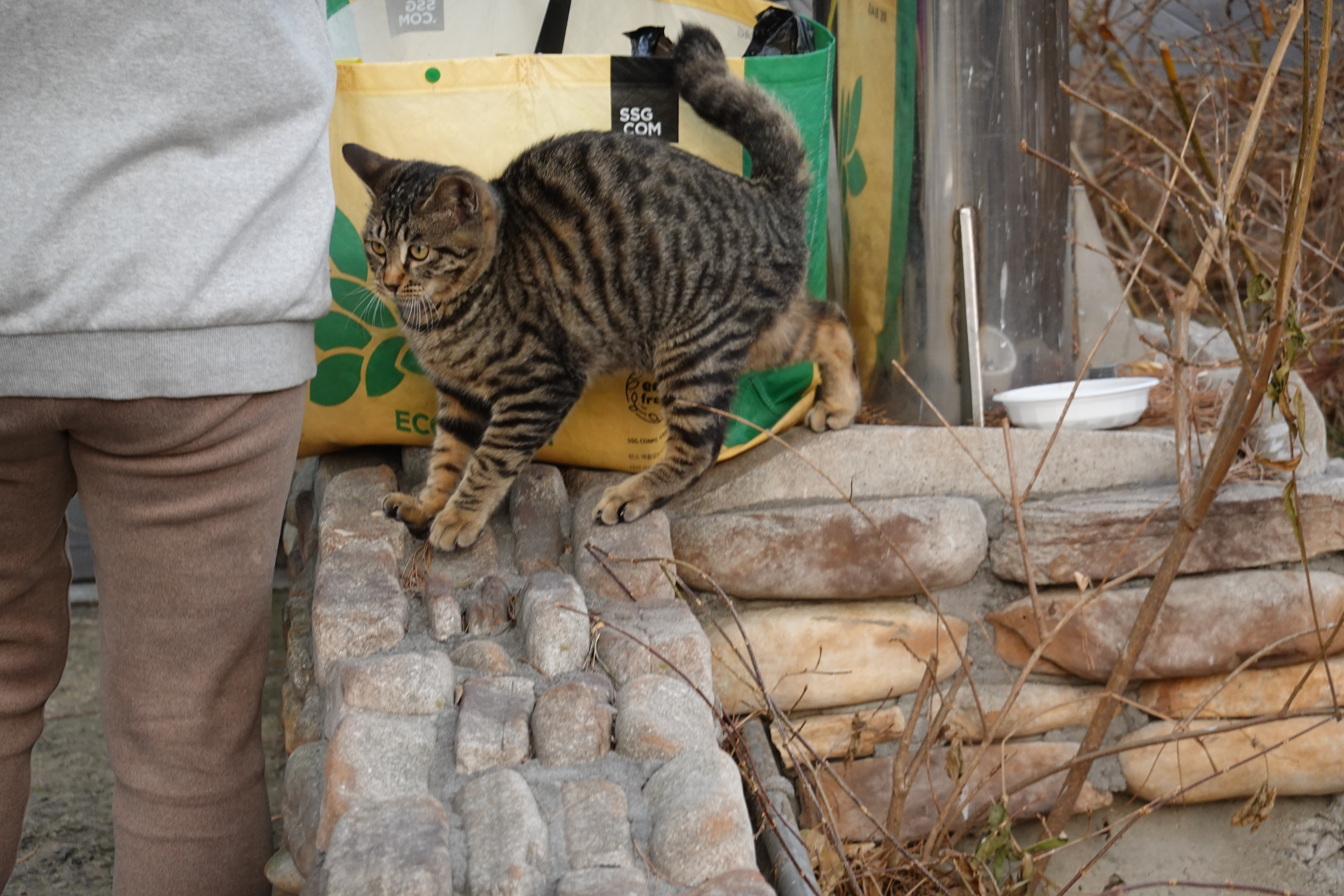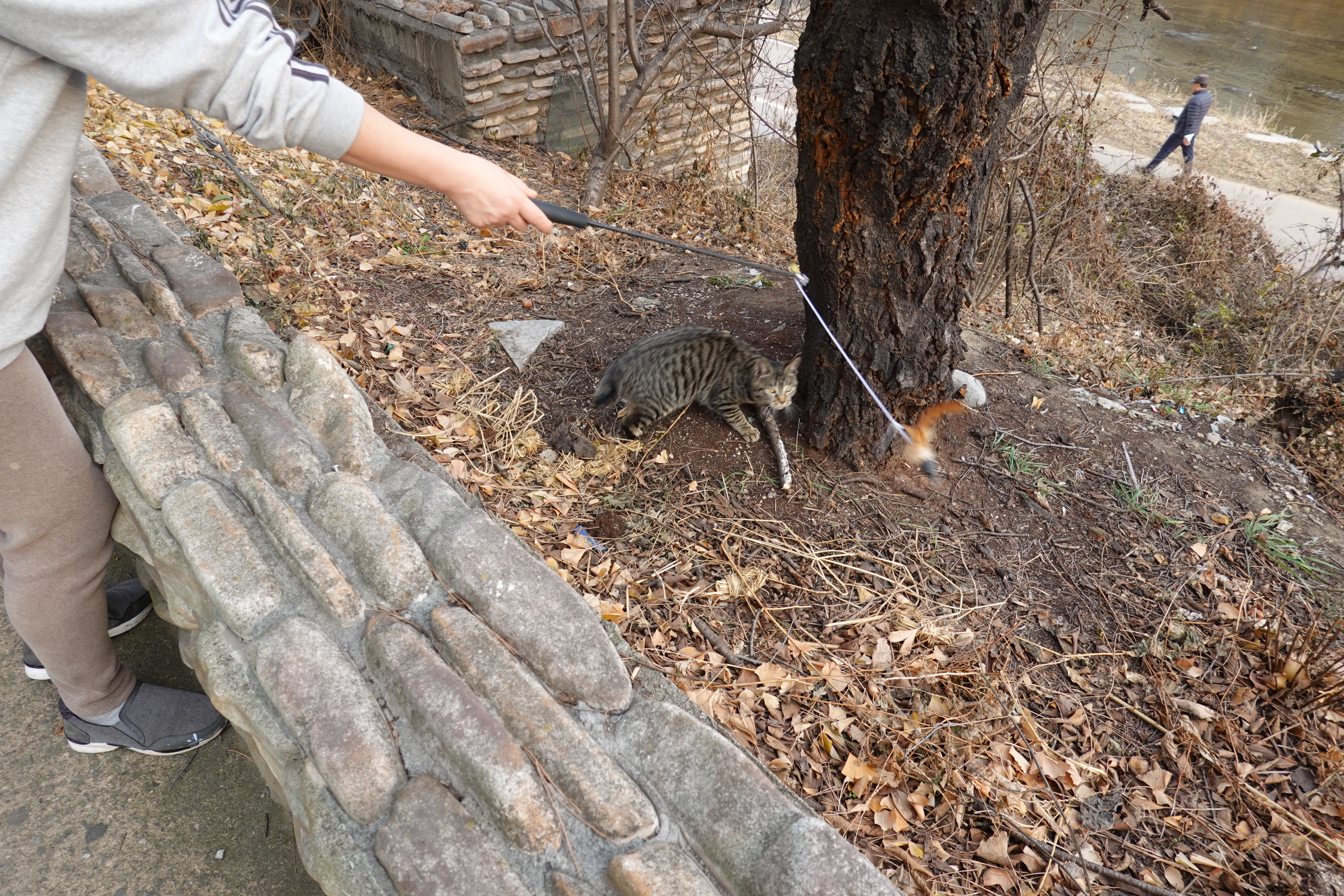 2023.12.10/ #도시기록 #길고양이 #냐옹이 #안양/ 안양천 뚝방 산책길을 지나다 만난 냐옹이와 캣맘 아주머니. 비산펌푸장 주변에 터를 잡고 사는 녀석인데 잘 생겼다. 돌봐주시는 캣맘 아주머니께서 먹이 제공뿐 아니라 같이 놀아주시기도 한다. 아직 새끼(수컷)로 내년 초 중성화수술을 해줄 예정이란다. 함께 잘 지내실분이 있으면 입양을 보내고 싶으시다며 좋은분소개해달라는데, 저 녀석 보호자 되실분 있으실까.