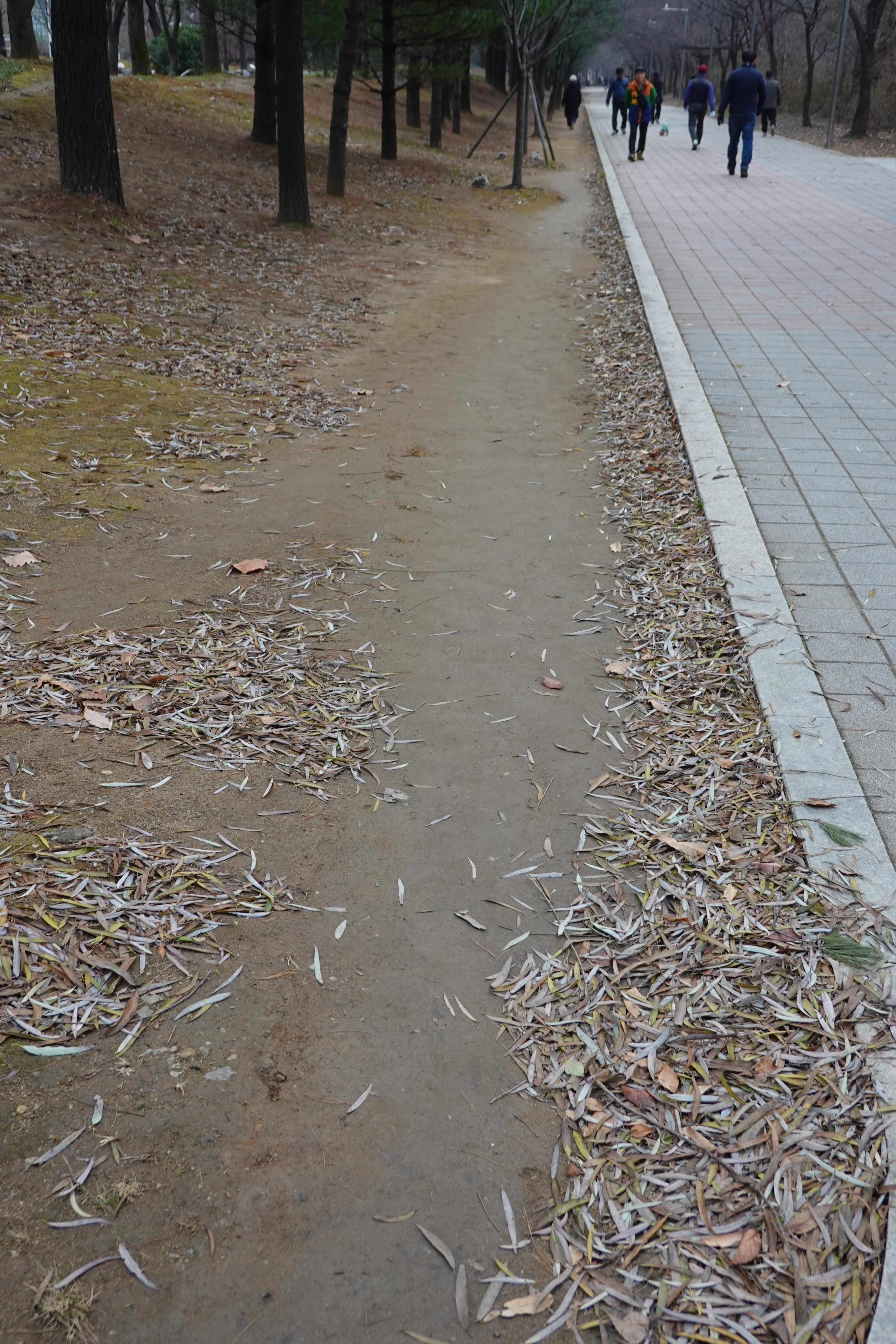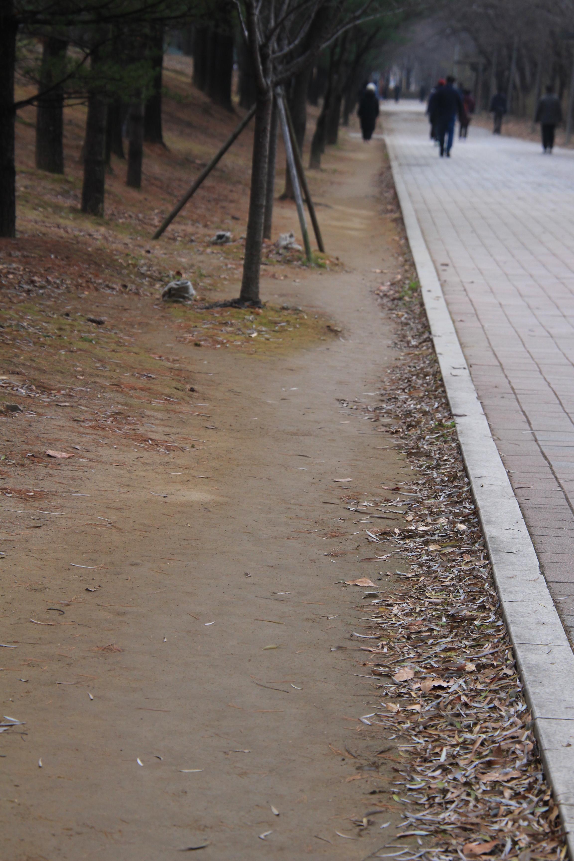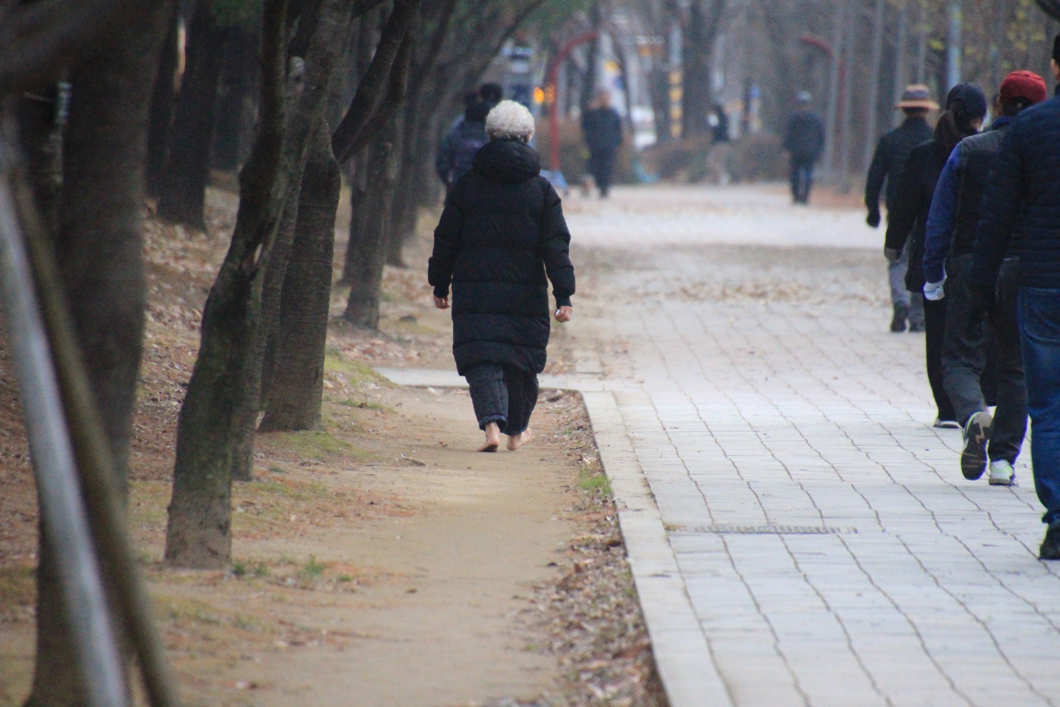 2023.12.10/ #도시기록 #안양 #학운공원 #맨발걷기/ 맨발걷기 열풍이다. 학운공원 보도블록 산책로옆 흙 바닥을 따라 맨발걷는 이들이지나다니면서 반들반들하게 맨발로 걷는 길이 생기고 있다.