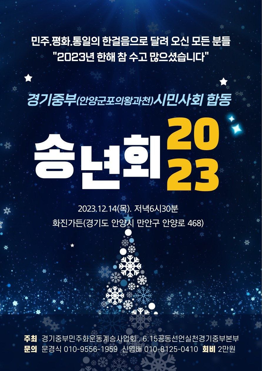 안양군포의왕과천에서 활동하는 경기중부 시민사회 2023 송년회가 오는 14일(목) 오후 6시30분 안양시 석수동 석수전화국 인근에 자리한 화진가든(031-472-6262)에서 열린다,