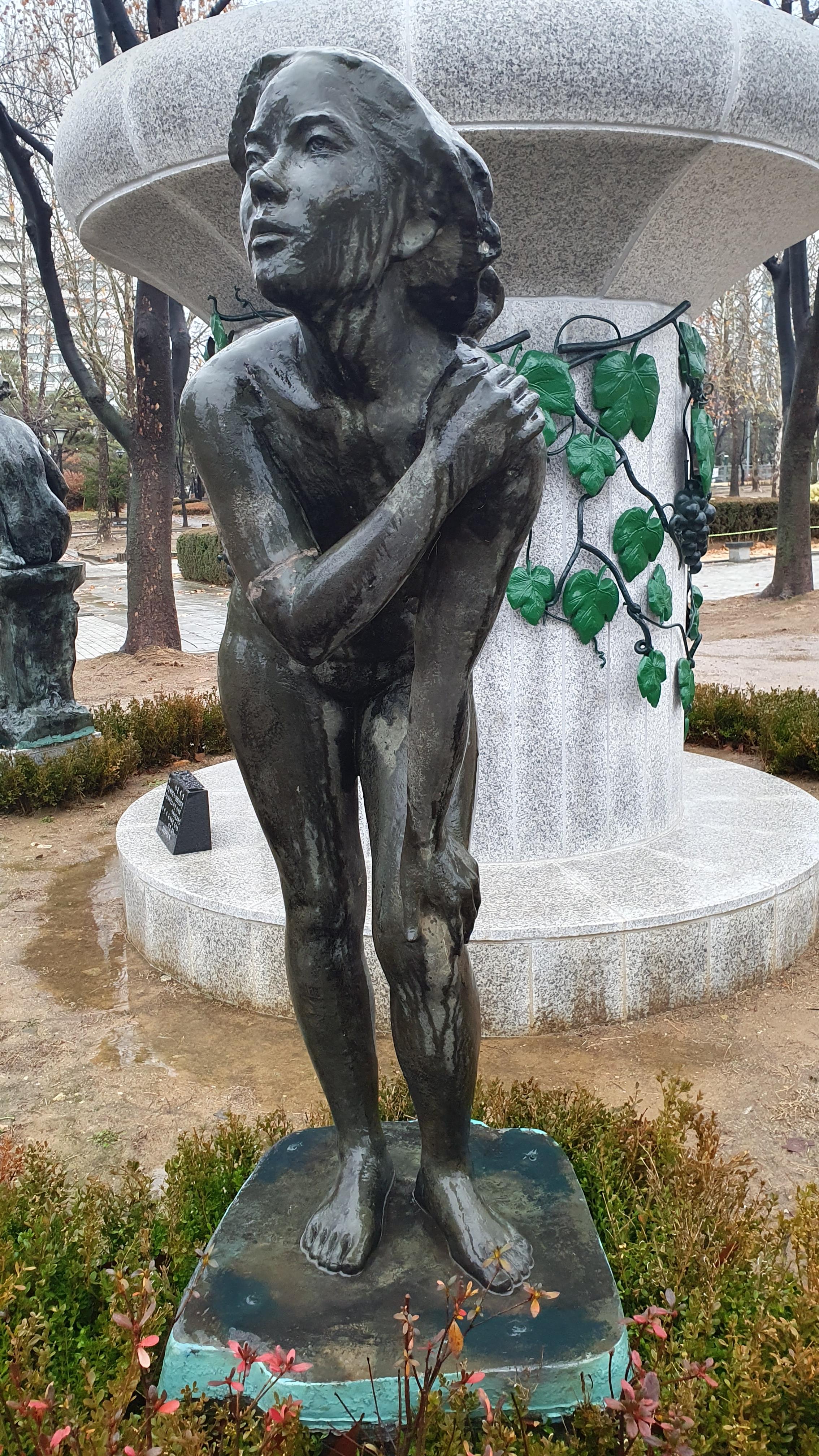 2023.12.15/ #도시기록 #미술작품 #안양 #평촌중앙공원 #홍사영/ 안양 평촌중앙공원 동쪽구역에 처음보는 대형 조형물(공공미술작품)이 생겼다. 2023년 apap7 개막을 앞두고 공사가 한창이기에 안양공공예술프로젝트 영구작품인가 했더니 2009년 작고하신 홍사영 화백(전 안양미술협회 지부장) 작품이다. 작품앞 표지석을 보니 1996년 7월에 제작하여 비산사거리에 이마트앞 교통섬에 설치했던 것인데 월곶-판교 지하철 공사로 인해 평촌중앙공원으로 이전 설치한 것이다. 그런데 작품명이 없다. 새 표지석에 작품명도기록하면 좋았을것을. 포도장식이 있는걸 보니 작품명이 포도와 연관 추정.