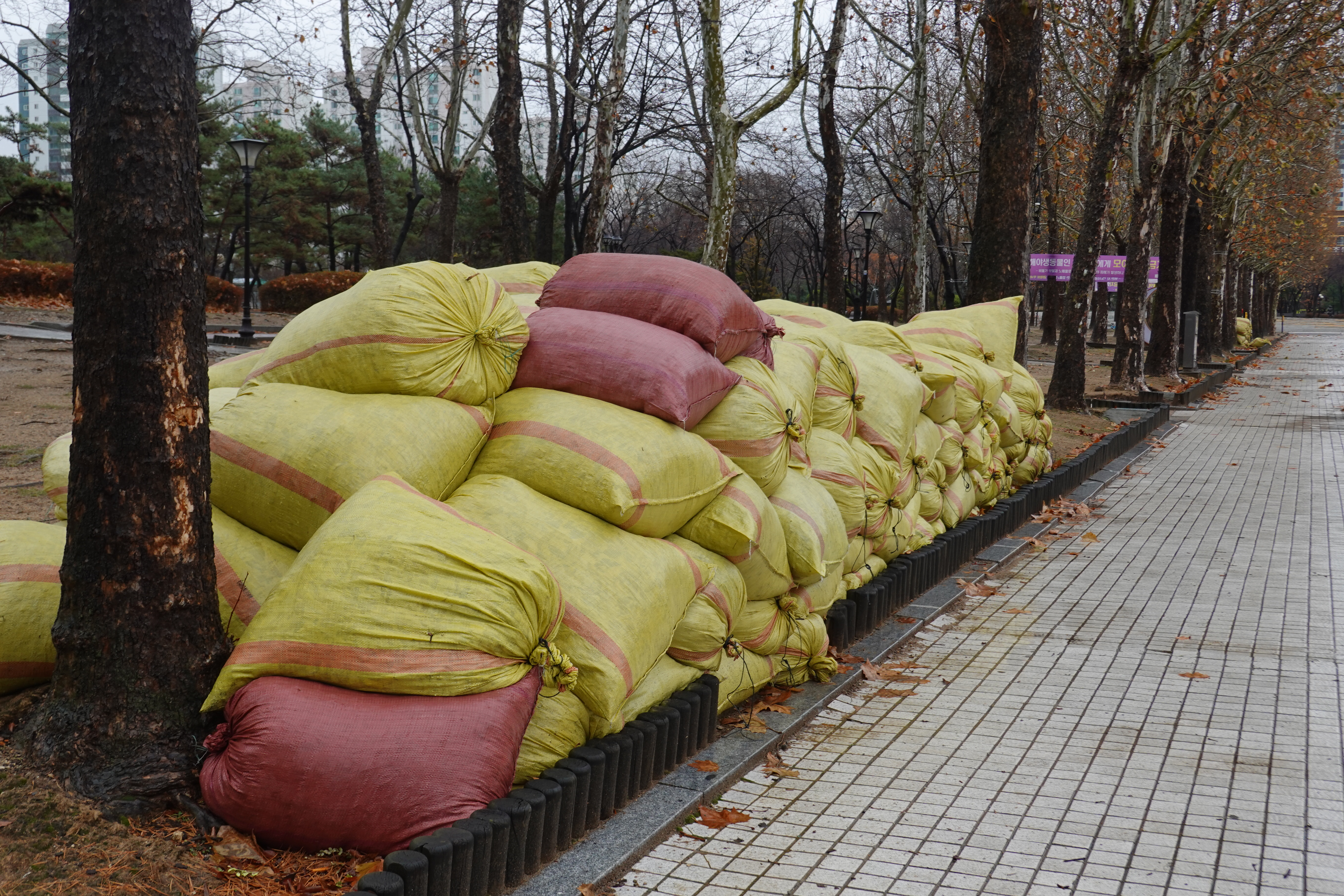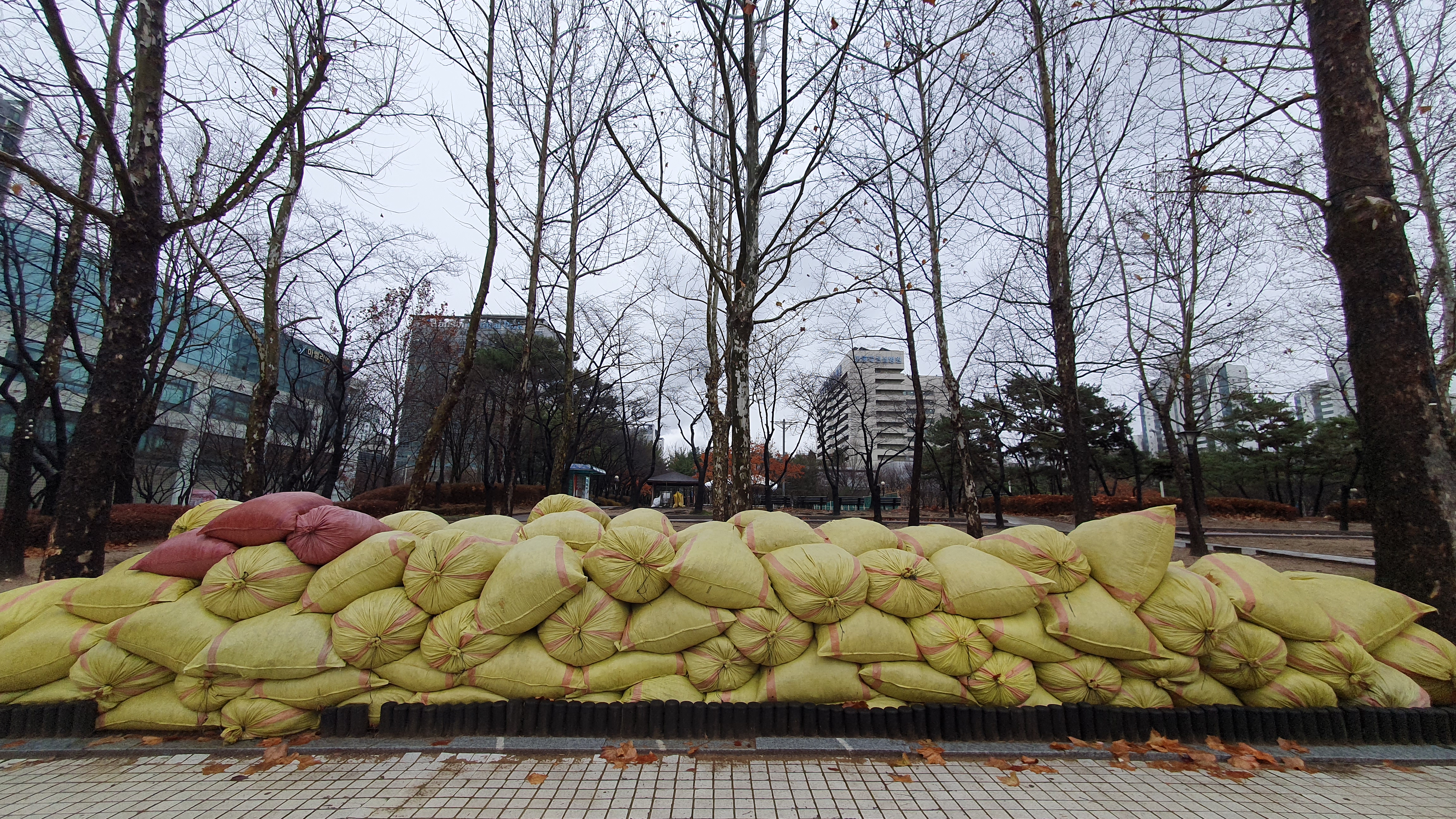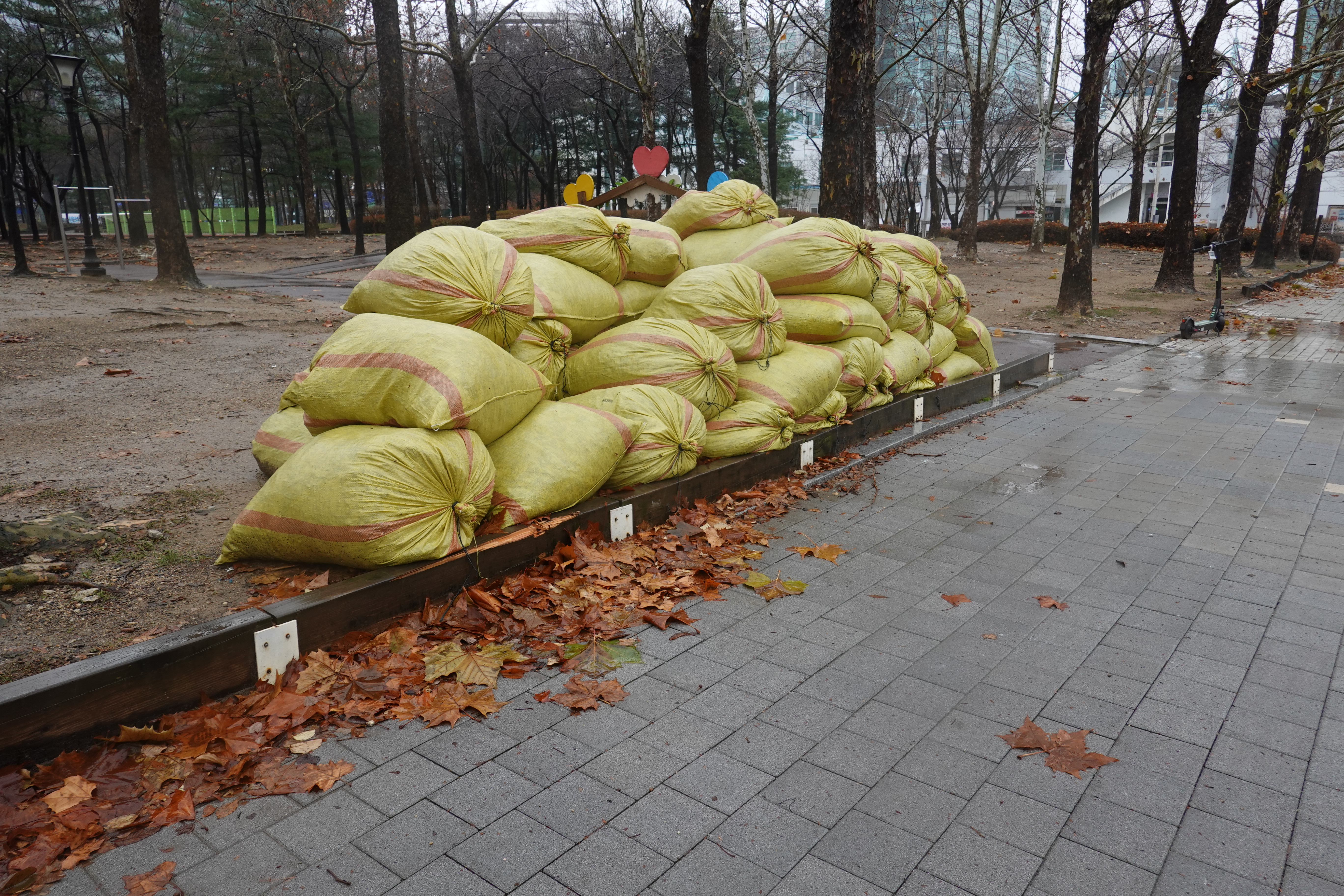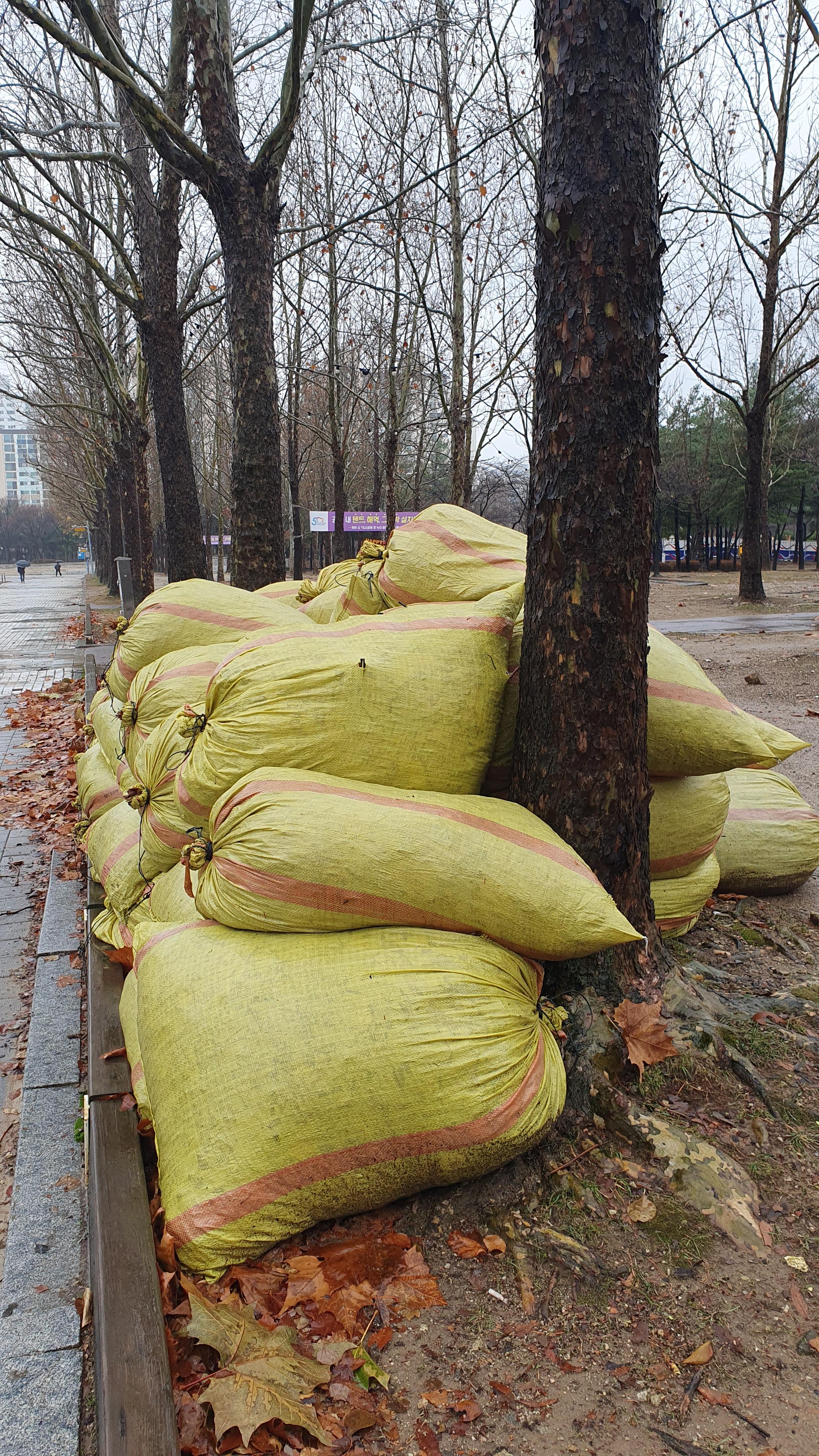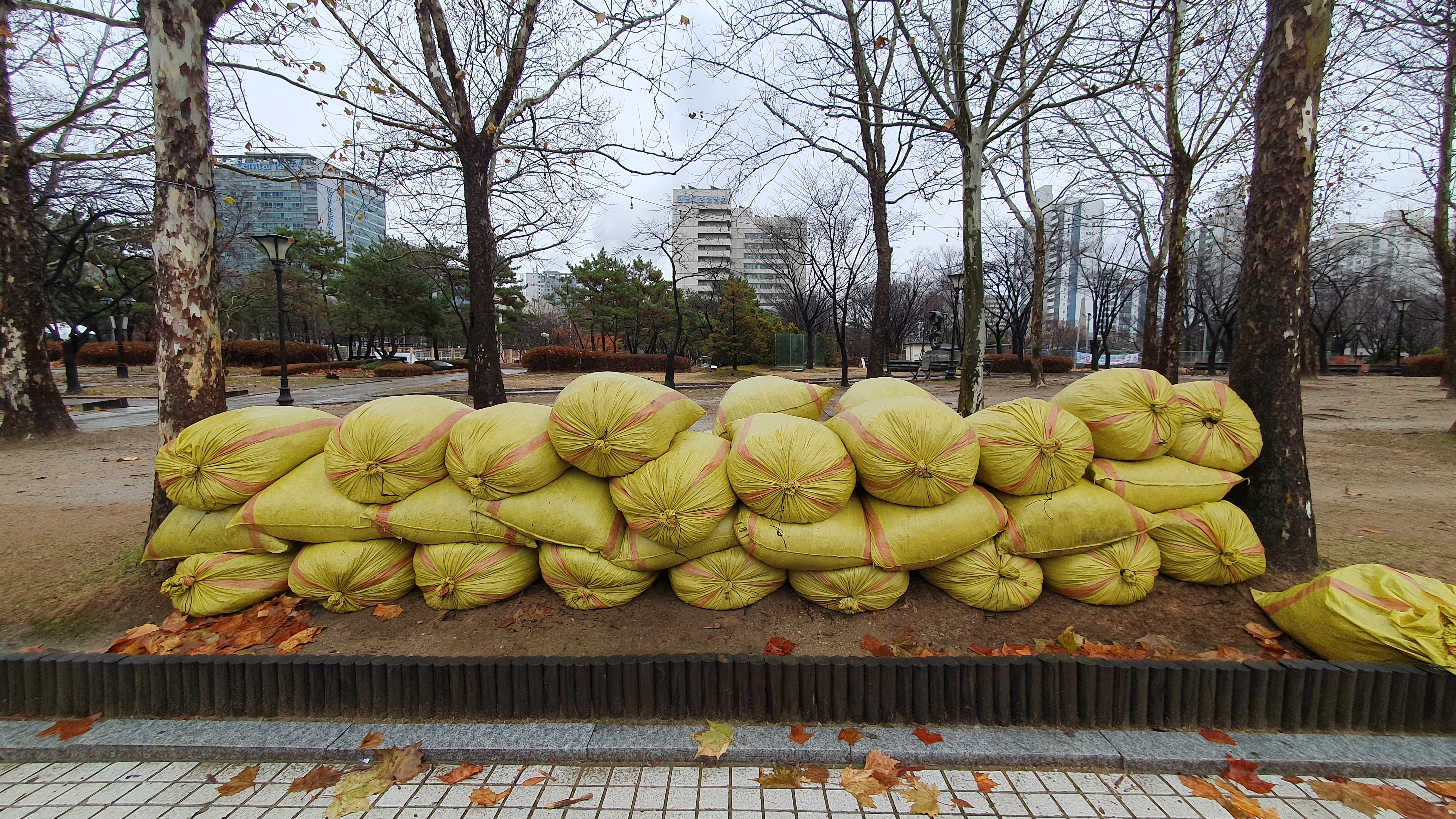 2023.12.15/ #도시기록 #안양 #평촌중앙공원 #낙엽 #마대자루/ 공원 곳곳에 잔뜩 쌓인 마대자루들. 저 마대자루 속에는 중앙공원에서 수거한 낙엽들이 담겨져 있다. 특히 중앙공원에 심어진 나무들이 대부분 잎이 커다랗고 무성한 포플러나무이기에 부피가 큰듯 싶다. 저 마대자루들은 이제 자원순환과정에서 어디로 갈까. 잘 이용되면 퇴비용이거나 또는 전량 소각되지 않을까 싶다.