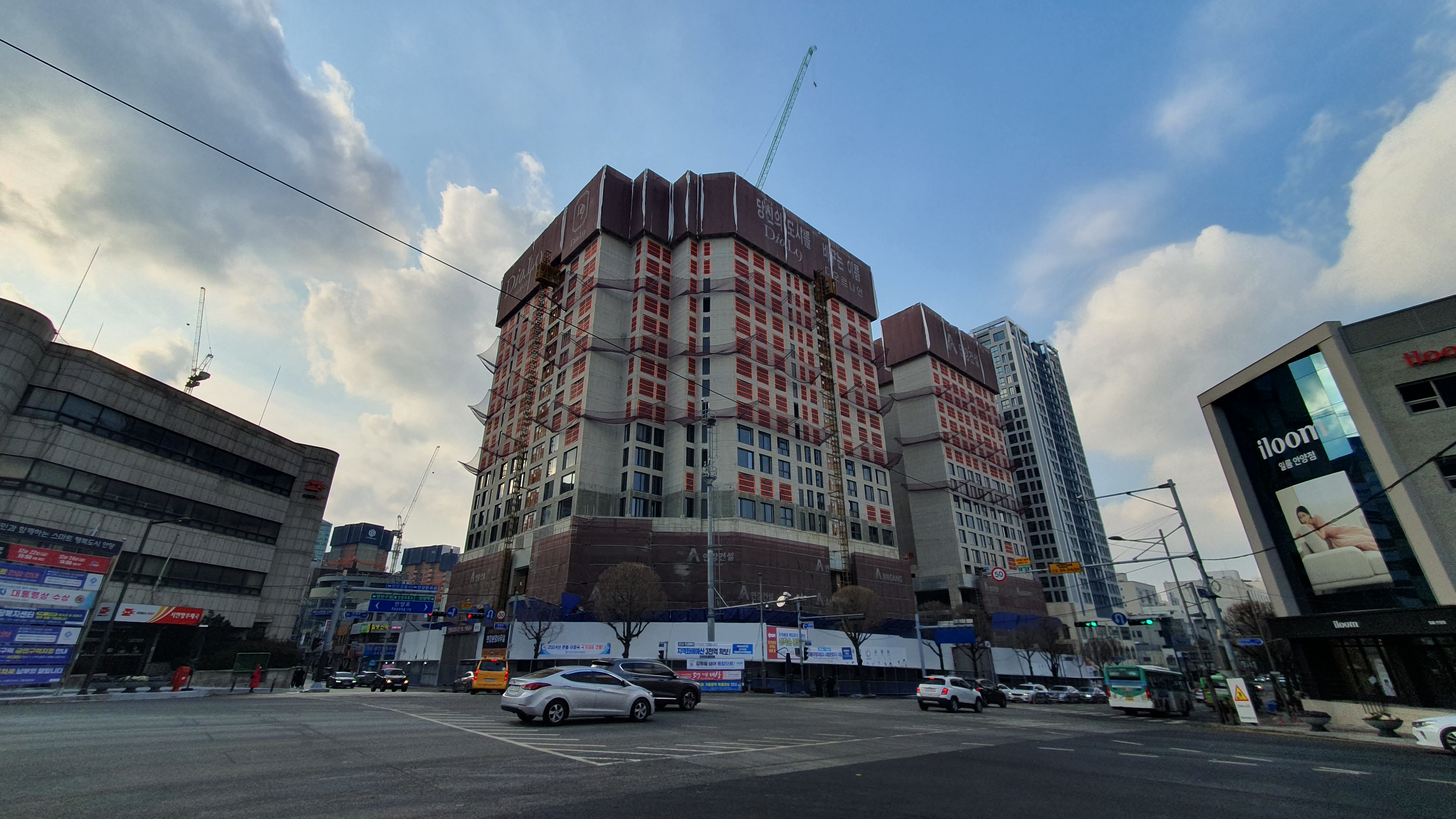 2023.12.24/ #도시기록 #안양5동 #디오르나인 #오피스텔/ 안양5동 우체국사거리라 불리우던곳. 결혼회관이 있던 자리에 짓는 오피스텔이 쭉쭉 올라간다. 이곳에는 25층의 주상복합(판테온 디오르나인) 3개동이 들어설 예정이다. 이곳에 있던 결혼회관(포시즌코리아웨딩홀)은 수많은 결혼식이 이루어졌던으로 결혼회관이 들어서기 전인 1960-70년대에는 포도밭이 있었다.