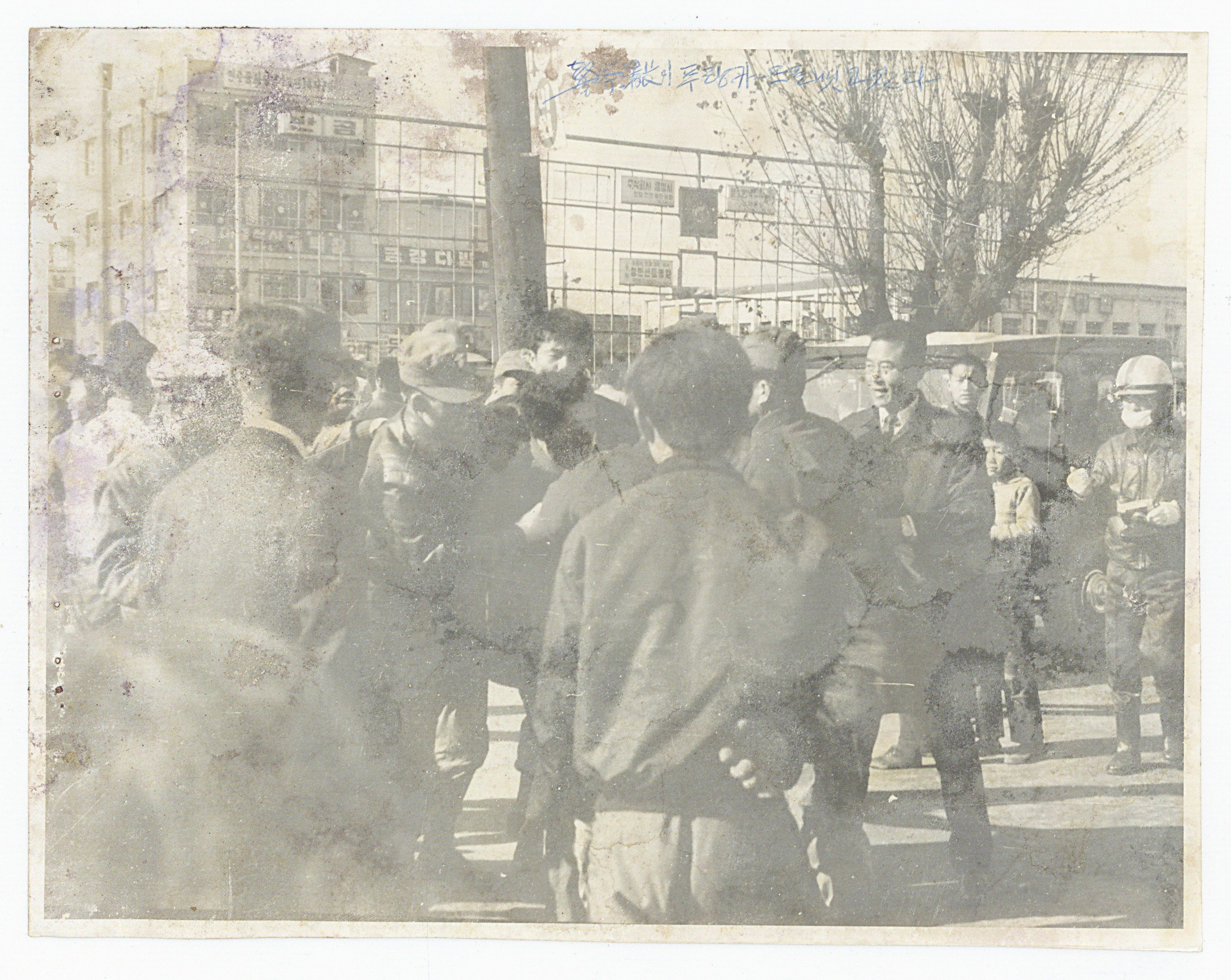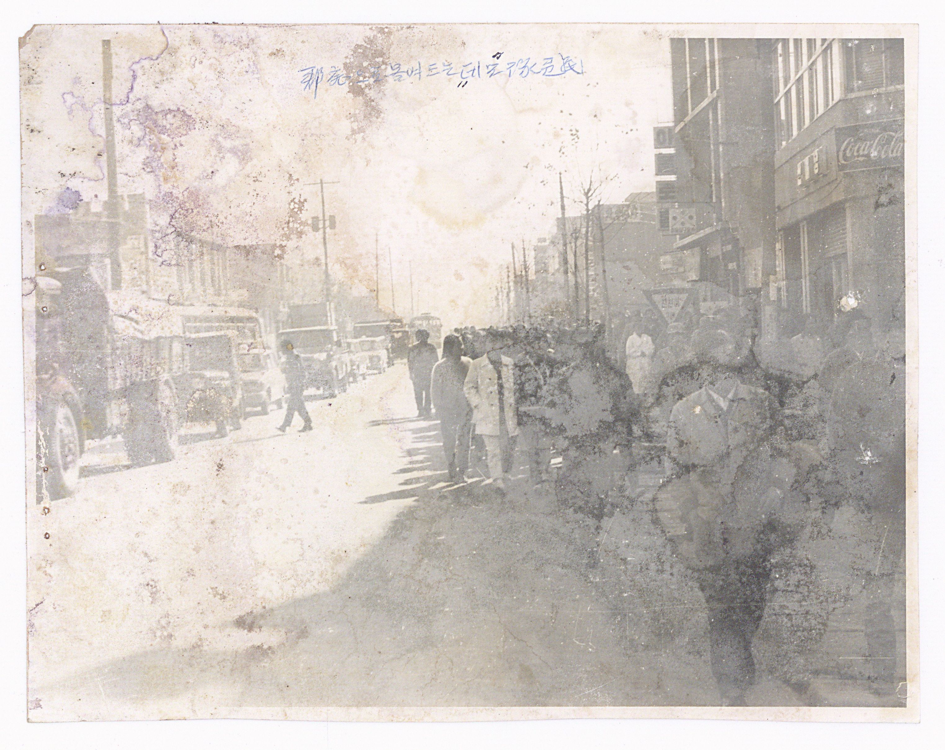 사진 설명으로 안양극장으로 운집하는 읍민으로 기록돼있는데 사진 왼쪽에원앙예식장 간핀이 있는 것을 볼때 안양역 광장으로 몰려드는 읍민들이 맞다.사진 설명에 국도로 시위하지 않도록 제지하는 경찰관이라 적혀있다. 사진 윗쪽이 현 벽산사거리로 위 오른쪽 건물에 예식장과 다방, 도서실, 시흥군문화원이 있었다.(지금도 건물 현존). 사진 왼쪽에는 제일의원이 보인다. 데모대가 운집한 곳은 현 장내로 도로위로 읍민관에서 궐기대회를 하고 나선 읍민들이 1번 국도(만안로) 쯕으로 가려고 몰려들고 있다, 사진 왼쪽에는 신도예식장, 오른쪽으로는 시흥군청이 있었다.사진 설명에 군청으로 몰려드는 데모대 읍민이라 적혀있다.사진 설명에는 거리로 행진하는 데모대라 적혀있다. 사진 우측에 문화예식장 건물이 보이는걸 볼때 사진 왼쪽이 읍민관이고 오른쯕으로 시흥군청과 읍사무소, 경찰서 가는길 중간의 흙바닥 광장이다.(현 중앙로)당시에는 도로가 개통되기 이전의 공터로 각종 행사와 집회들이 개최되던 곳이다.사진 설명으로 경찰서장이 플랜카드를 뺏고 있다고 적혀있다.사진속 배경은 원앙에식장앞으로 경찰이 국도에서 시위하는 것을 제지하는 모습이 담겨져 있다..사진 중앙에 보이는 뾰족 종탑이 있는 고딕식 형태의 성당이 당시 장내동성당(현 중앙성당)이다. 군중이 운집한 곳이 현 벽산사거리다. 왼쪽에 고려석면 안양공장(현 2001아을렛)이 보이고, 오른쪽에는 예식장, 다방, 도서관, 시흥군문화원이 있던 건물(현존)이 보인다. 당시에는 중앙로 도로가 개통되기 이전으로 시흥군청(현 삼원프라자호텔) 및 읍민관(현 안양빌딩.1층 다이소) 연결되는 이곳에서는 광복절 행사, LAL기납북규탄집회, 궐기대회 등 다양한 군중 집회와 행사들이 열렸다.
