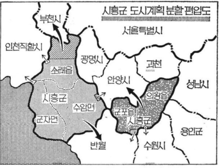2023.12.29/ #도시기록 #지도 #옛시흥군 / 조선일보 기사 삽화(1984.12.01일자) 시흥군 도시계획 분할 편입 이미지. 군포와 의왕, 수암면 일부가 안양시로 편입되는 계획이 추진됐었다.