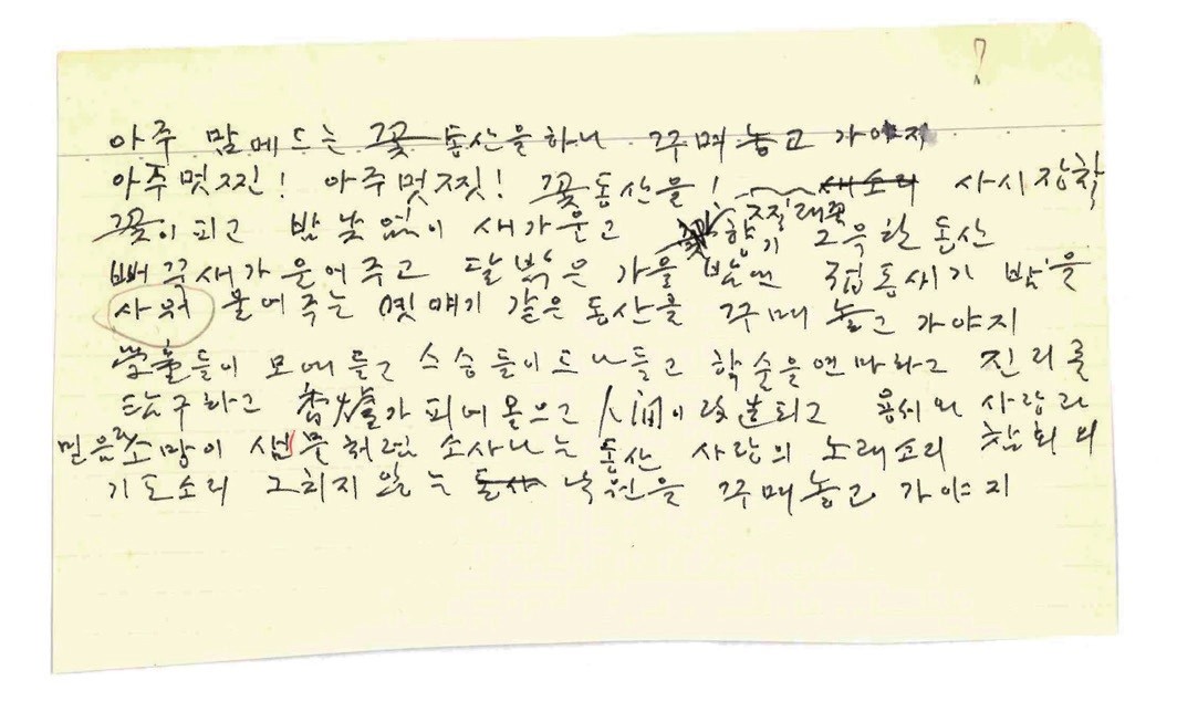 “아주 맘에 드는 꽃 동산을 하나 꾸며 놓고 가야지. 아주 멋진! 아주 멋진! 꽃 동산을! 사시 장철 꽃이 피고 밤낮 없이 새가 울고 찔레꽃 향기 그윽한 동산 뻐꾹새가 울어주고 달 밝은 가을밤엔 접동새가 밤을 새워 울어주는 옛 얘기 같은 동산을 꾸며 놓고 가야지. 學生들이 모여 들고 스승들이 드나들고 학술을 연마하고 진리를 탐구하고 香爐가 피어오르고 人間이 改造되고 용서와 사랑과 믿음과 소망이 샘물처럼 솟아나는 동산, 사랑의 노래소리, 참회의 기도소리 그치지 않는 낙원을 꾸며 놓고 가야지.”