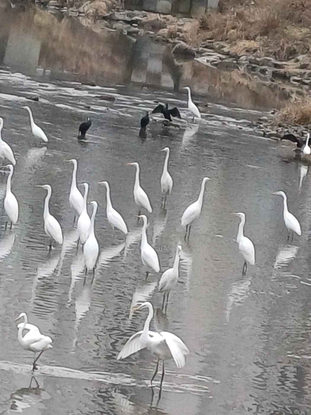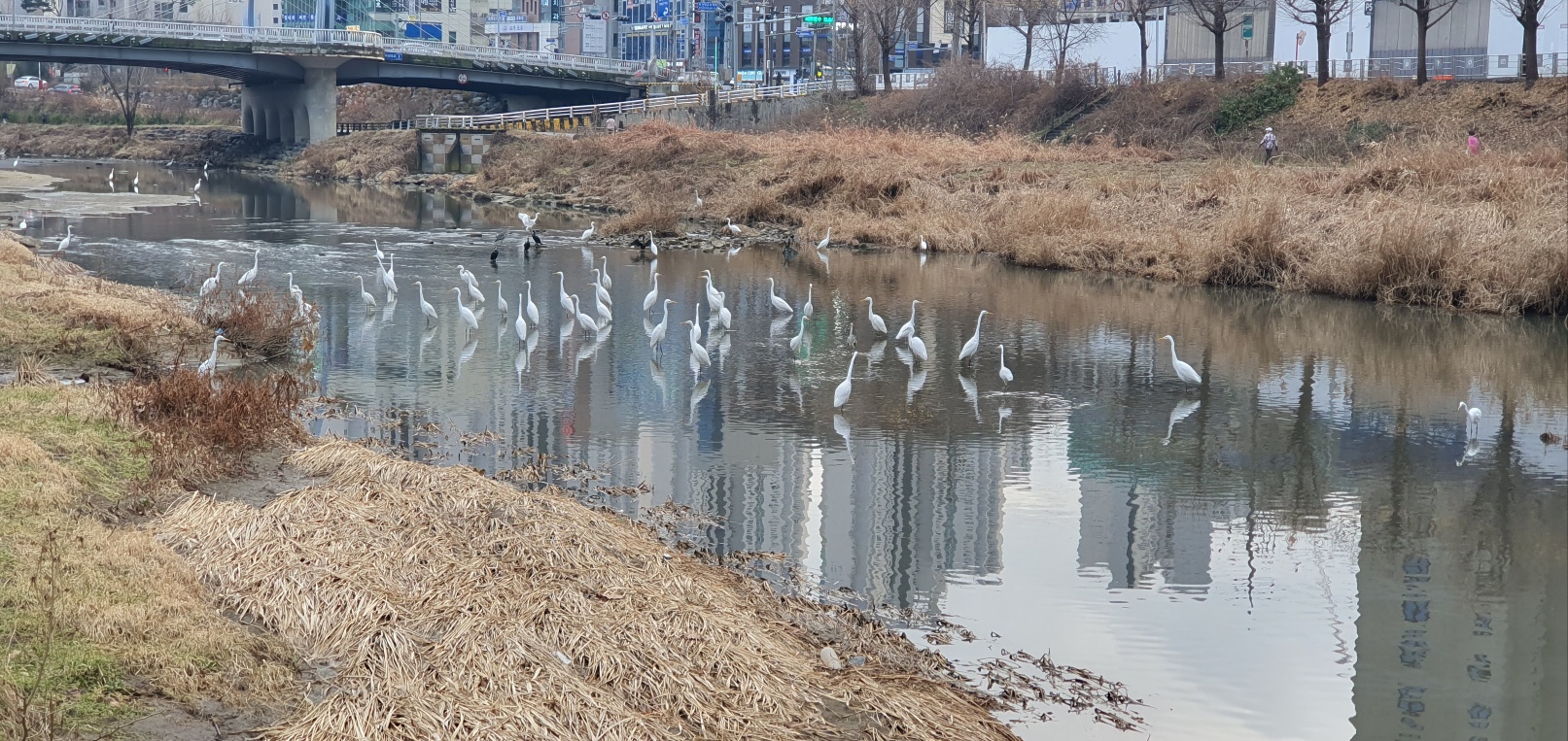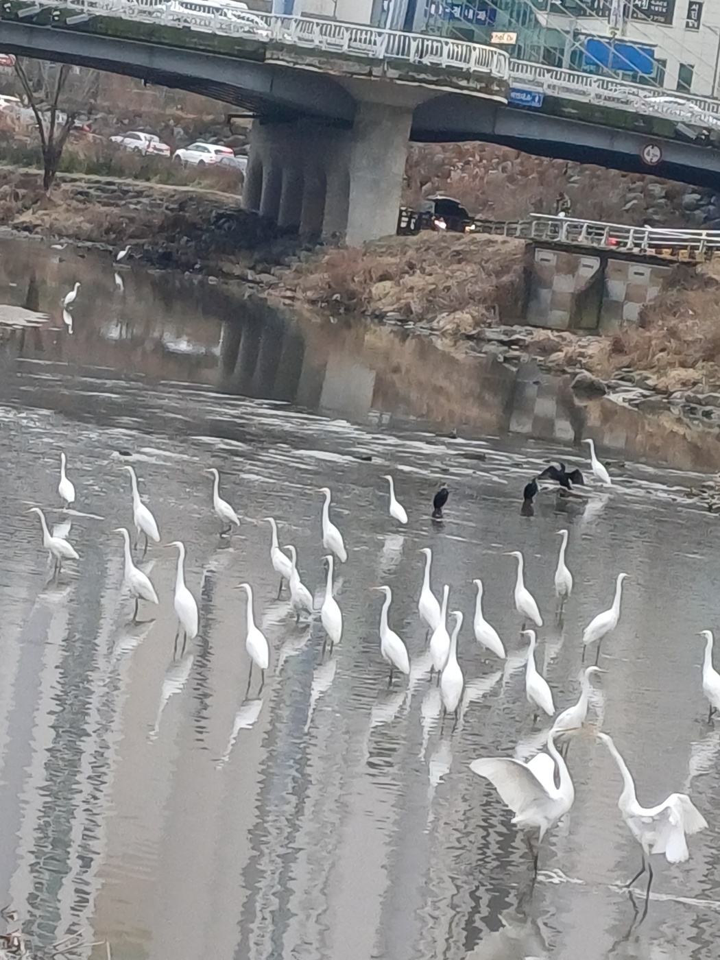 2023.12.31/ #도시기록 #안양천 #백로떼 수년전부터 겨울이 되면 안양천과 학의천에 몰려드는 백로떼. 지난주(24일)에는 학의천 내비산교에 몰려 있더니 오늘(31일)은 안양천 비산대교 근처에 몰려있다. 민물가마우지도 보이고, 이곳에서는 좀처럼 볼수 없던 물닭도 함께 어울려 노닌다.