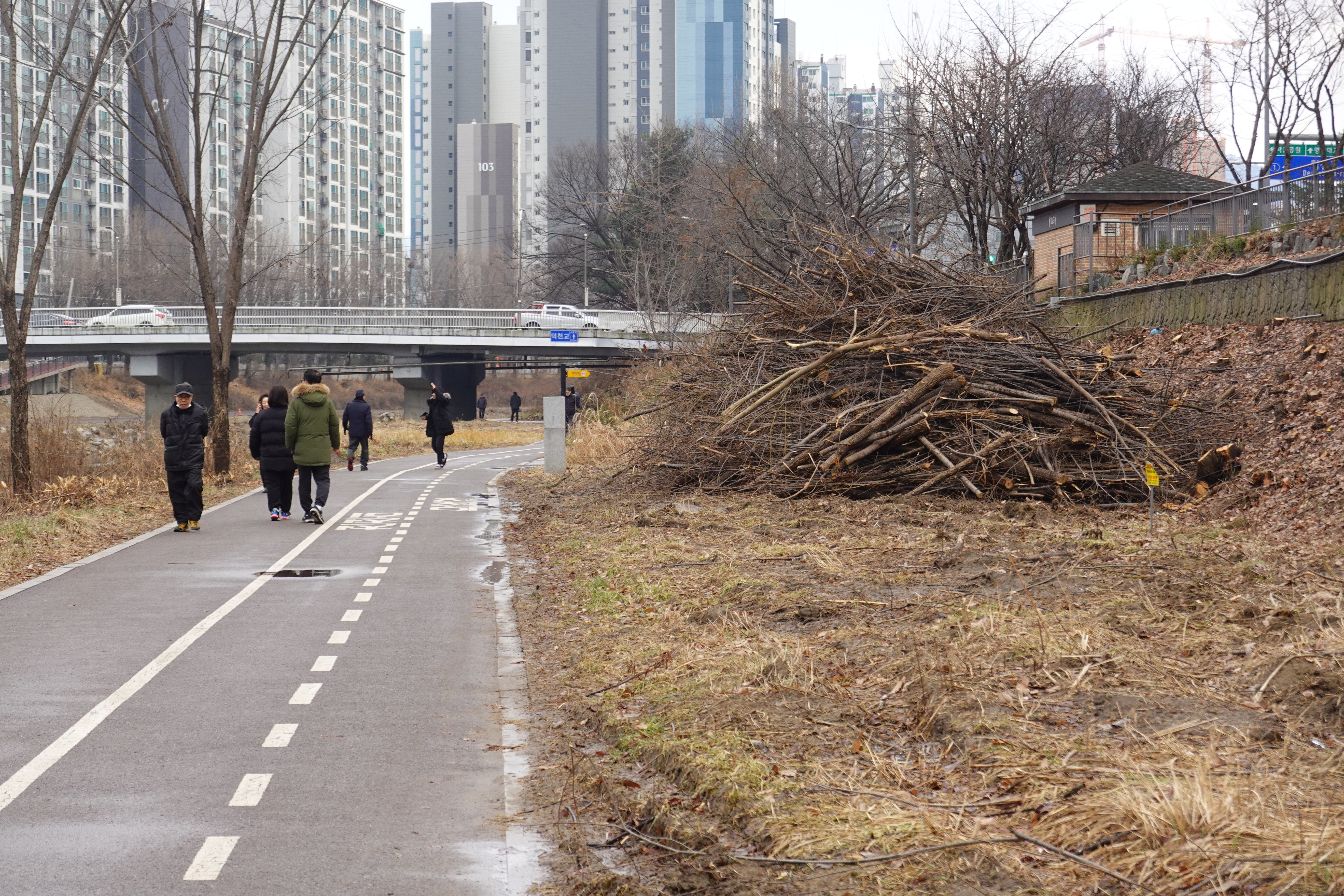 2023.12.31/ #도시기록 #안양천 #나무 #절단 #싹뚝/ 안양천에서 나무들이 또다시 수난을 당하고있다, 2023년의 마지믹날인 지난 12월31일 안양천을 걷던중 쌍개울 건너편 덕천교와 비산펌푸장 주변에 심어진 나무들이 니무 밑둥까지 몽땅 베어진 모습이 목격됐다. 안양시가 수년전부터 안양천과 비롯한 학의천 등 관내 지천에 대해 여름철 치수대책 등을 이유로 천변에 심어진 나무들을 대부분 제거한데 이어 뚝방까지 획대하는 것으로 보인다.