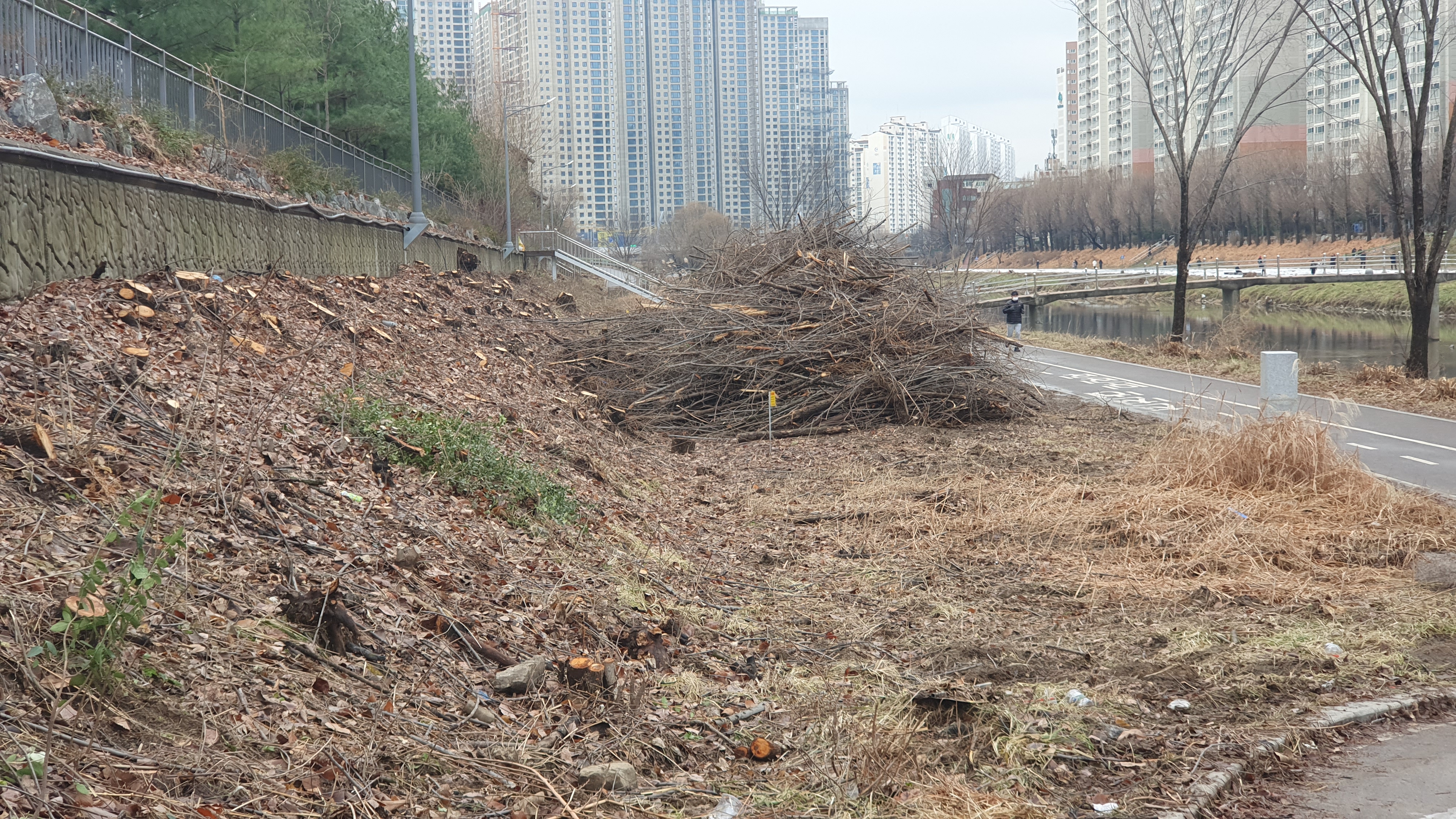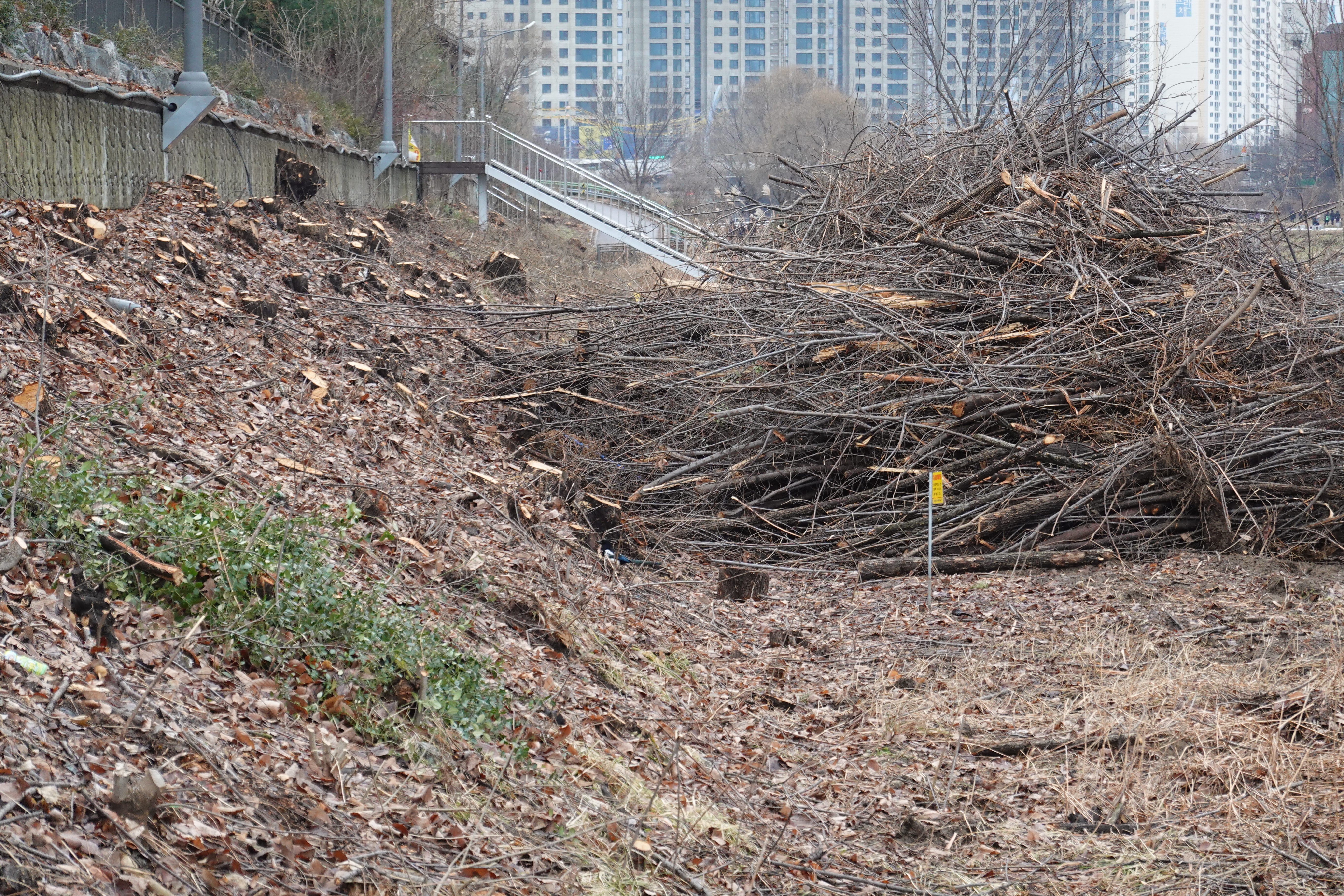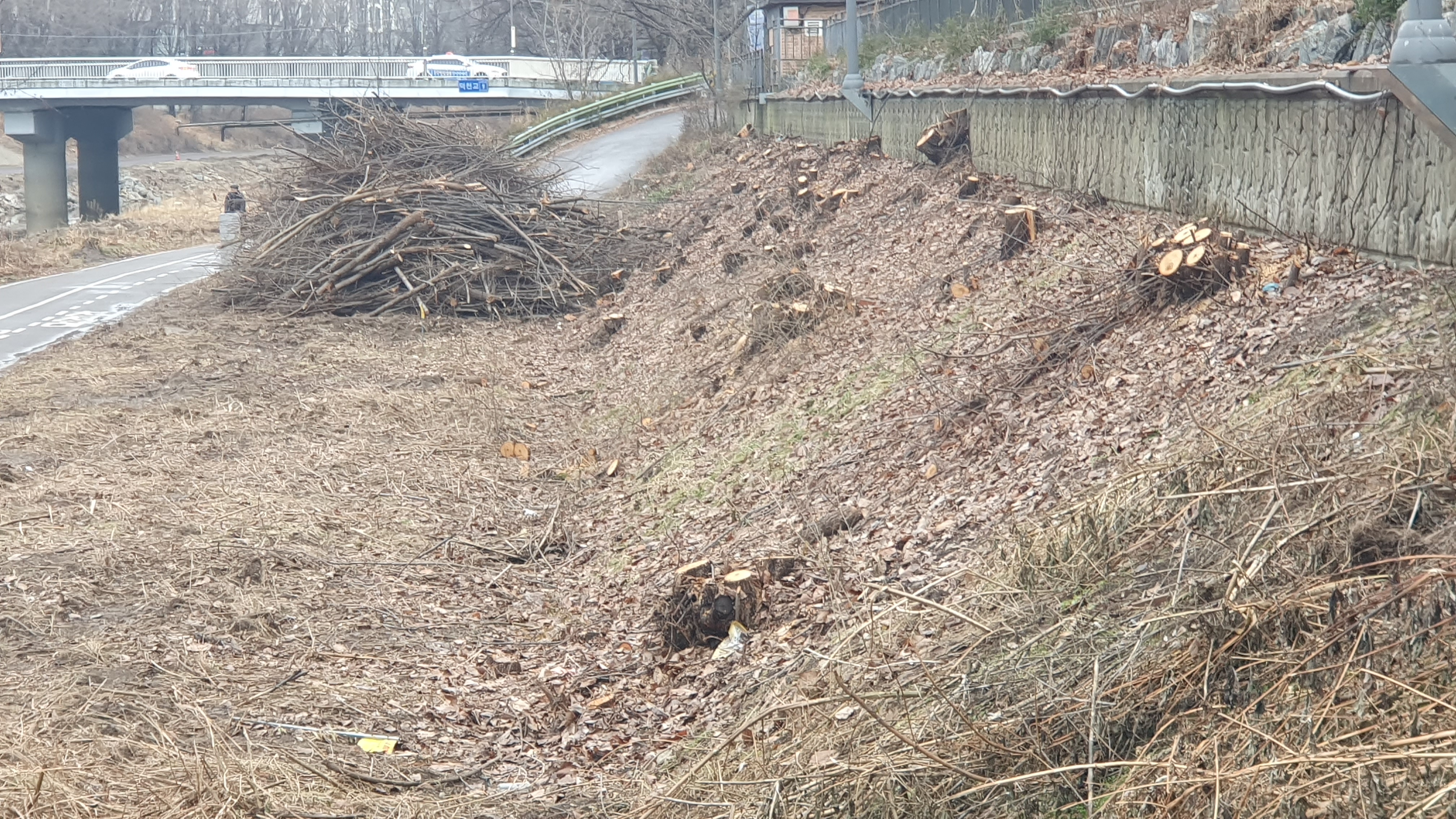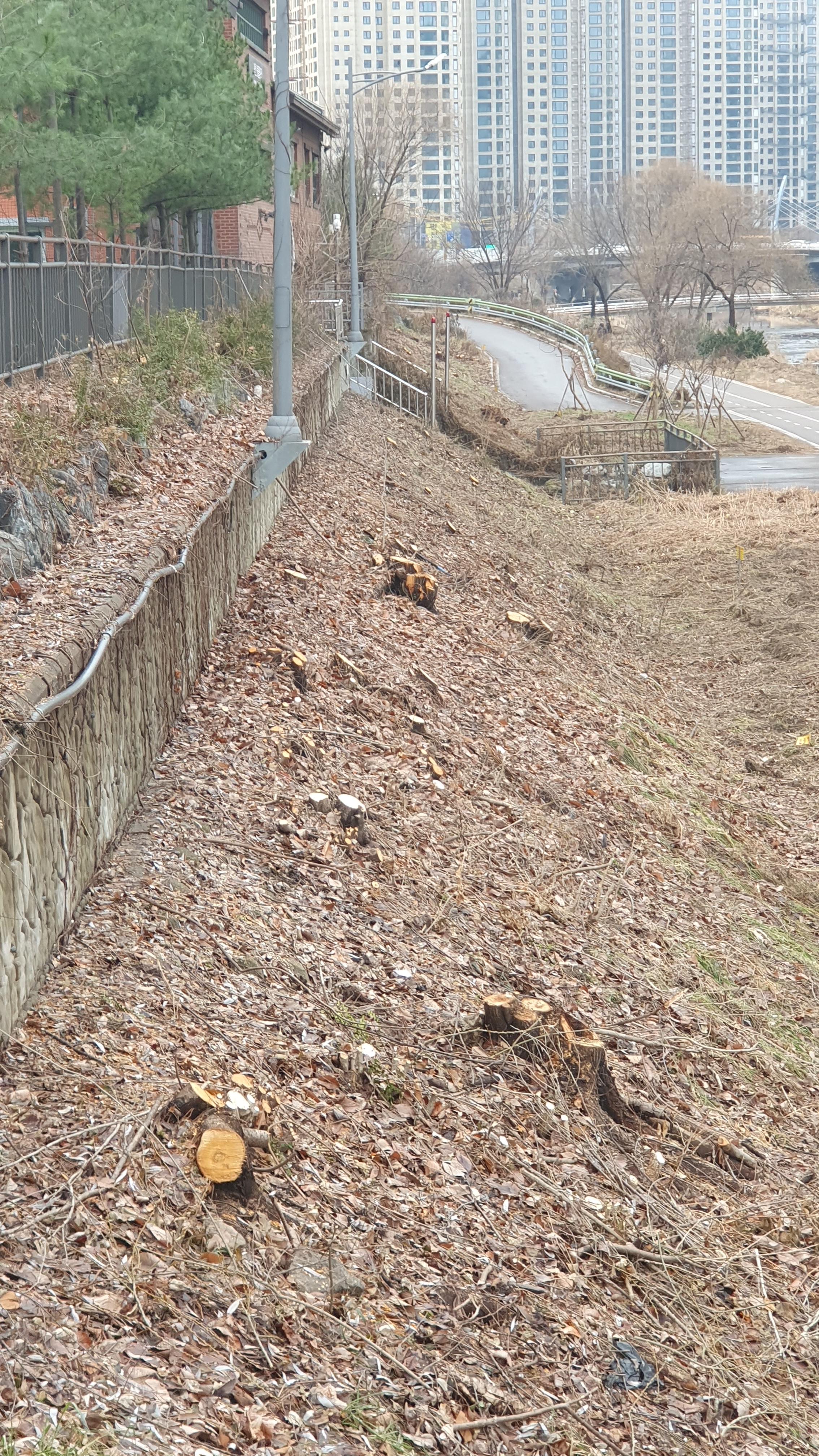 2023.12.31/ #도시기록 #안양천 #나무 #절단 #싹뚝/ 안양천에서 나무들이 또다시 수난을 당하고있다, 2023년의 마지믹날인 지난 12월31일 안양천을 걷던중 쌍개울 건너편 덕천교와 비산펌푸장 주변에 심어진 나무들이 니무 밑둥까지 몽땅 베어진 모습이 목격됐다. 안양시가 수년전부터 안양천과 비롯한 학의천 등 관내 지천에 대해 여름철 치수대책 등을 이유로 천변에 심어진 나무들을 대부분 제거한데 이어 뚝방까지 획대하는 것으로 보인다.
