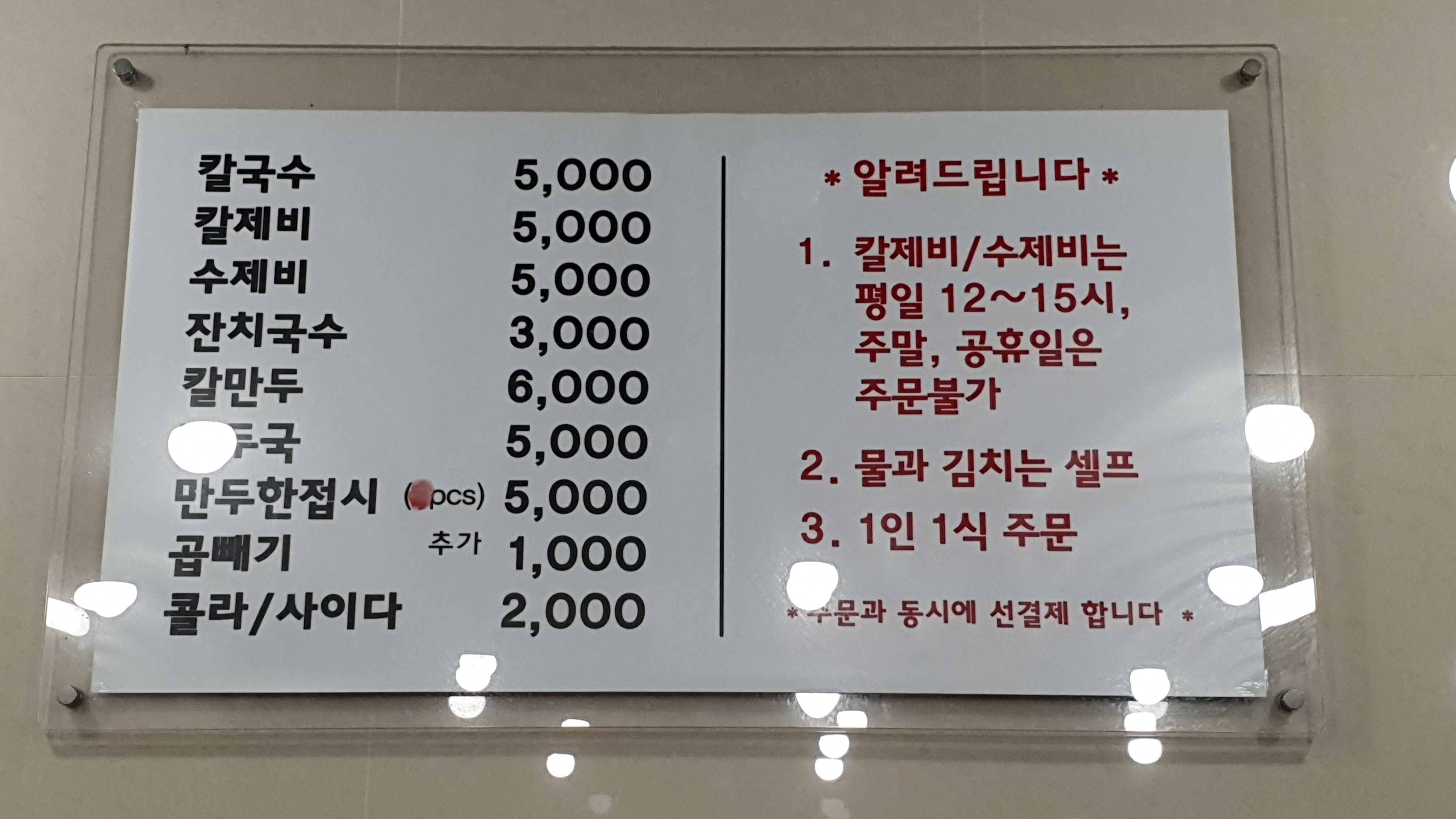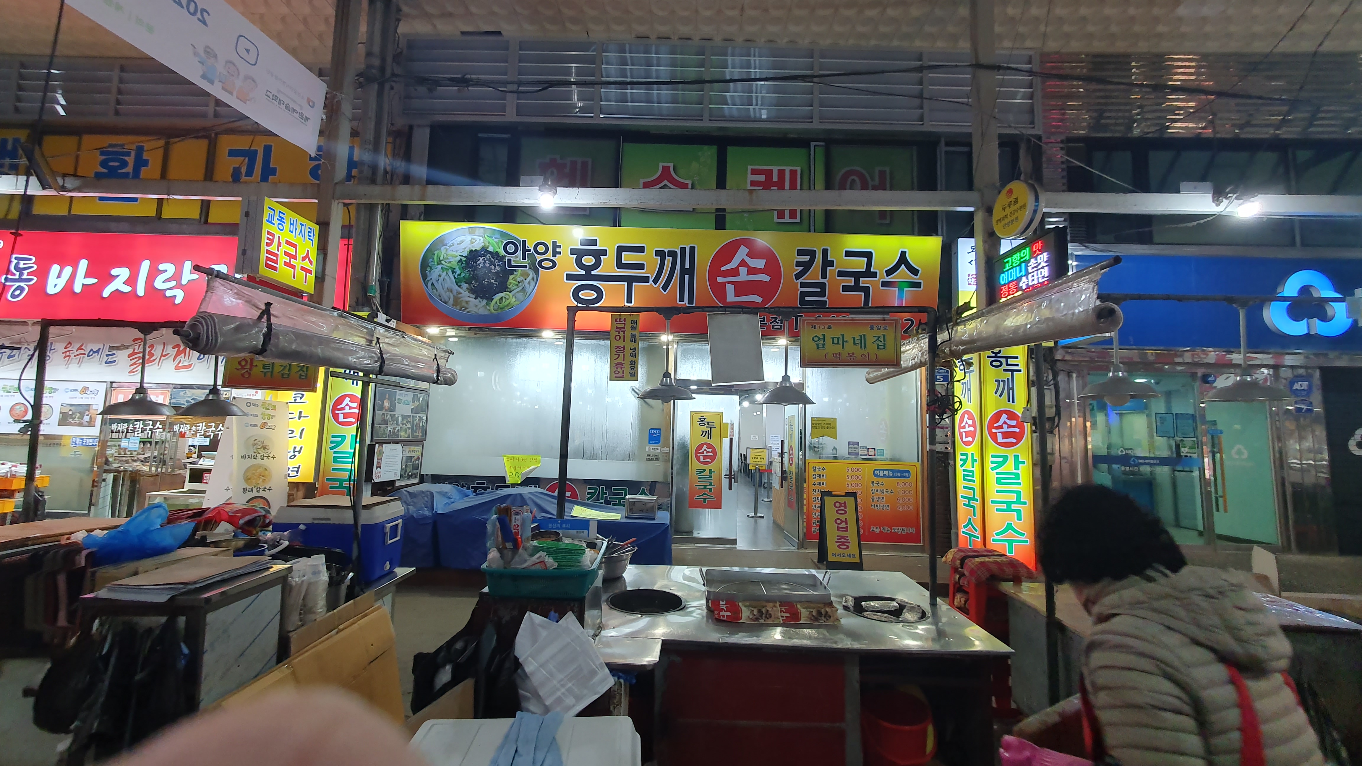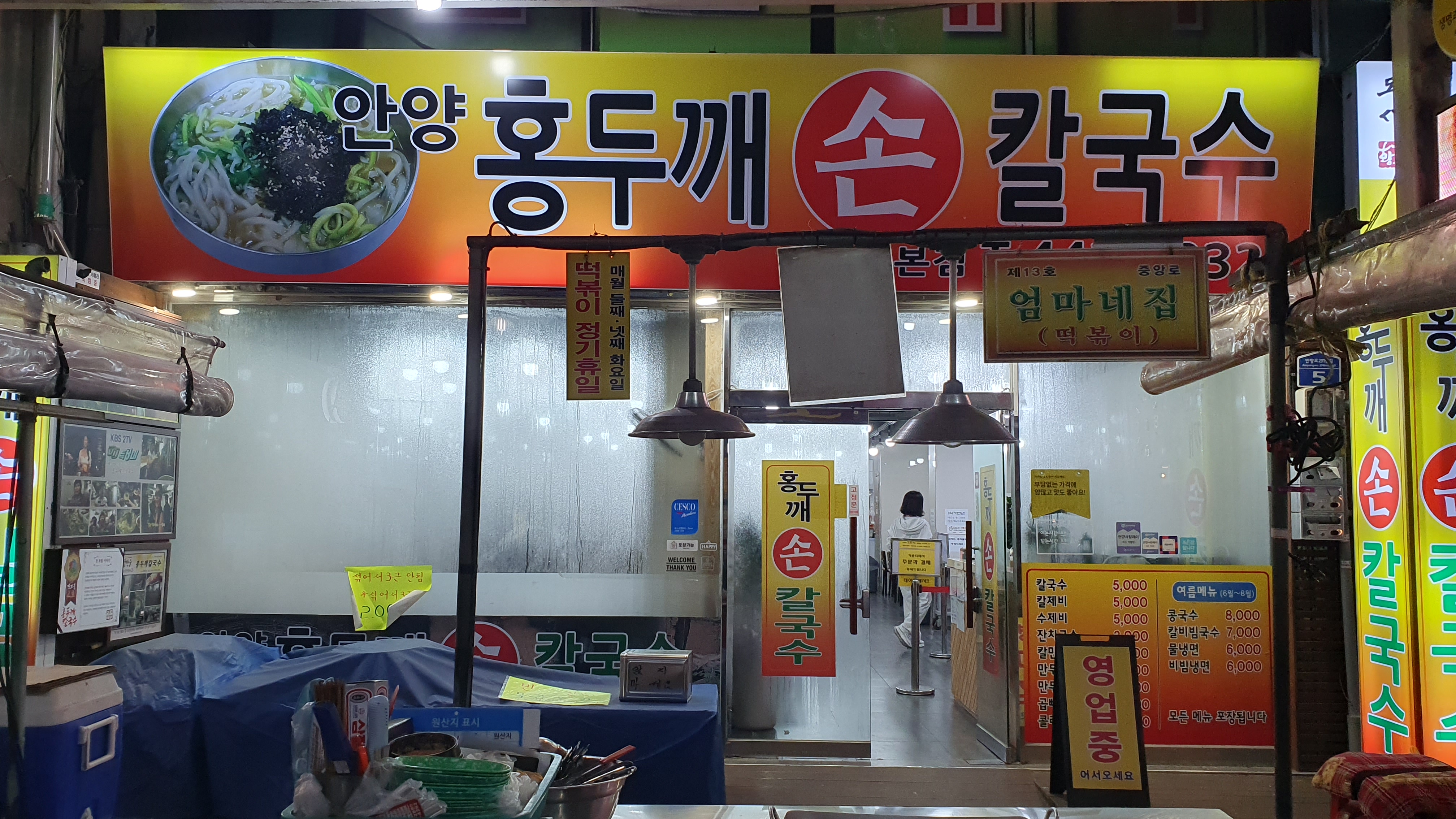 안양 중앙시장 홍두깨칼국수는 칼국수 1그릇에 2500원(2012년-2015년 3000원) 할때부터 다녔는데 지금은 가격이 5000원이 됐다,.또 가게도 한곳뿐이었는데 중양시장안에 2호점(청바지골목에 있다가 중앙통 골목으로 이전)을 추가로 낼만큼 입소문났다, 내가 주로 가는 가게는 1호점이고 최애메뉴는 여름철 콩국수로 수타면발이 최고다. 또 칼국수보다는 칼제비(칼국수+수제비)를 주문하는데 주말에는 바빠서 메뉴에 없고 평일에 맛볼수 있다.