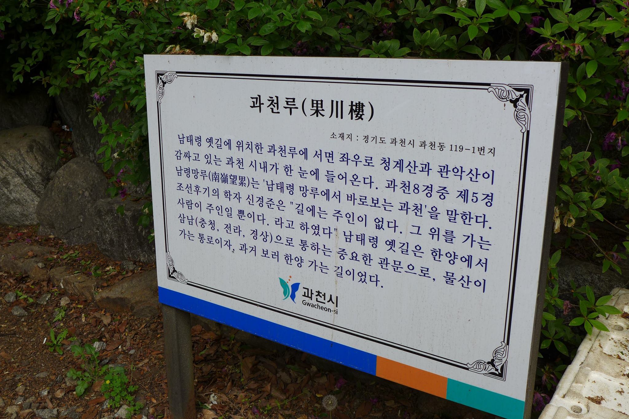 며칠씩 묵으면서 과거장에서 갖추어야 할 예절과 기풍등을 매사에 빈틈없이 익히 고 수련한 다음 과거 전날은 이 산 자락에서 흐르는 맑은 시냇물에 몸을 정갈하게 닦고, 서울로 올라갔다고 합니다. 해서 과거를 보 러가는 과객들이 목욕을 하는 시내라 해서 과천(科川)이라는 지명이 붙게 되었다고도 하고 과거 보러 가는 과객들이 묵어가는 촌 이라 해서 과촌이라 부르게 되었다고도 하는데 시대가 바뀌면서 점차 실과 果자를 붙혀서 부르게 된 오늘의 과천이라고 전해옵니 다.