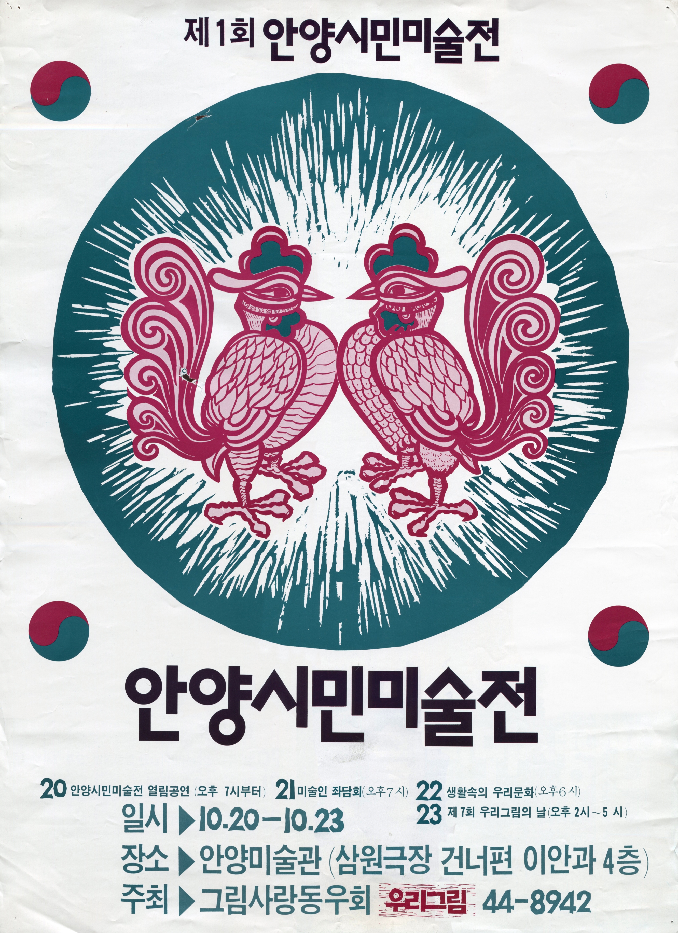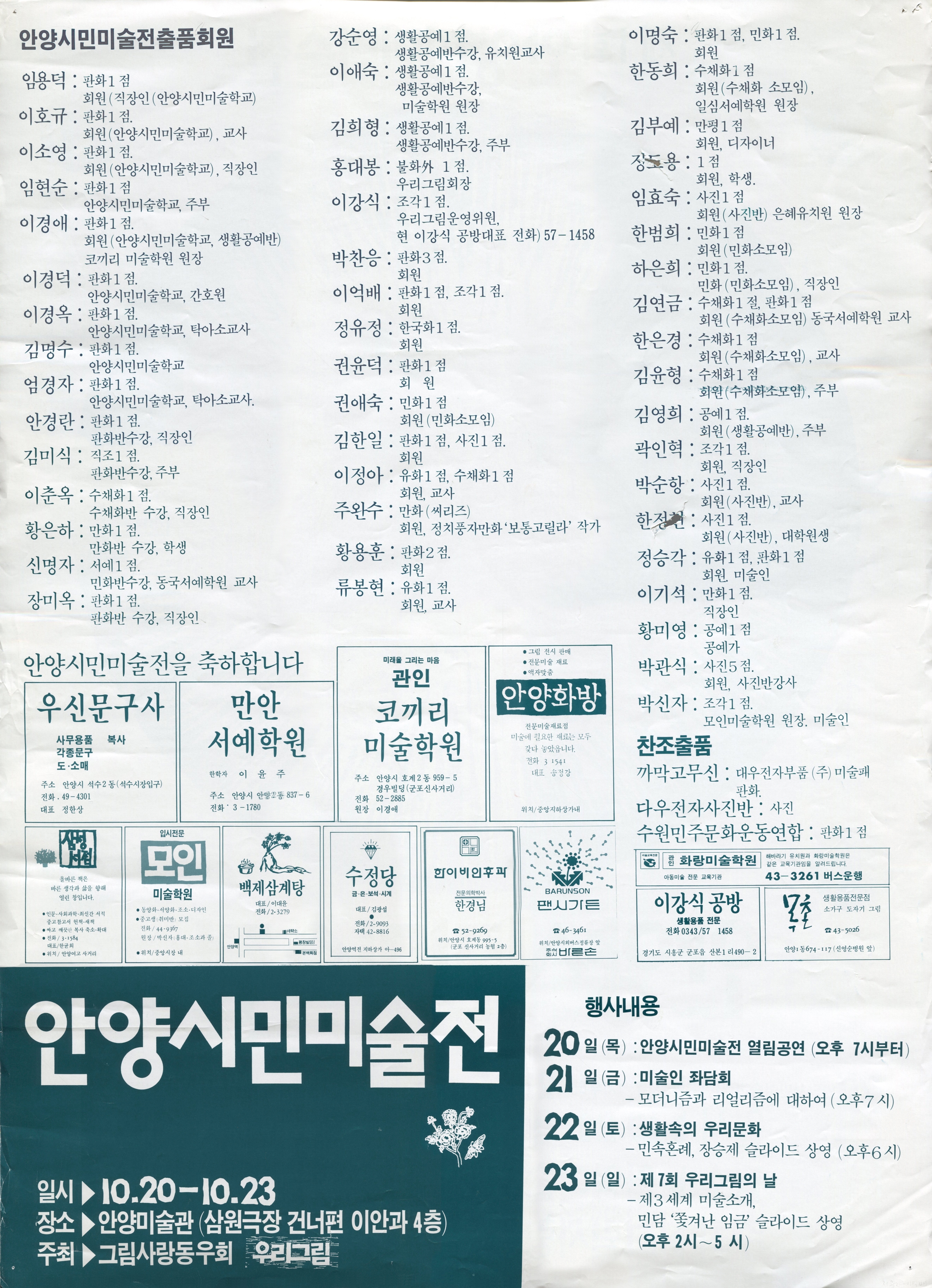 2024.01.09/ #아카이브 #기록 #안양 #미술전 #포스터/ 1988년 10월 20일부터 23일까지 안양미술관에서 개최된 《제1회 안양시민미술전》의 홍보 포스터로 이억배 작가가 보관해왔던 자료다. 제1회 안양미술전은 그림사랑동우회 '우리그림'에서 주최하였는데 참여작가는 임용덕, 이호규, 이소영, 임현순, 이경애, 이경덕, 이경옥, 김명수, 엄경자, 안경란, 김미식, 이춘옥, 황은하, 신명자, 장미옥, 강순영, 이애숙, 김희형, 홍대봉, 이강식, 박찬응, 이억배, 정유정, 권윤덕, 권애숙, 김한일, 이정아, 주완수, 황용훈, 류봉현, 이명숙, 한동희, 김부예, 장도용, 임효숙, 한범희, 하은희, 김연금, 한은경, 김윤형, 김영희, 곽인혁, 박순항, 한정현, 정승각, 이기석, 황미영, 박관식, 박신자 등 지금은 중장년으로 미술계에서 이름을 날리고 있는 유명한 작가들이 참여했었다.