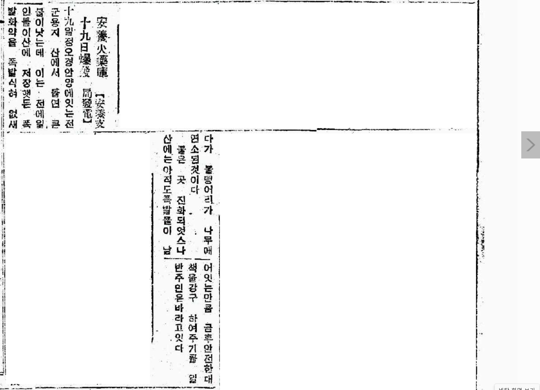 “19일 정오경 안양에 잇는 전군용지 산에서 돌연 큰불이 났는데 이는 전에 일인들이 산에저정했든 폭발화약을 폭발 식혀 업새다가 불덩어리가 나무에 연소된 것이다 불은 곧 진화되었스나, 산에는 아직도 폭발물이 남어있는만큼 금후 안전한대책을 마련하여 주기를 일반주민들은 바라고 있다.“