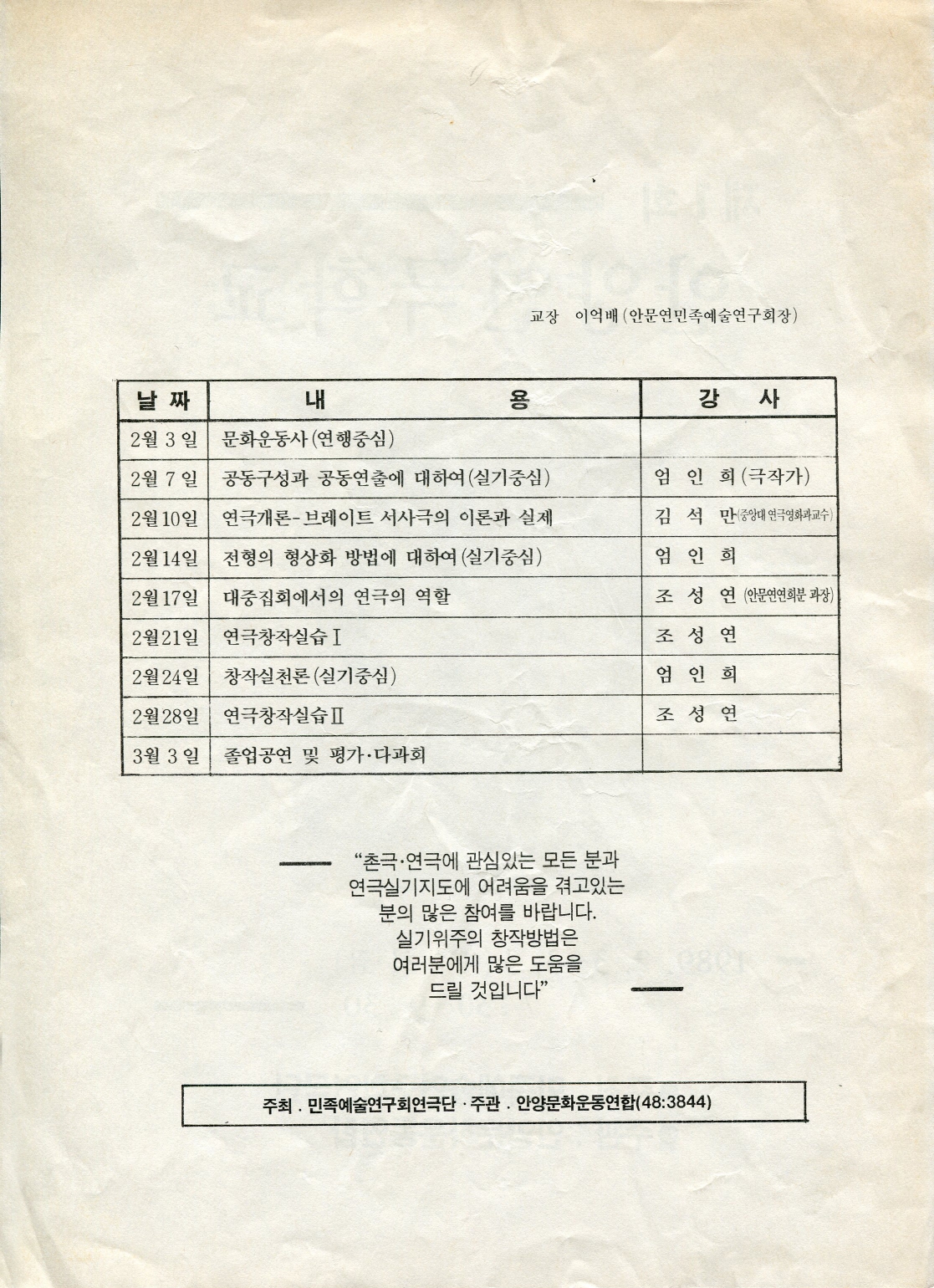 2024.01.26/ #아카이브 #유인물 #안양문화운동연합 #since1989/ 민족예술연국연구히에서 주최하고 안양문화예술운동연합에서 주관하여 1989년 2월에 개최된 제1회 안양연극학교를 홍보하는 유인물이다. 이억배 작가가 교장으로 있었으며 엄인희, 김석만, 조성연이 강사로 활동하였다.