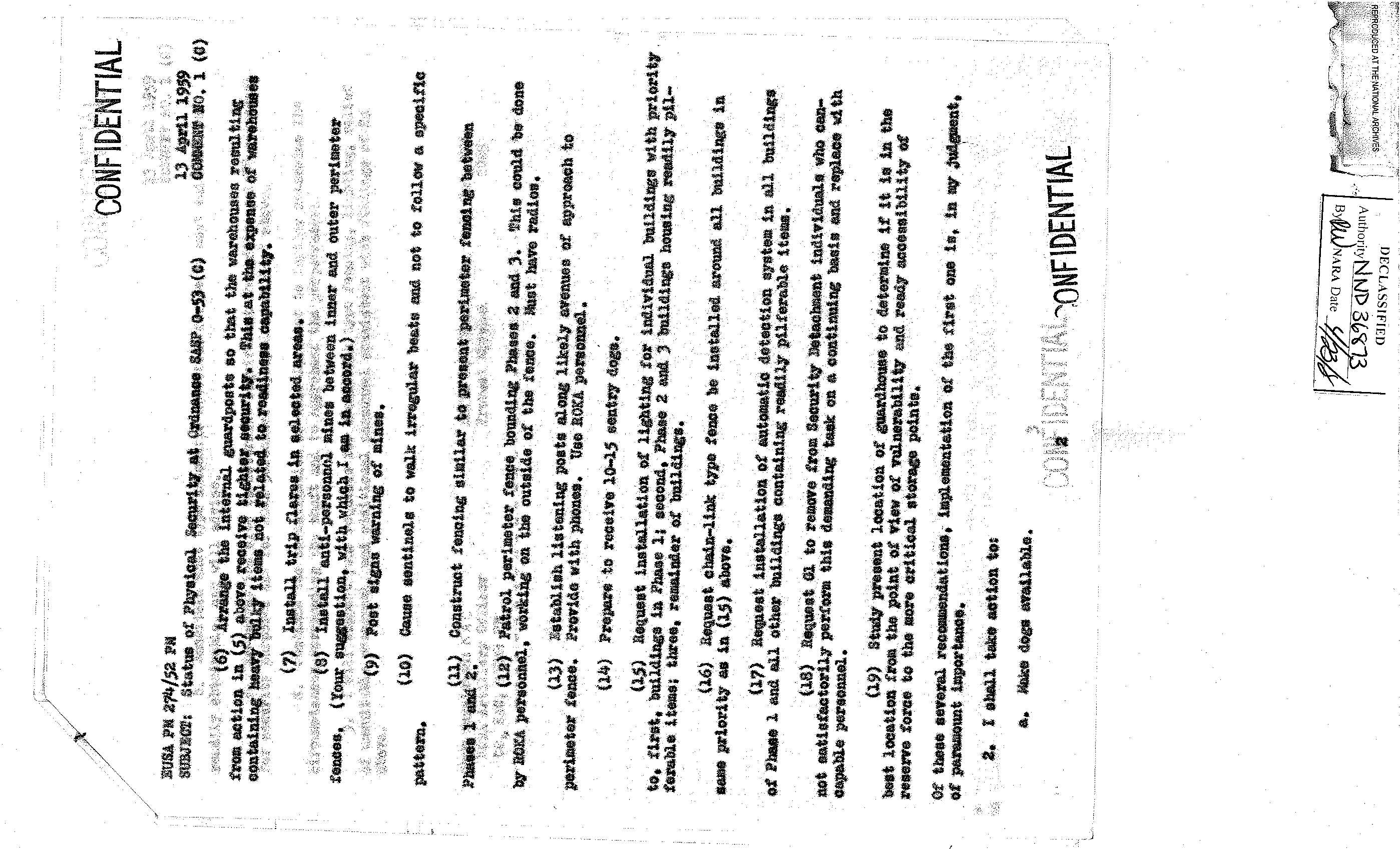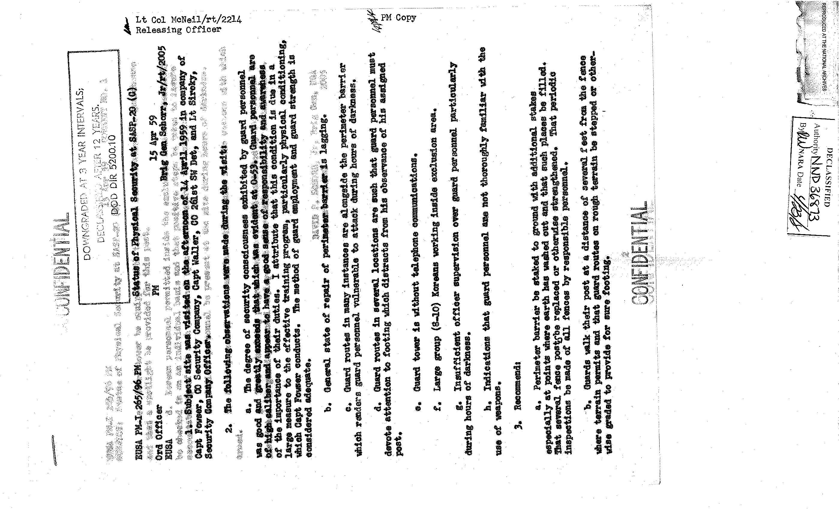 이 사료철은 헌병사령부(Office of the Provost Marshal) 보안 감사 사례 파일이다. 안양의 83병기대대(83rd Bt Ordnance) 방문과 보안 시설에 대한 감사 보고가 들어있다. 이 부대는 특수탄약을 관리하던 부대로, 탄약 벙커에 있던 전술 핵탄두와 로켓을 관리, 운용했다. 캠프 페이지(Camp Page)와 캠프 카이저(Camp Kaiser) MSA의 물리적 보안 상태, SASP-20의 물리적 보안(Physical Security) 상태에 관한 보고서 등이 들어 있다. 춘천의 캠프 페이지는 제4미사일사령부가 주둔했고, 핵무기가 배치되었던 곳이다.