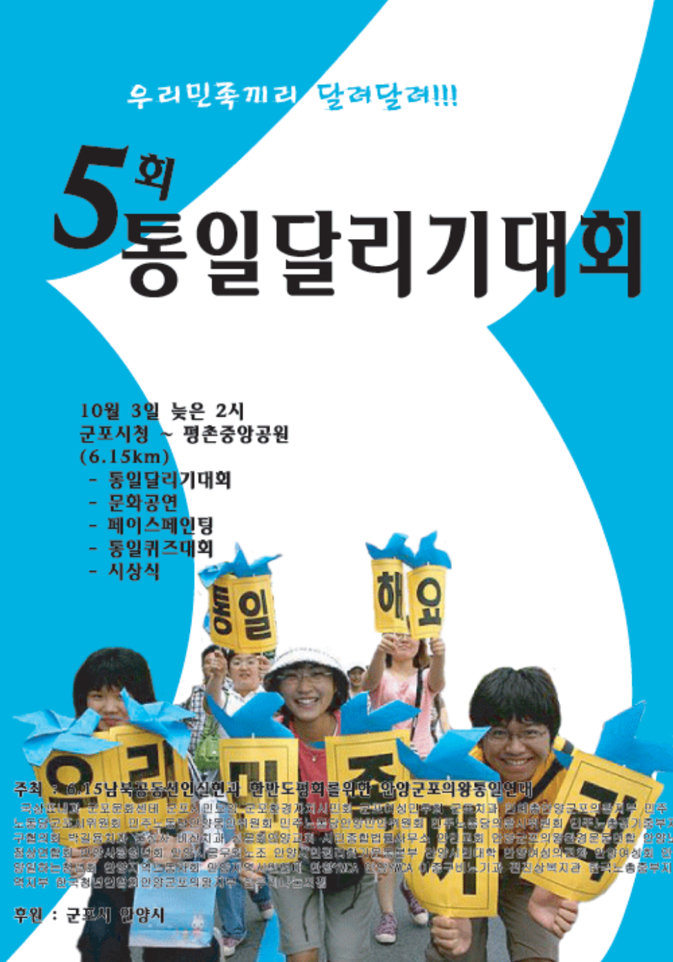 2004년에는 제4회 통일달리기 대회는 9월 19일 군포 산본중심상가를 출발해 (구)안양경찰서앞 사거리를 지나 안양 평촌중앙공원까지 약 6.15Km구간에서 진행하고 2005년 10월 3일에 제5회 대회, 2006년에 제6회 통일달리기 대회, 2007년 11월13일에 제7회 대회(안양시청-안양천)를 개최한 바 있다.