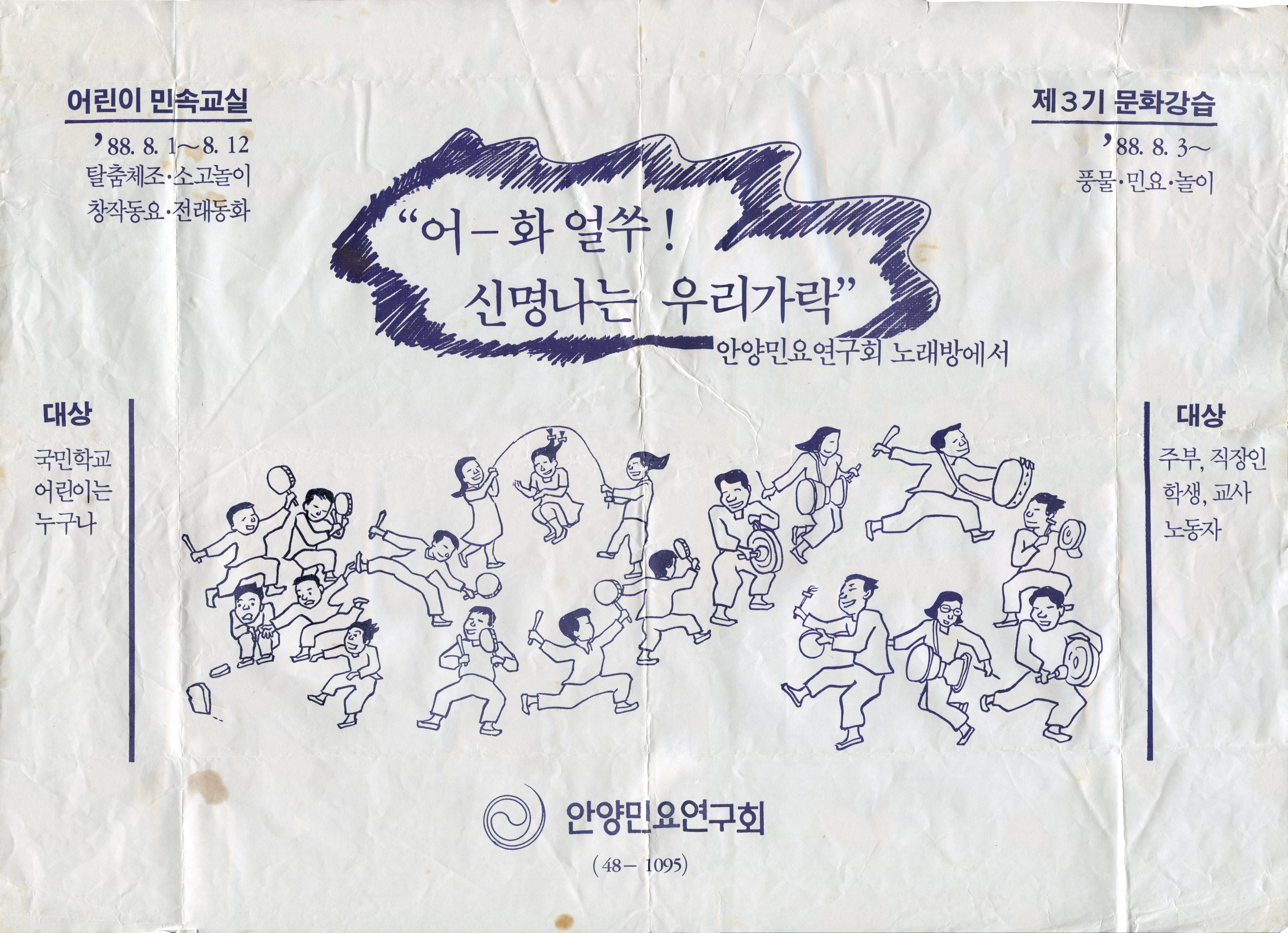 2024.02.01/ #아카이브 #옛기록 #리플렛 #포스터 #안양민요연구회 #since1988 #이억배컬렉션/ 안양민요연구회에서 1988년 만든 문화강습 포스터이다. 국민학생[초등학생]을 대상으로 하는 "어린이 민속교실"과 주부 ,직장인, 학생, 교사, 노동자를 대상으로 하는 "제3기 문화강습"을 홍보하고 있다. 박찬응 작가 전언에 의하면 포스터속 그림은 이억배 작가의 그림이라 한다.