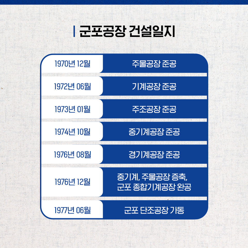 1975년 6월 10일, 드디어 군포 종합기계공장 건설을 시작했습니다. 이로써 연면적 9만 9173㎡ 규모의 군포공장은 경중기계류(輕重機械類)와 그 연관제품, 건설 중장비 및 각종 공작기계, 시멘트·섬유기계·운반하역 설비 등을 생산하는 국내 최대 단일 종합기계공장으로 위용을 드러냈습니다.