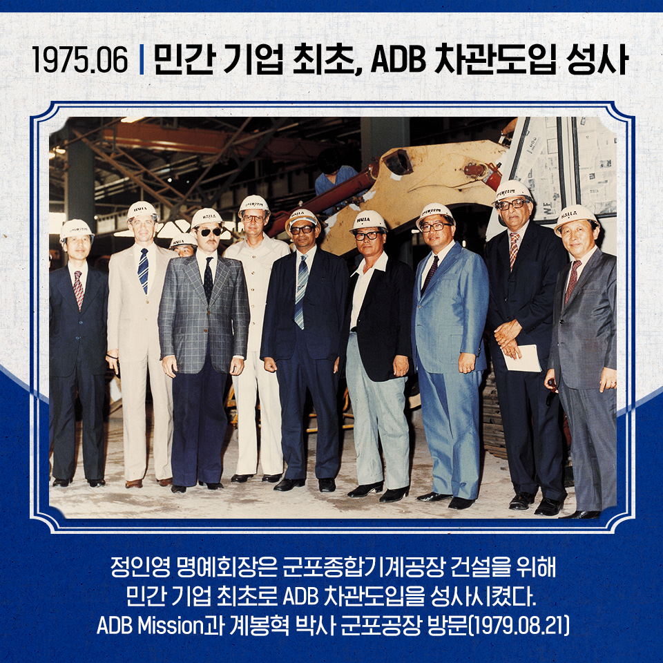 시큰둥하던 그들의 태도에서 미묘한 변화가 감지되었습니다. 결국 그는 ADB로부터 내부적으로 검토해보고 연락하겠다는 답변을 받습니다. 차관 교섭에서 이 같은 약속은 반 성사나 다름없다는 사실을 누구보다 잘 아는 그였습니다. 그의 예상은 적중했습니다. 1974년 10월 현지조사 내한과 두 달 뒤 ADB 평가조사단 내한으로 이어졌습니다. 군포와 안양공장 둘러본 그들은 국내산업 현황 점검과 상공부 협의를 거쳐 잠정 합의에 도달했습니다. 1975년 6월, 현대양행은 마침내 민간 기업 최초로 아시아개발은행(ADB)에 1,750만 달러의 차관계약을 체결했습니다.