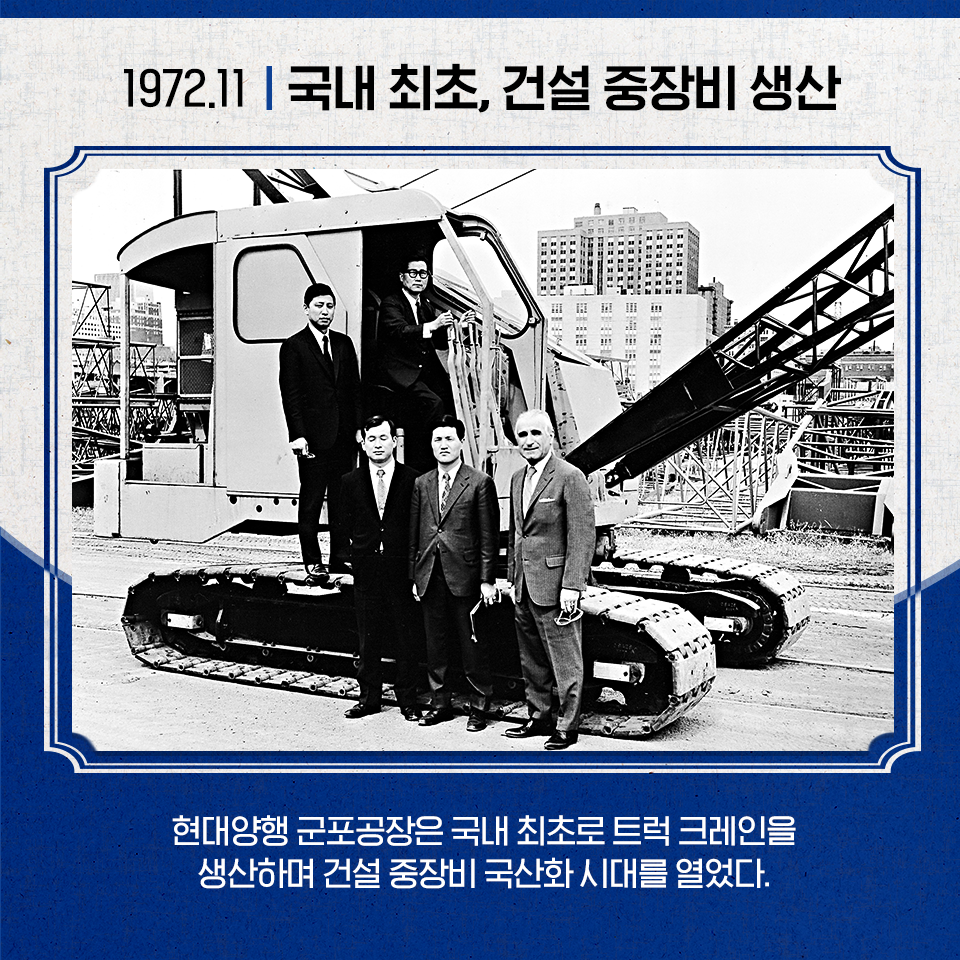 기계공장을 1972년 6월 완공하고 그 해 11월 국내 최초로 트럭크레인을 생산하면서 건설 중장비 국산화 시대를 활짝 열었습니다. 군포공장은 이후 1973년 1월 주조공장, 1974년 10월 중기계공장, 1976년 8월 경기계공장을 차례로 준공하며 한국 최고의 기계공장으로 자리매김했습니다.