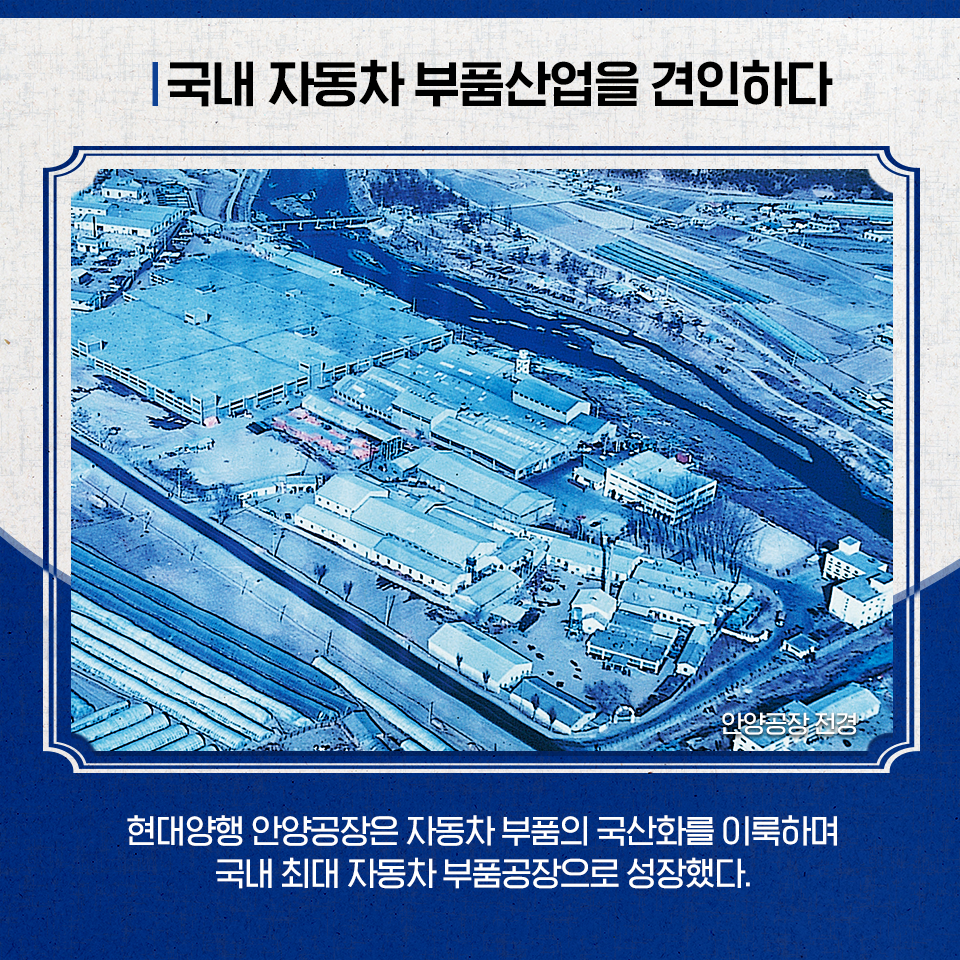 현대양행은 안양공장의 성장에 발맞춰 그때까지 수입에 의존해오던 자동차부품의 연차적 국산화를 추진하기 시작했습니다. 핵심 기술을 확보하지 않고서는 장기적 성장을 담보할 수 없다는 정인영 명예회장의 의지를 강력히 반영한 결과였습니다.