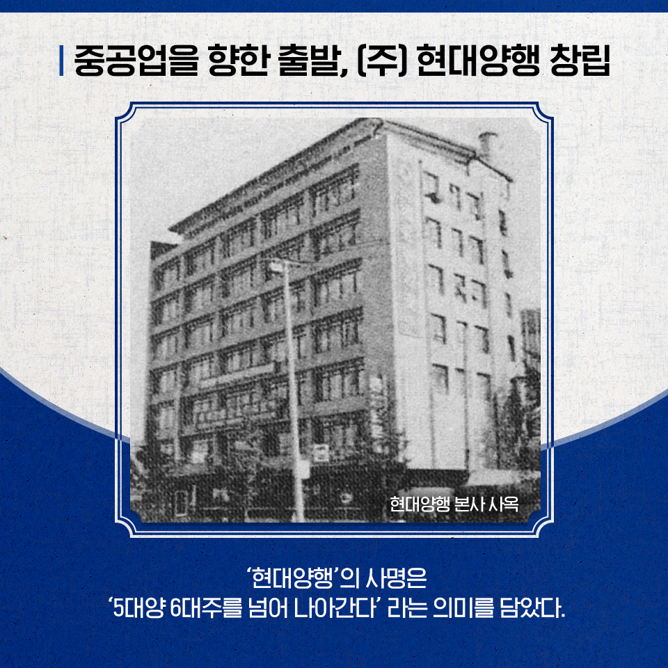 1962년 10월 1일, 정인영 명예회장은 ‘5대양 6대주를 넘어 나아간다’는 뜻을 담아 ‘현대양행’이라는 사명의 주식회사를 설립했습니다. 이것이 중공업을 통해 한국경제 발전을 이룩하겠다는 꿈을 향한 첫걸음이었습니다.