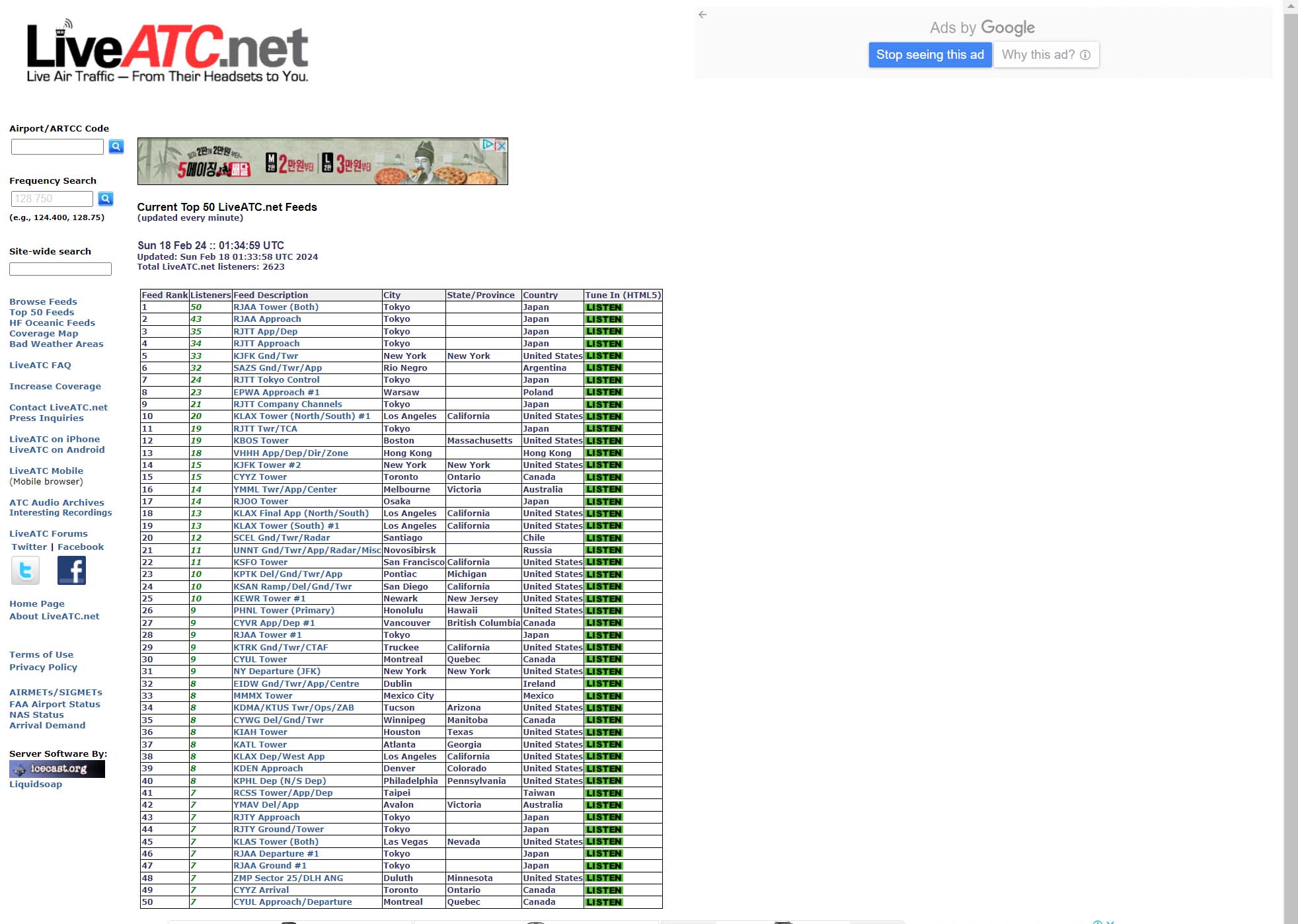 'live atc'(https://www.liveatc.net/)에서는 전세계 항공기와 관제탑과의 교신 내용을 들을 수 있다. 911 등의 항공기 테러를 겪은 현시대의 사람들에게서 항공보안에 관련된 정보를 쉽게 얻을 수 있다는 것은 의아하지만. 항공에 관심있는 사람에게는 보물상자같은 곳이다.