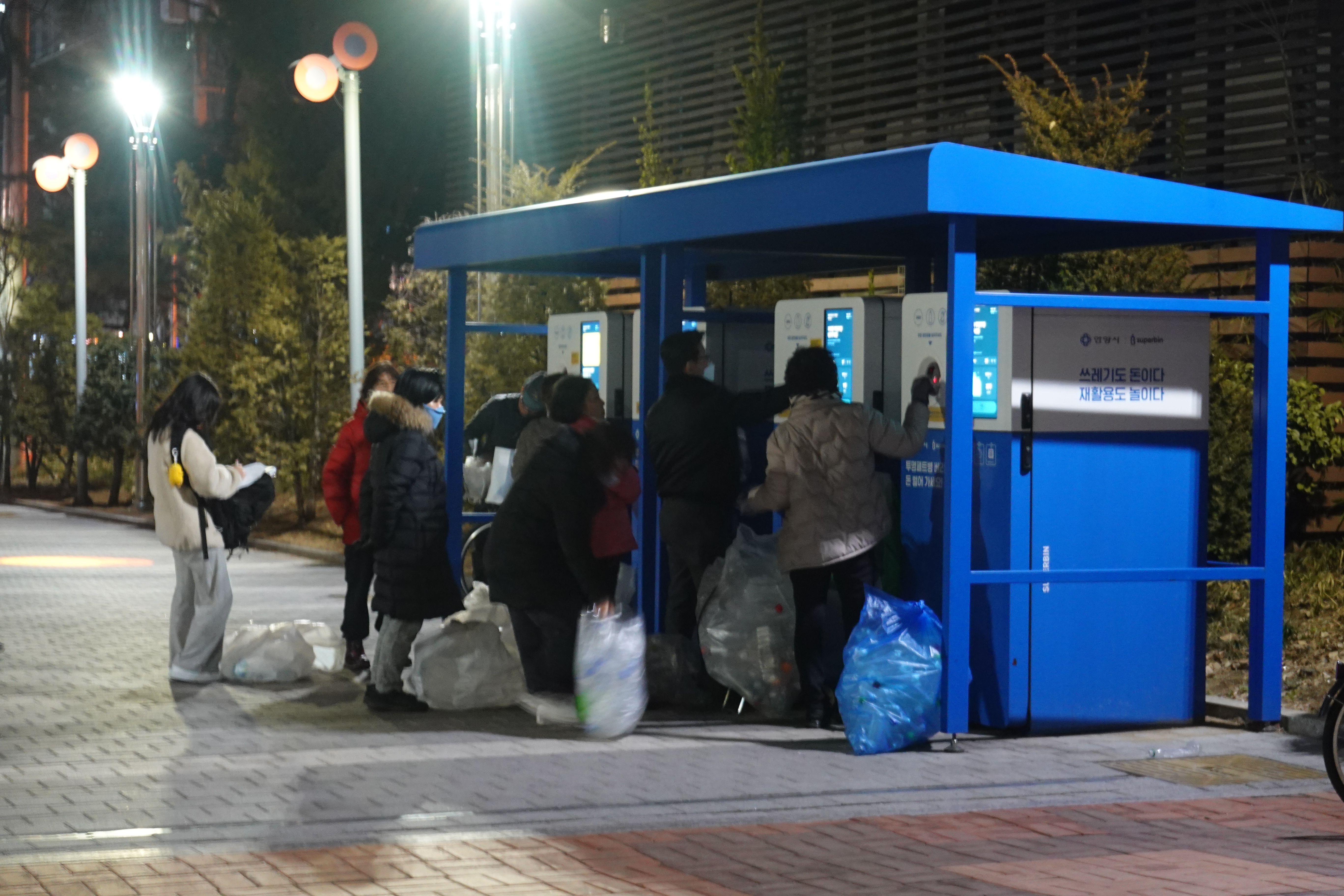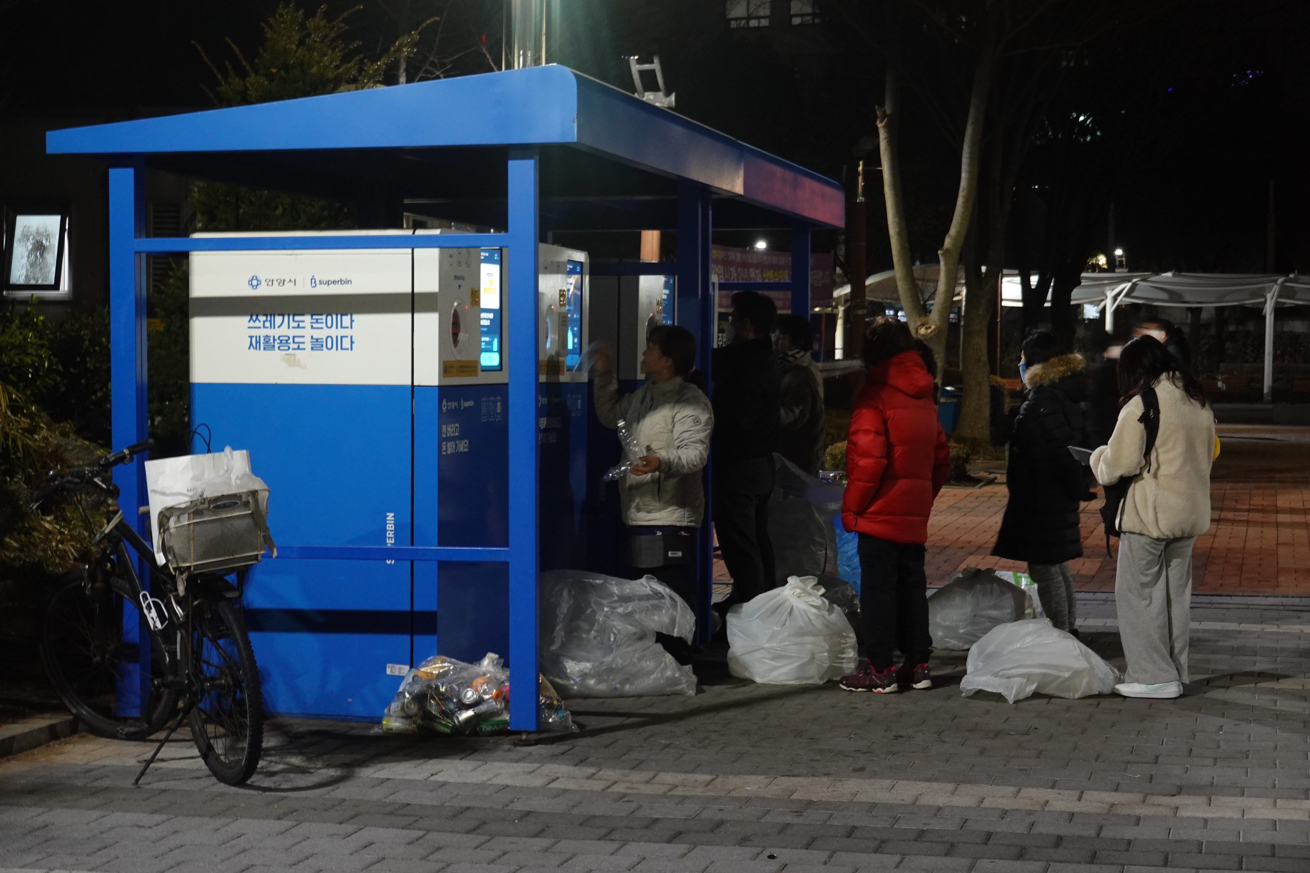 2024.02.17/ #도시기록 #수퍼빈 #안양 #면학공원 #페트병 #자원회수자판기/ 명학공원에 살치된 3대의 자원회수자판기 수퍼빈. 안양8동 명학공원은 안양시에서 수퍼빈 이용자가 가장 많은곳 중 한곳으로 이날도 늦은 저녁까지 긴줄이 섰다. 주민들이 들고나온 페트병이 각자 한보따리로 뒷쪽에 서 계신분은 자판기가 꽉차 저장공간 부족으로 이용 못하는것은 아닌지 걱정이다. 수퍼빈 이용자 많은 동 및 개인을 조사해 년말에 표창해도 좋을듯 싶다. 안양8동의 어느분은 페트병을 수거헤 수퍼빈에 적립하고 일정 금액이 되면 불우이웃돕기에 사용하며 좋은 일을 한다.