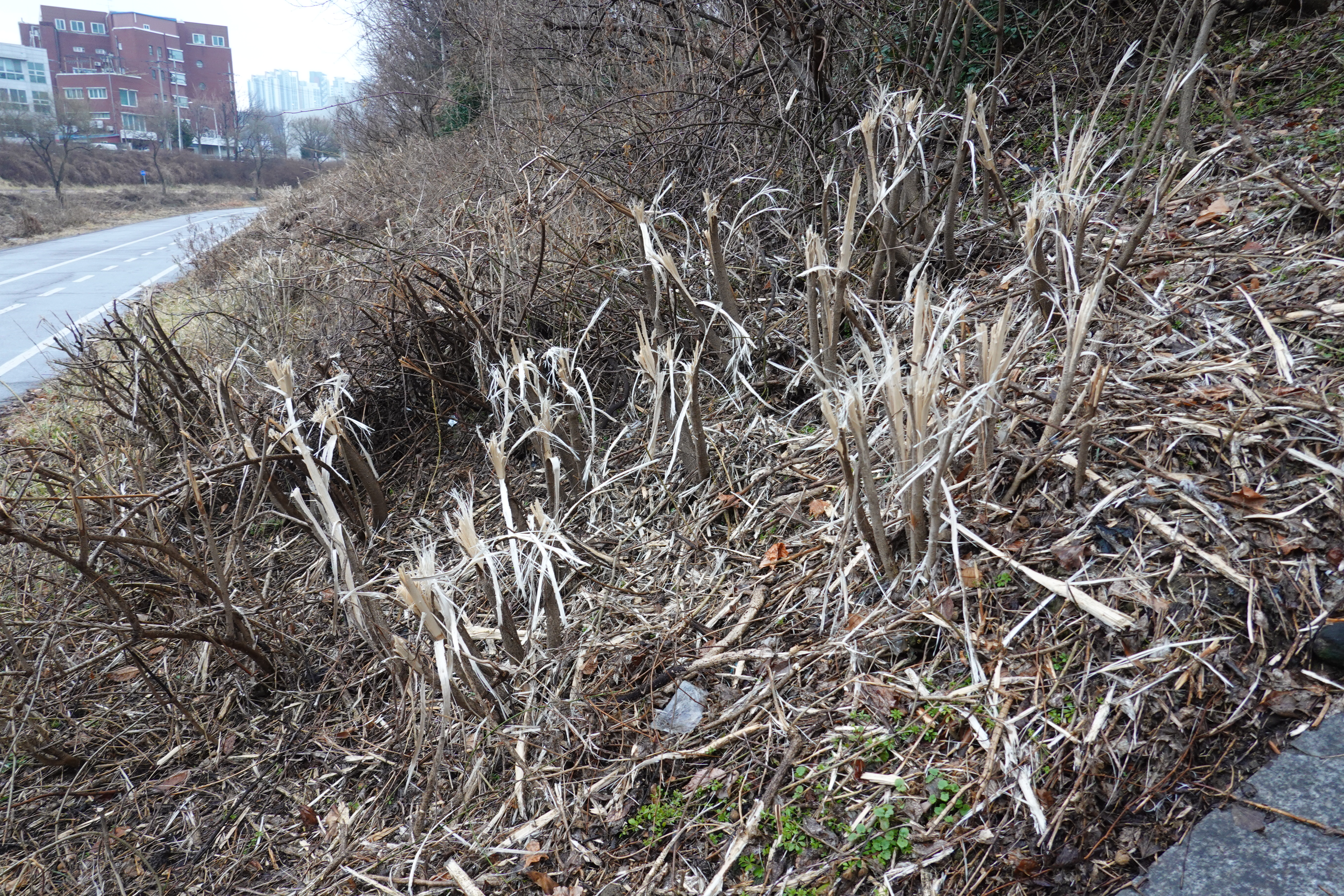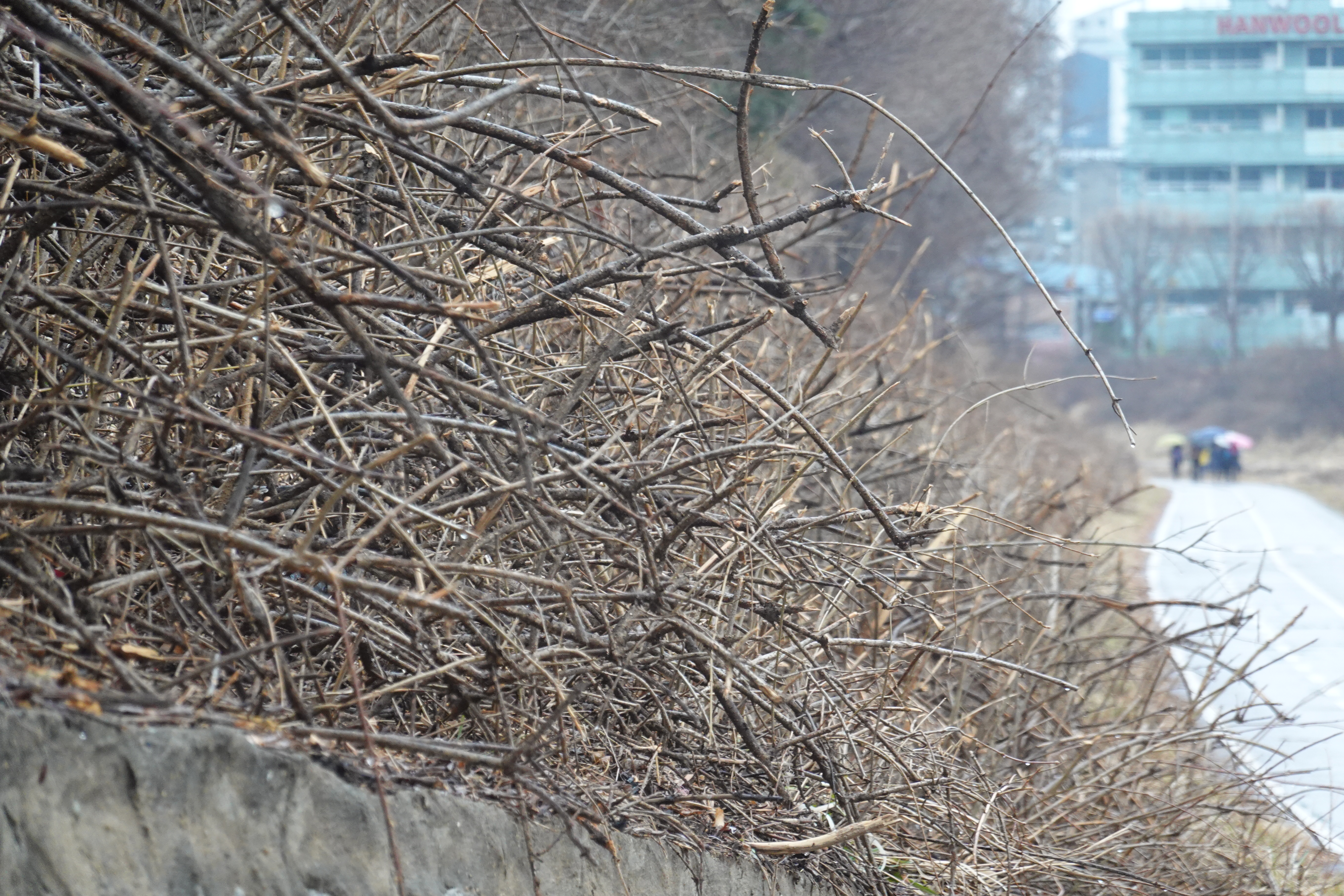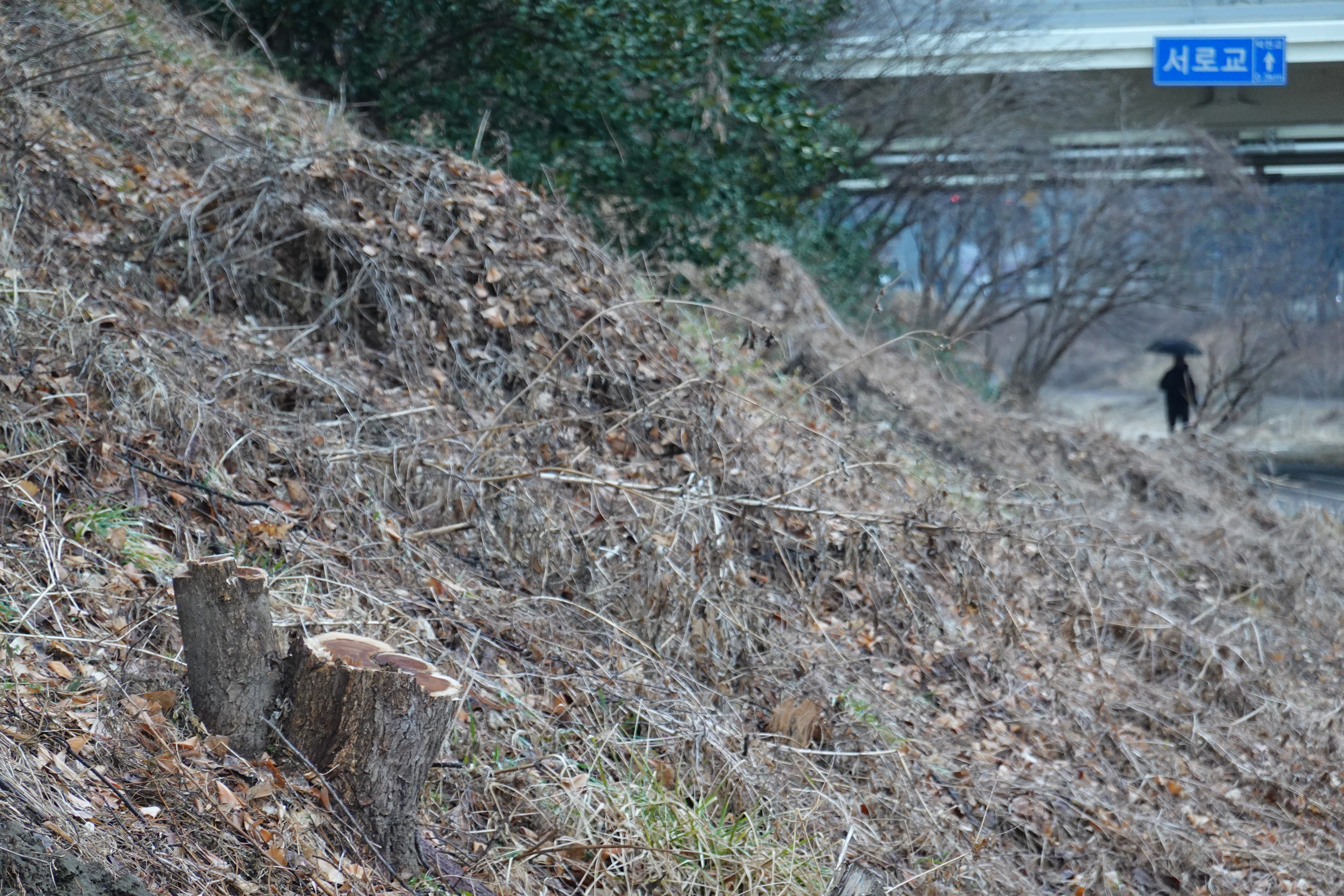 2024.02.18/ #도시기록 #안양천 #개나리군락지 #도륙/ 안양천 자전거도로.보행로 확장공사로 한동안 가보지 못했던 곳에 가보다. 쌍개울부터 명학대교까지의 왕복 마실길. 명학대교 세월교를 횡단해 돌아오던 길에 본 천변 풍경은 그야말로 처참했다. 예상은 했지만 천변과 뚝방에서 잘 자라던 나무들, 특히 물위로 가지를 늘어트려 아름다웠던 수양버드나무까지 대부분 잘려지고 베어져 사라져 버렸다. 그런데 더 처참한 모습은 명학대교-서로교 구간 서쪽 뚝방에 심어진 개나리군락이 도륙당행다. 누군가 마치 화난 사람이 화풀이를 하듯 개나리나무 가지들을 베어버린 모습은 끔찍하기까지 하다. 참고로 개나리는 안양시를 상장하는 시화(꽃)이다. 누가 그랬을까? 누가 지시했을까? 안양시장을 비롯 관계공무원, 시의원들은 현장을 본후 대책을 마련하고 관계자 또한 문책해야 하지 않을까 싶다.