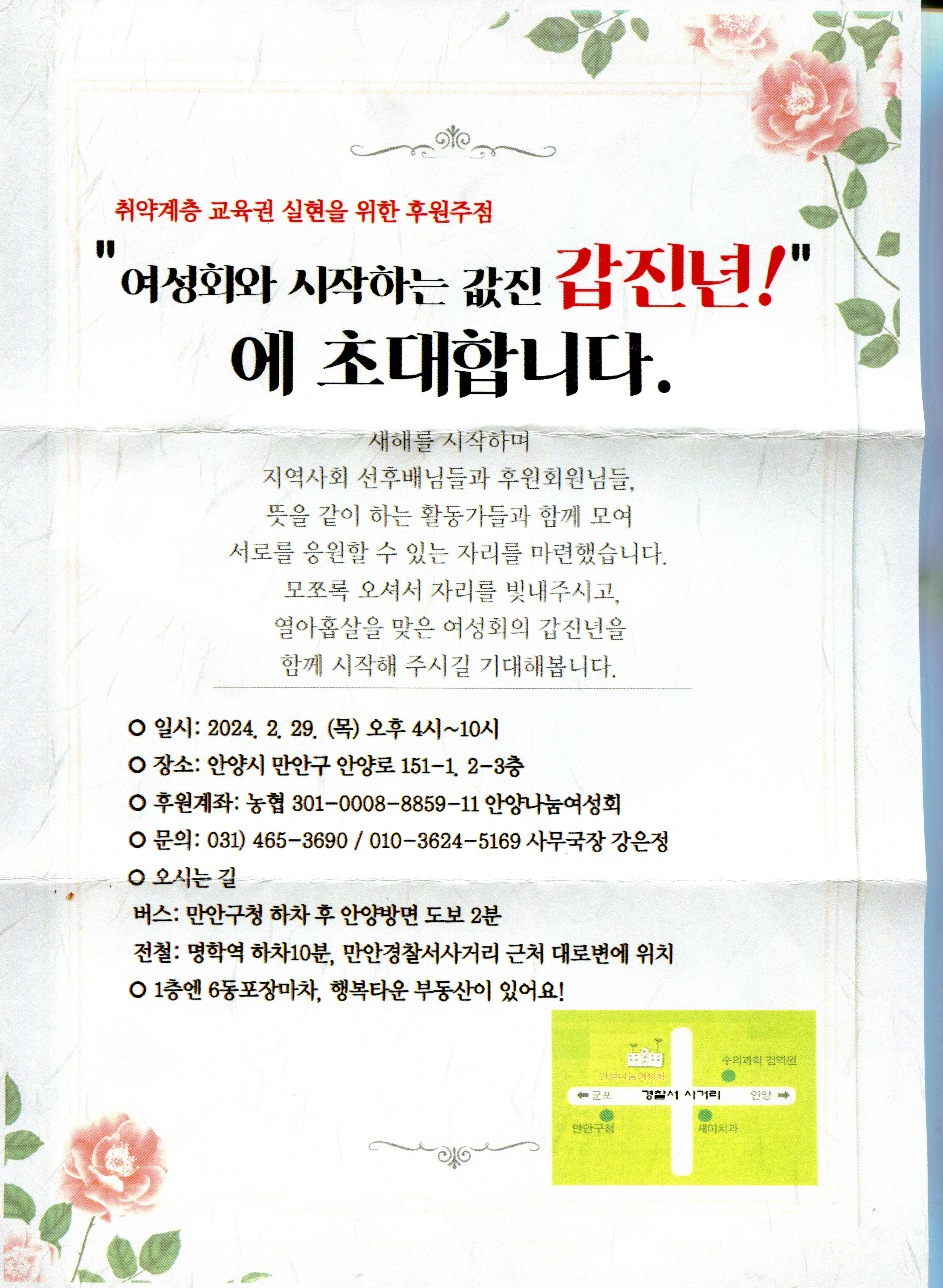 2024.02.23/ #행사안내 #후원주점 #안양나눔여성회/ 취약계층 교육권 실현을 위한 후원주점이 오는 2월 29일(목) 오후 4시-10시 안양6동 안양나눔여성회에서 열립니다. 문의:031-465-3690
