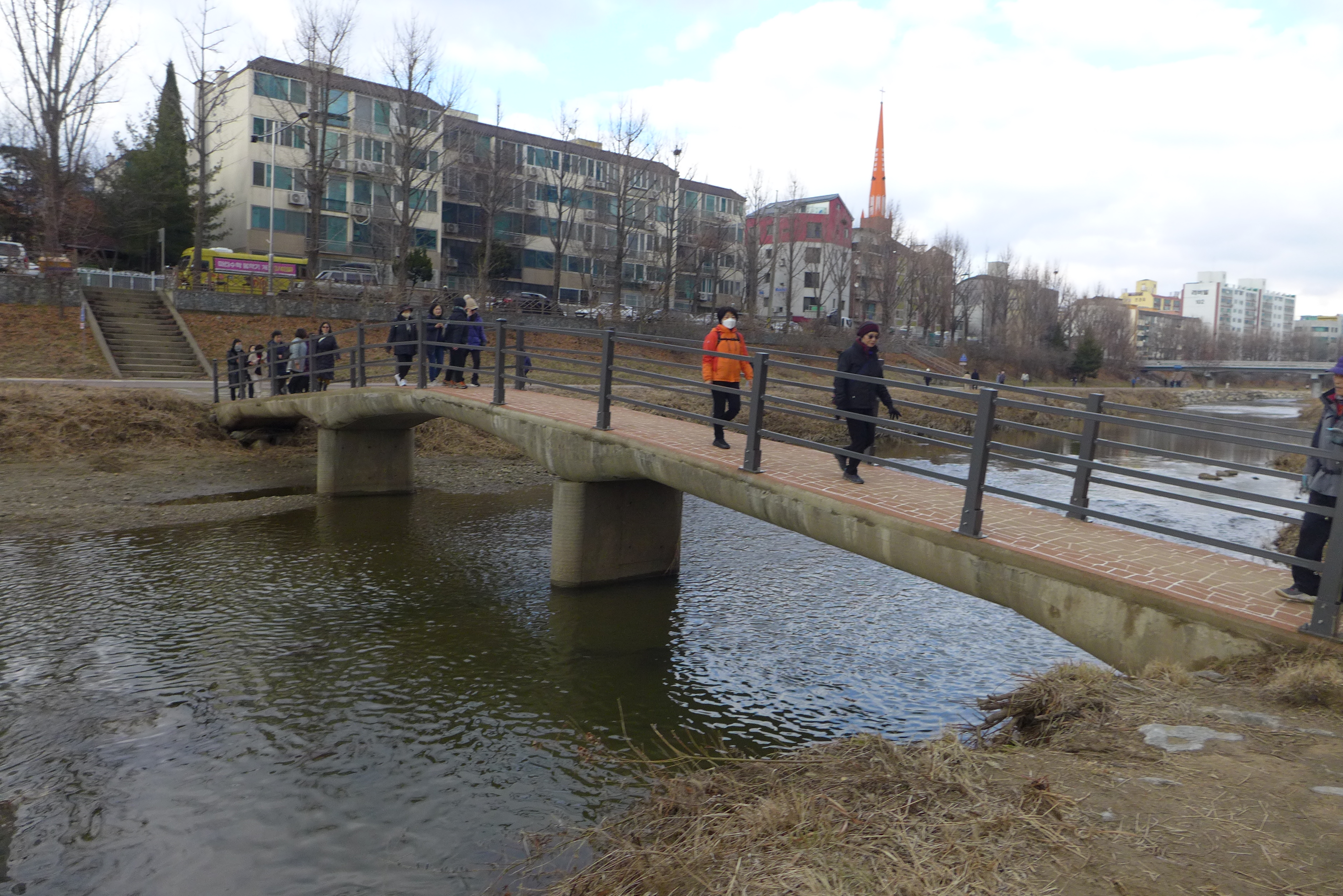 2024.02.25/ #도시기록 #돌다리 #안양 #학의천 #제인구달/ 안양 학운공원앞 학의천에 놓여진 돌다리. 침팬지의 대모라 불리우는 제인구달 박사가 2004년 한국 방문시 11월 9일 안양 학의천을 방문했을때 물고기를 방사했던 곳이다. 제인구달이 학의천을 방문한 이유는 국내 대표적인 "죽은 하천"에서 되살아나 버들치, 참게 등이 서식하고 철새까지 날아오면서 수질개선 성공 하천의 대표적 사례가 되었기에 경기도 초청으로 방문햇다. 제인 구달박사는 당시 학운공원앞 학의천을 돌아보며 수질개선 추진과정, 생물서식지로서의 하천 상태 등을 확인하고 환경단체 회원 및 초등학생들과 환경의 중요성, 환경보호 방안 등에 대해 이야기를 나누고 사진속 돌다리에서 하천에 물고기도 방류했다. 제인구달 박사가 안양을 다녀갔는지 조차 모르는 현실에 저 돌다리를 제안구달 방문지 표지석을 겸해 "제인구달 돌다리"라 부르자 제안한다.