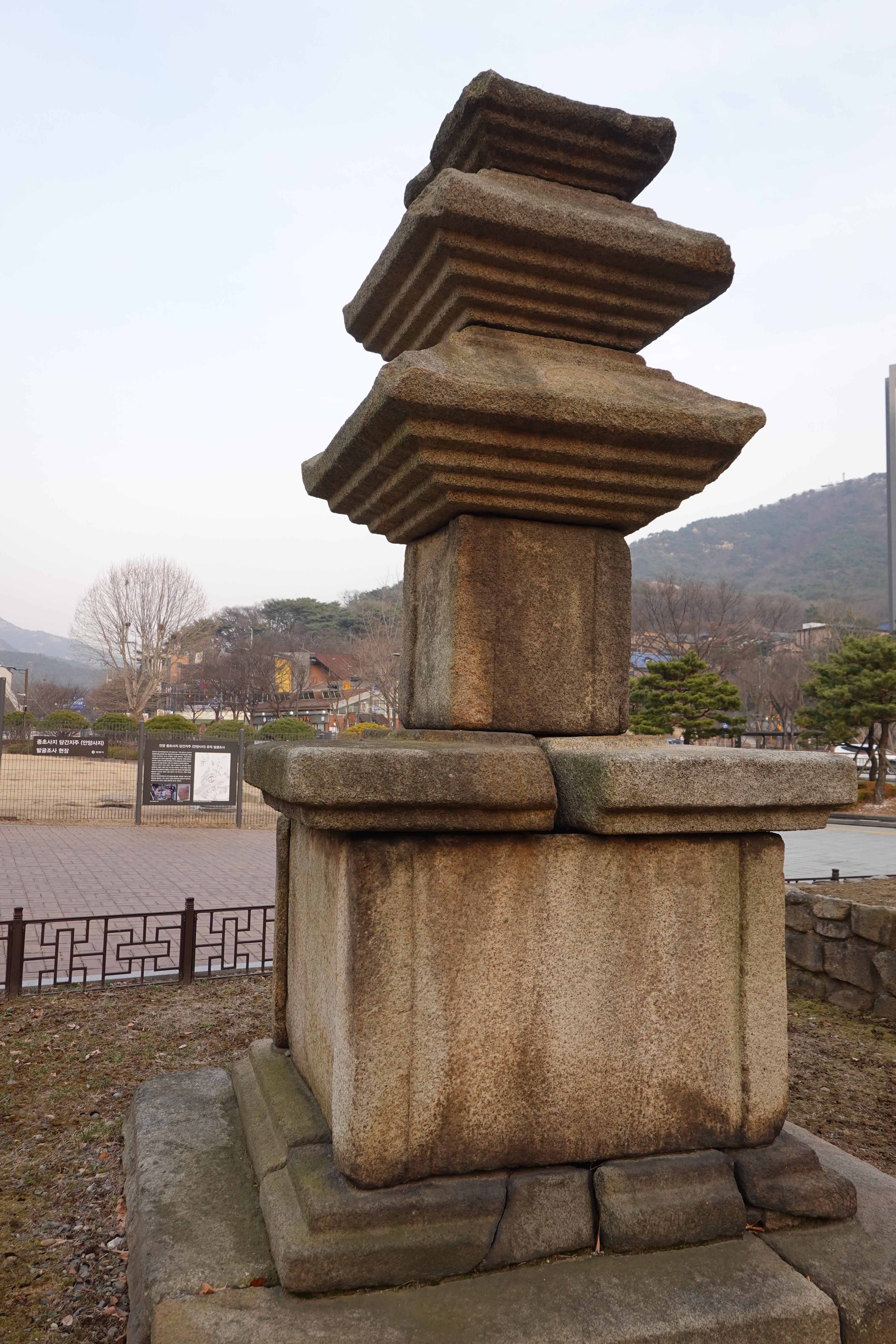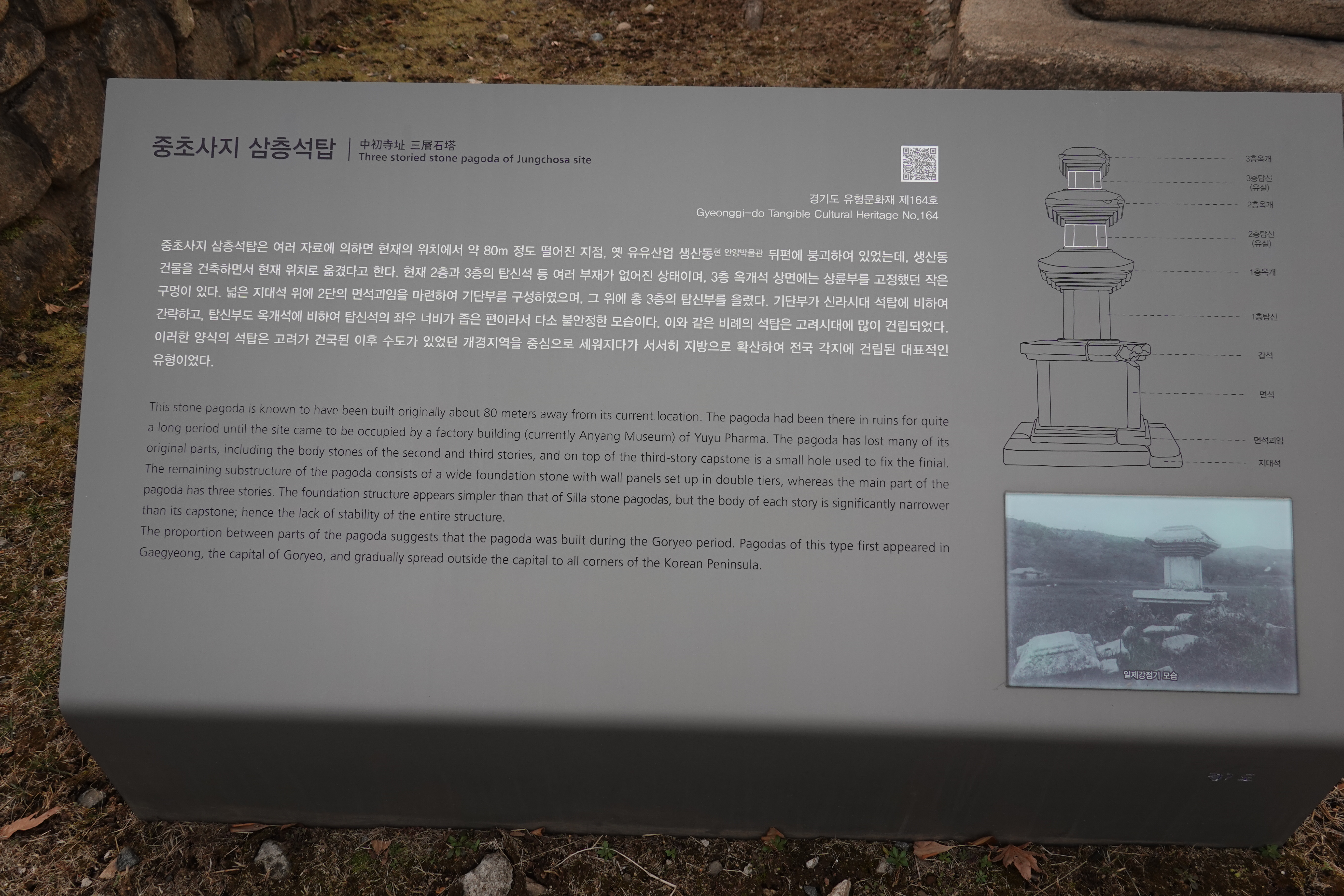 2024.03.04/ #도시기록 #문화재 #중초사지삼층석탑 #안양 #보물/ 안양예술공원 안양박물관(중초사.안양사터) 정문옆에서 만나는 중초사지 삼층석탑 국가 보물 제호 중초사지 당간지주 옆에 자리한 이 석탑은 고려 때 것으로 추정되는 삼층석인데 2.3층 탑신이 없어 한눈에 보아도 균형이 맞질 않는 모양새다. 이 석탑은 현재 있는 곳에서 동북쪽 80미터 지점(안양박물관 건물 동쪽 끝자락) 에 도굴된 채 무너져 있던 것을 이곳으로 옮겨 세운 것으로 일제 강점기에 이어 광복후 우리 정부도 보물 제5호로 지정했다가 1997년에 재평가가 이루어져 경기유형문화재 제164호로 격하되었지요. 이에 현재 국가문화제 보물 제5호는 영구 결번으로 비어 있다.