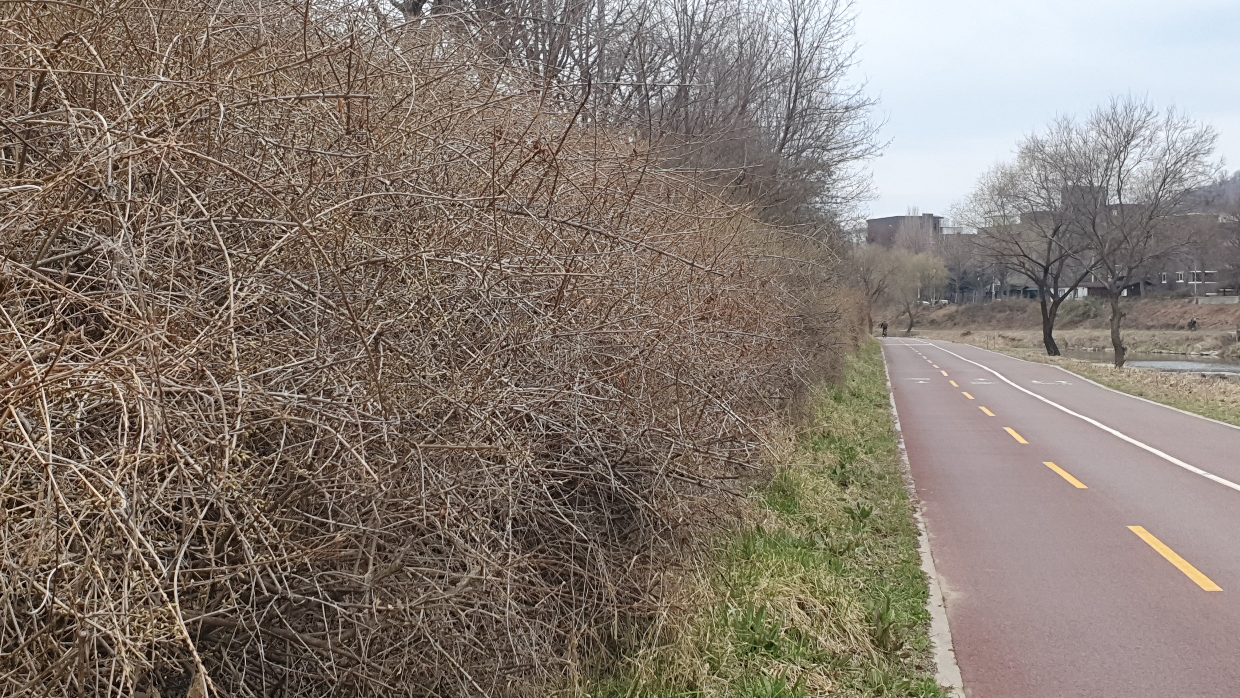 2024.03.16/ #도시기록 #봄봄봄 #개나리 #안양천 / 안양천 덕천교-명학대교 구간 동쪽 산책로 뚝방에 노란 개나리가 모습을 보이기 시작했다. 하지만 안타깝게도 반대편인 안양천 서쪽 산책로(명학대교-덕천교 구간) 뚝방의 개나리 군락지를 나무 밑둥까지 베어버려 앞으로 수년간 예쁜 모습을 보기 어려울듯 싶다. 개나리꽃은 안양시를 대표하는 시화(꽃)다. 안양시장은 안양시를 상징하는 개나리 군락지를 베도록 지시하고 관련있는 관계공무원을 문책하고 대책을 마련하라!!!