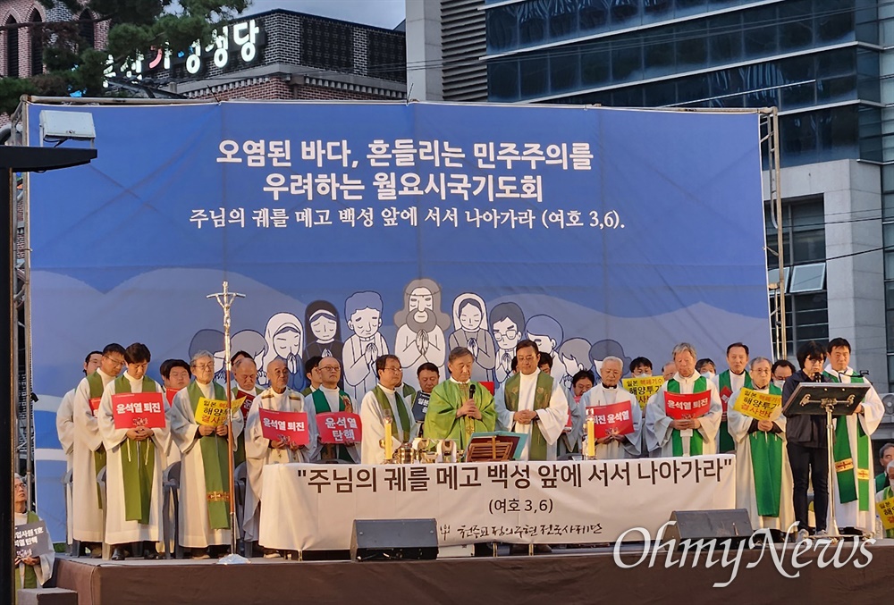천주교정의구현사제단이 지난해 3월 20일 전주 풍남문광장에서 <친일매국 검찰독재 윤석열 퇴진과 민주주의 회복을 위한 미사>를 시작으로 진행된 제1차 월요시국기도회는 전국 모든 교구에서 17회 열렸다. 2차 시국기도회는 10월 9일부터 <오염된 바다, 흔들리는 민주주의 월요시국기도회>를 지향으로 부산, 서울, 전주, 수원, 의정부, 마산, 인천, 광주, 전주에서 10회 열렸다. 이제 안양에서 제2기 월요시국시도회를 마무리 하는 마지막 미사가 열리는 것이다.